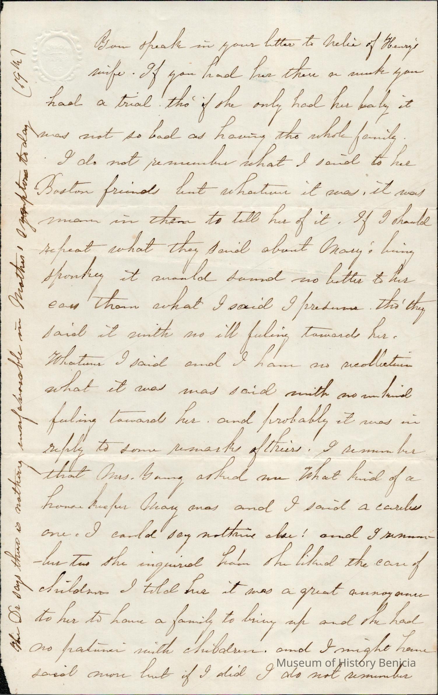 At one point she talks of Henry naming "the baby" after her. Henry and Mary had a child, Lucy Wetmore (06/1859 - 1918) in June of 1859 and this must be the child being talked about.