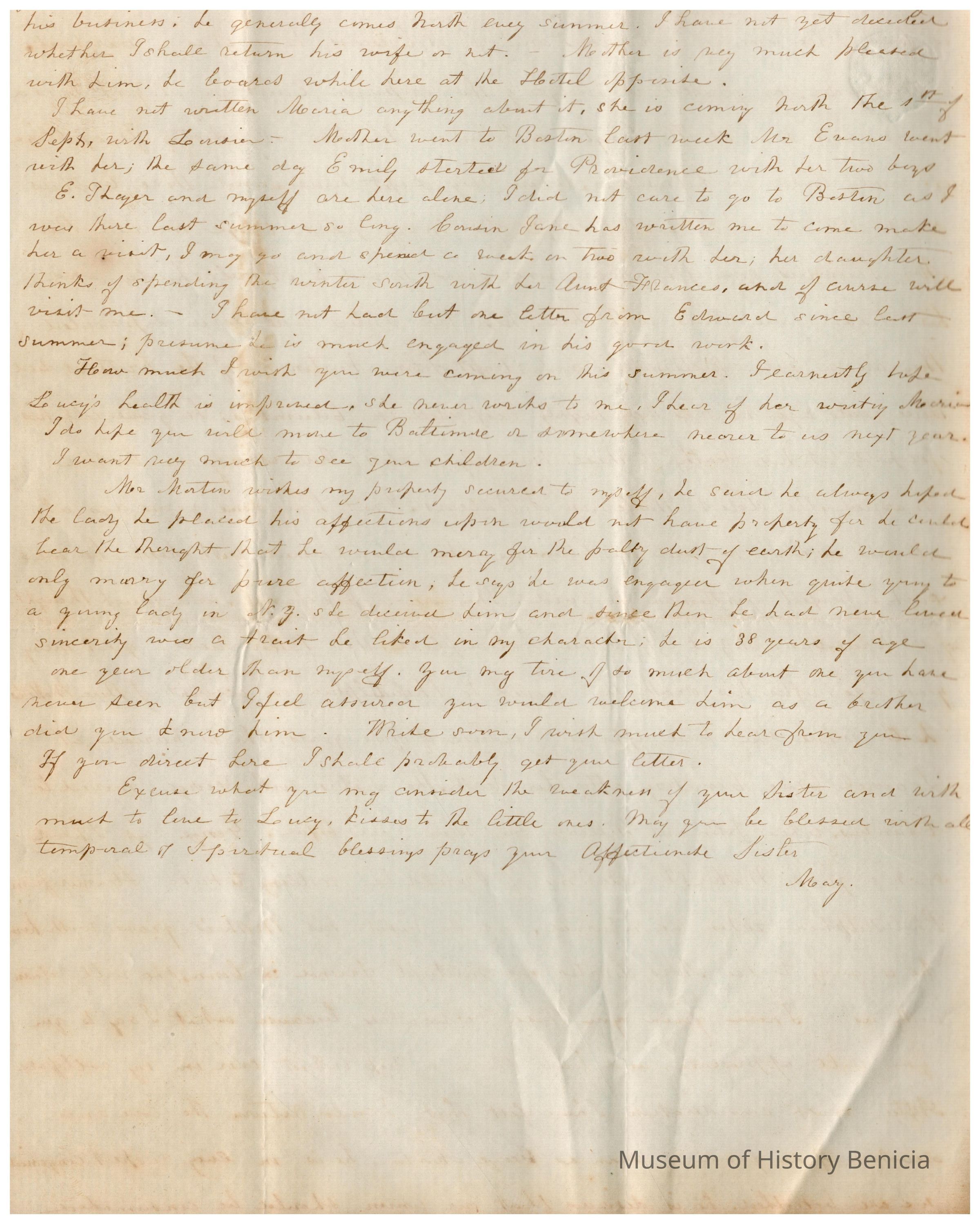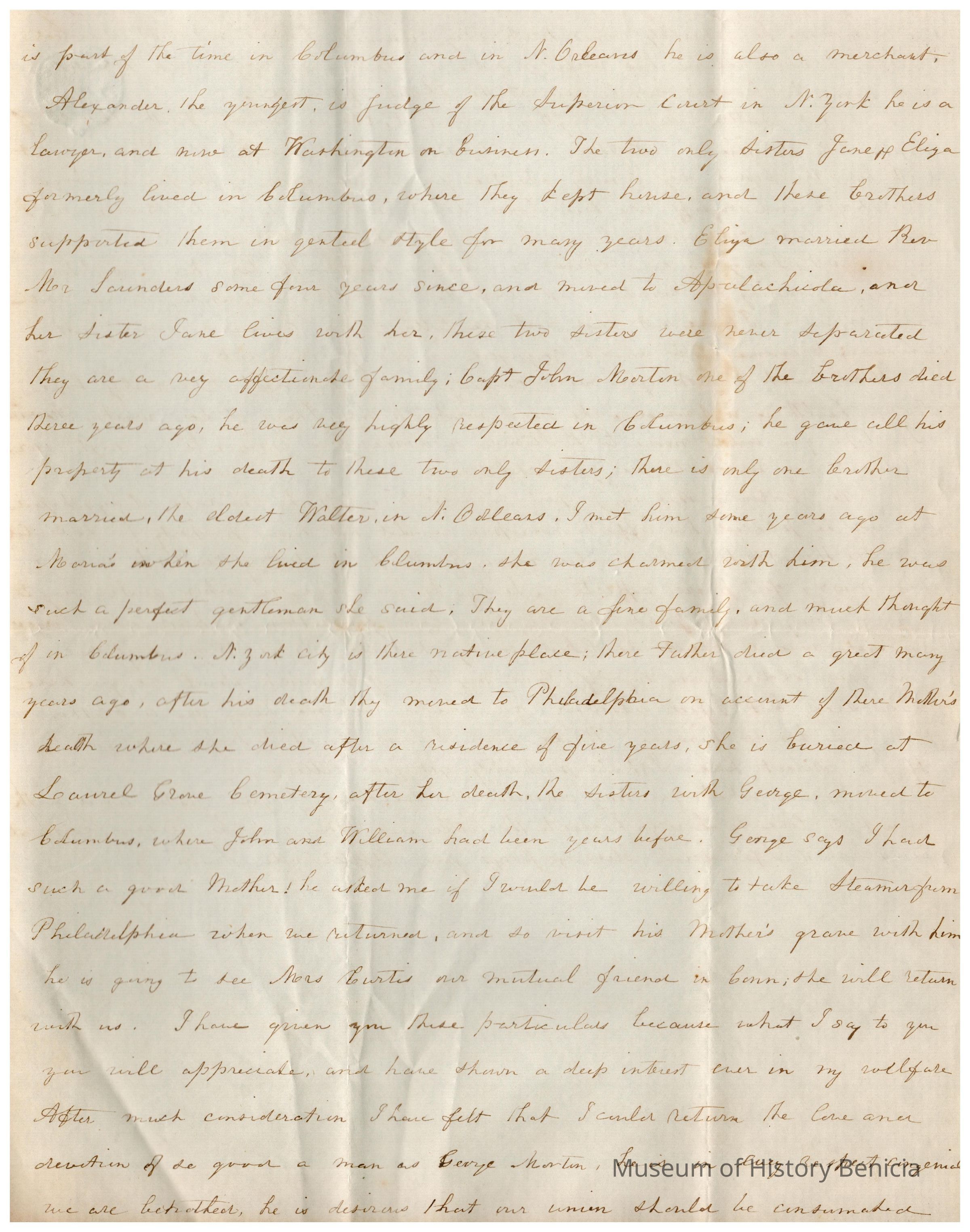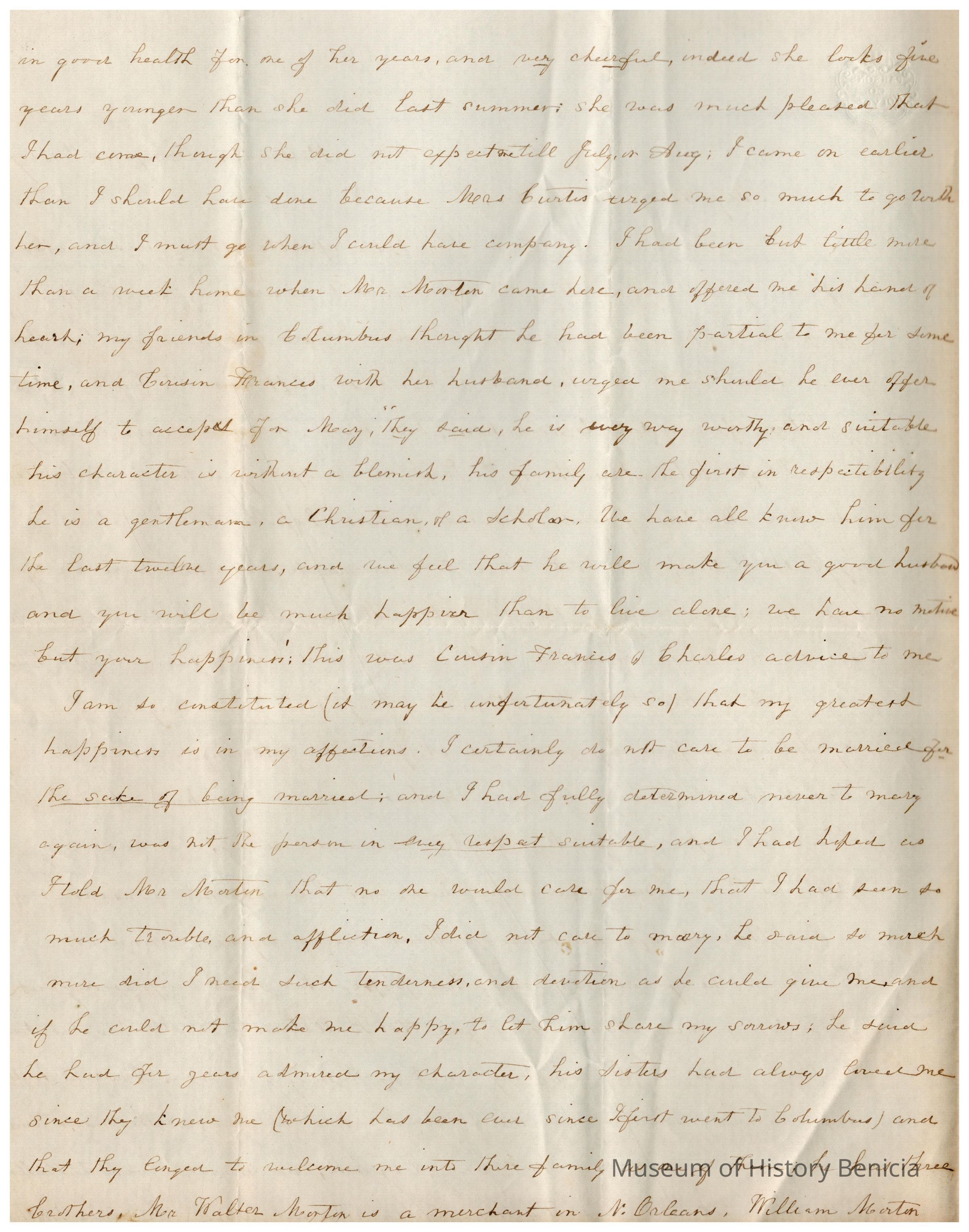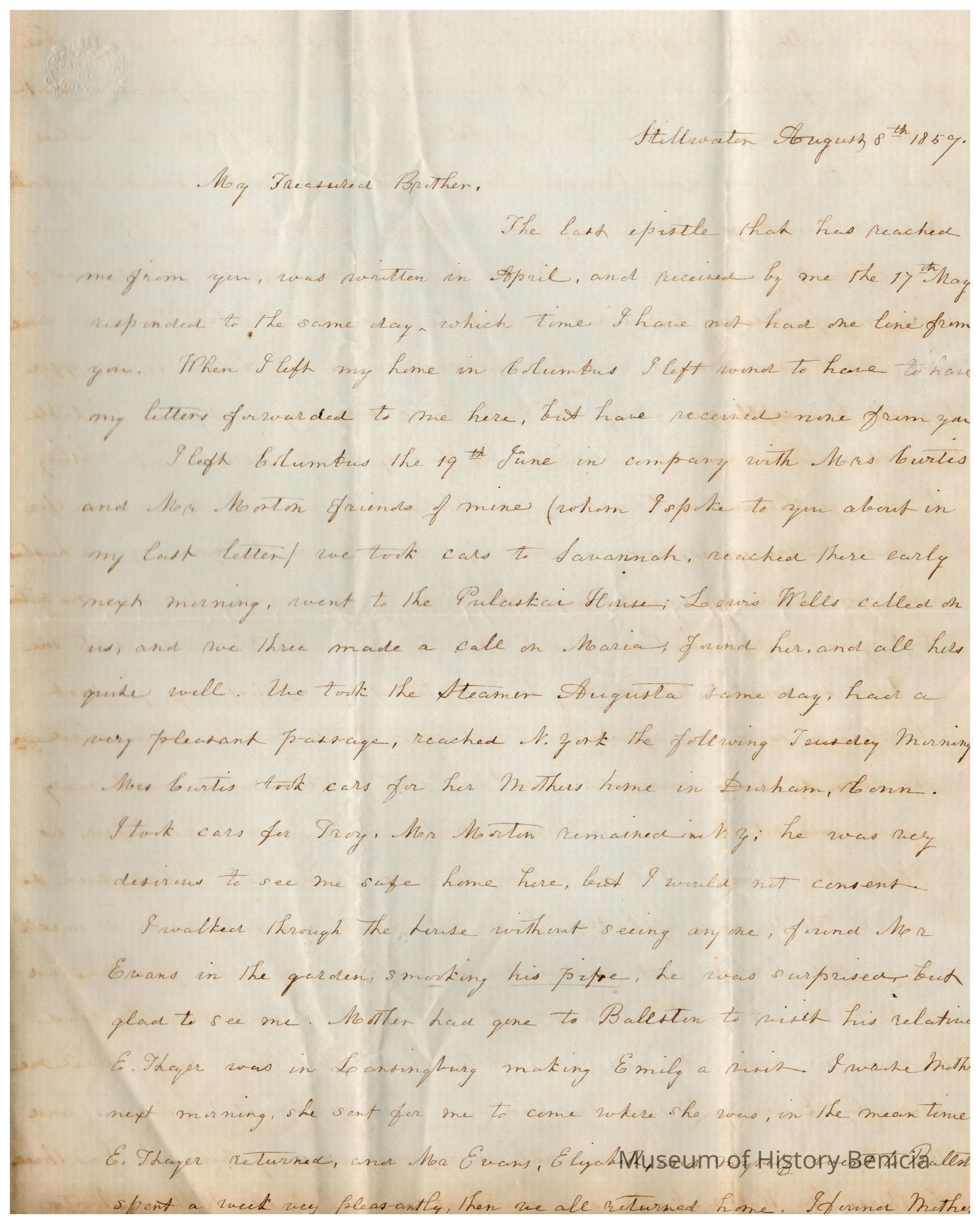 This is a letter to Samuel C Gray from his sister Mary dated 08/08/1859. The letter contains information aout her travels North and mentions many family members and friends especially her Mother Joanna Evans. She describes why she married George S Morton, her second husband, and the kind of man he is and what he means to her.Collection
