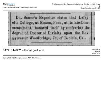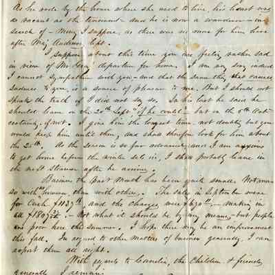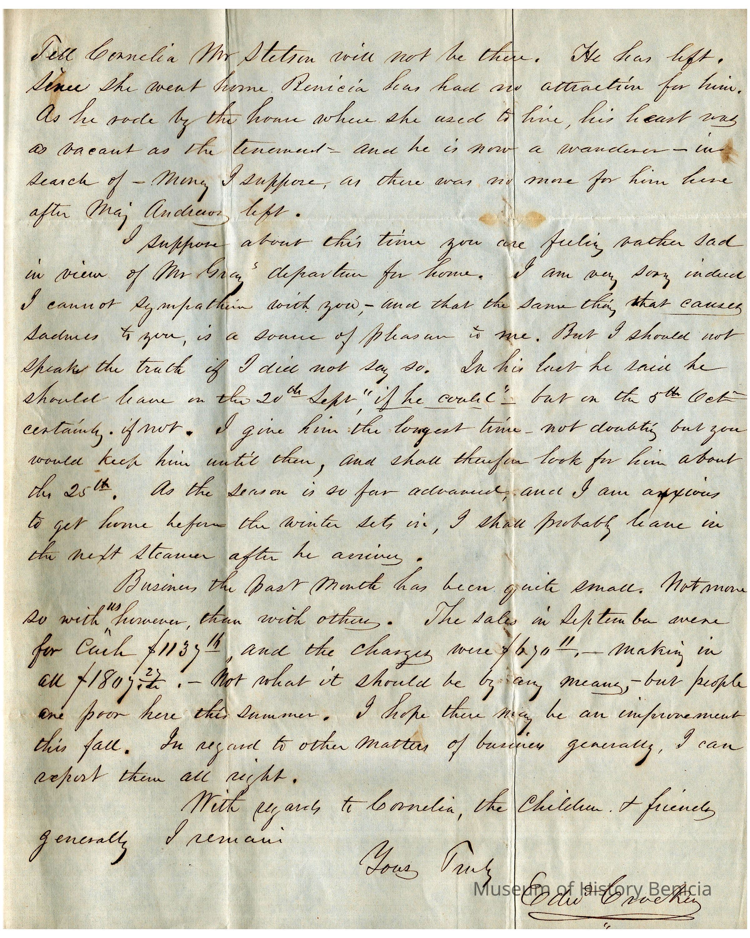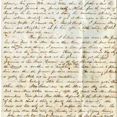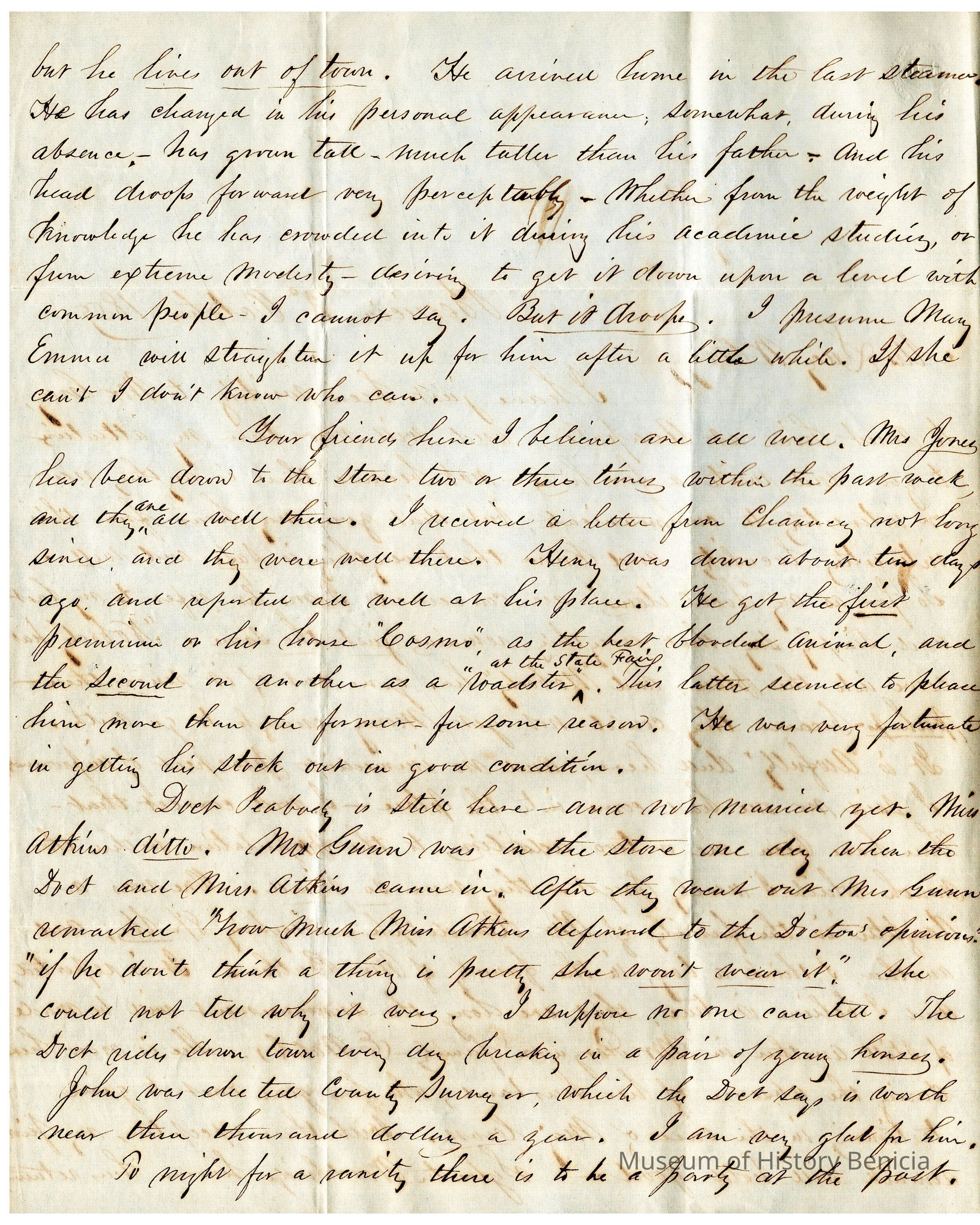 Mr. Crocker mentions the return of Rev. Woodbridge's son, Sylvester Woodbridge Jr., from his schooling in the East. He notes several mutual friends and/or relations that have been in the store. He alludes to a possible romantic connection between Dr. Peabody and Miss Atkins.Collection