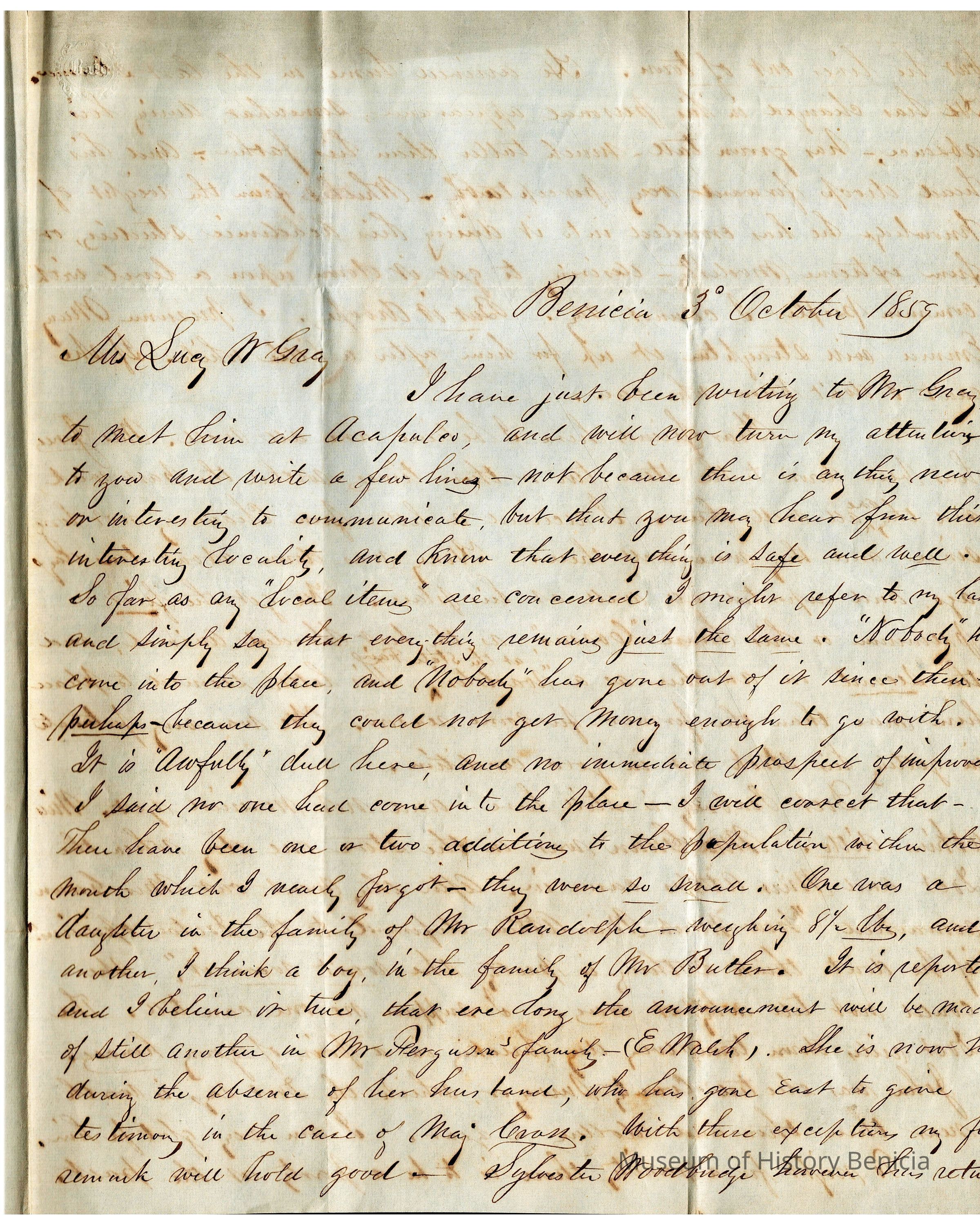 This is a letter from Edward Crocker in Benicia to Mrs. Lucy Gray traveling, dated 10/03/1859. Mr. Crocker writes how dull Benicia has been but then remembers to mention that the Randolph and Butler families have each had a newborn in the last month and rumor has it that the Fergusson family is expecting soon.