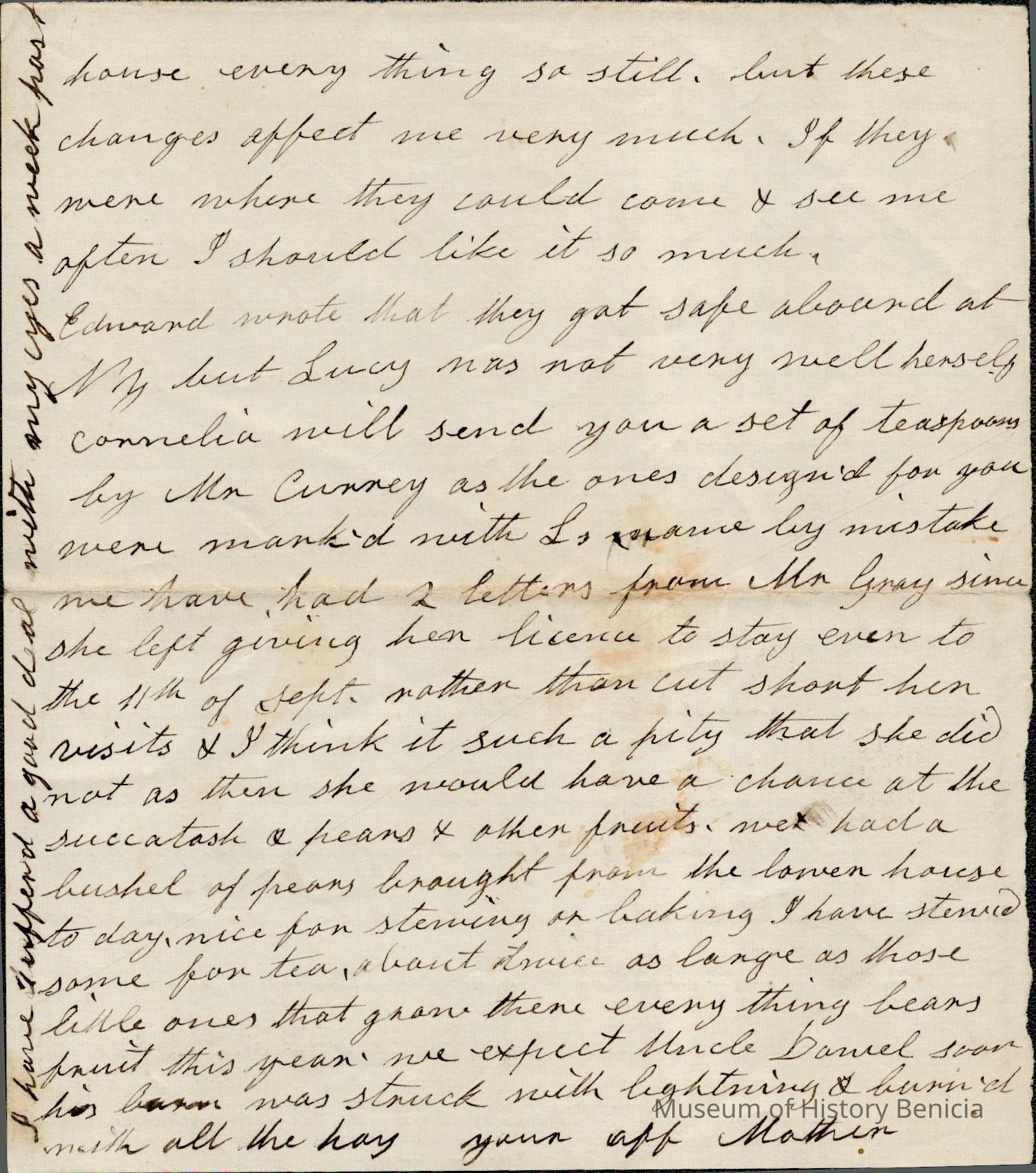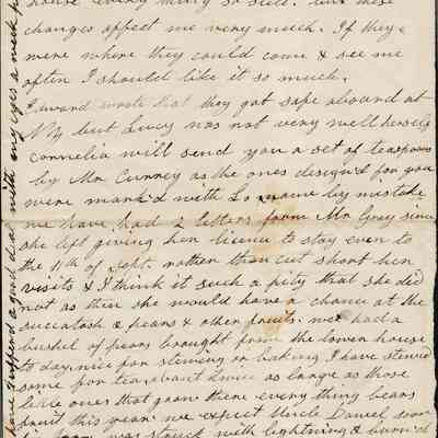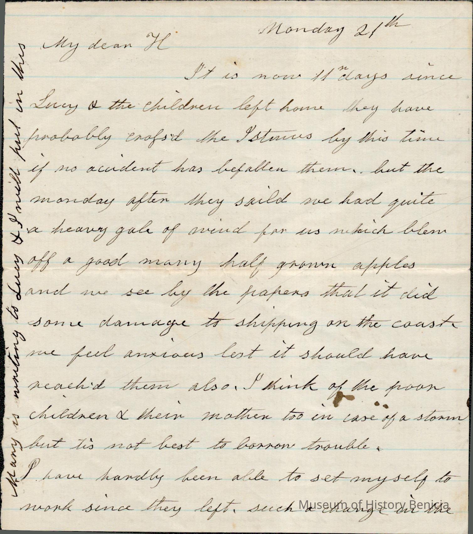 This is a letter undated to Harriet Wetmore Jones from her mother Rebecca Wetmore regarding family matters. The first thing Rebecca mentions is that Lucy and the children recently left for California. Lucy visited the East Coast in Spring to Fall of 1859. This letter was probably written that year.