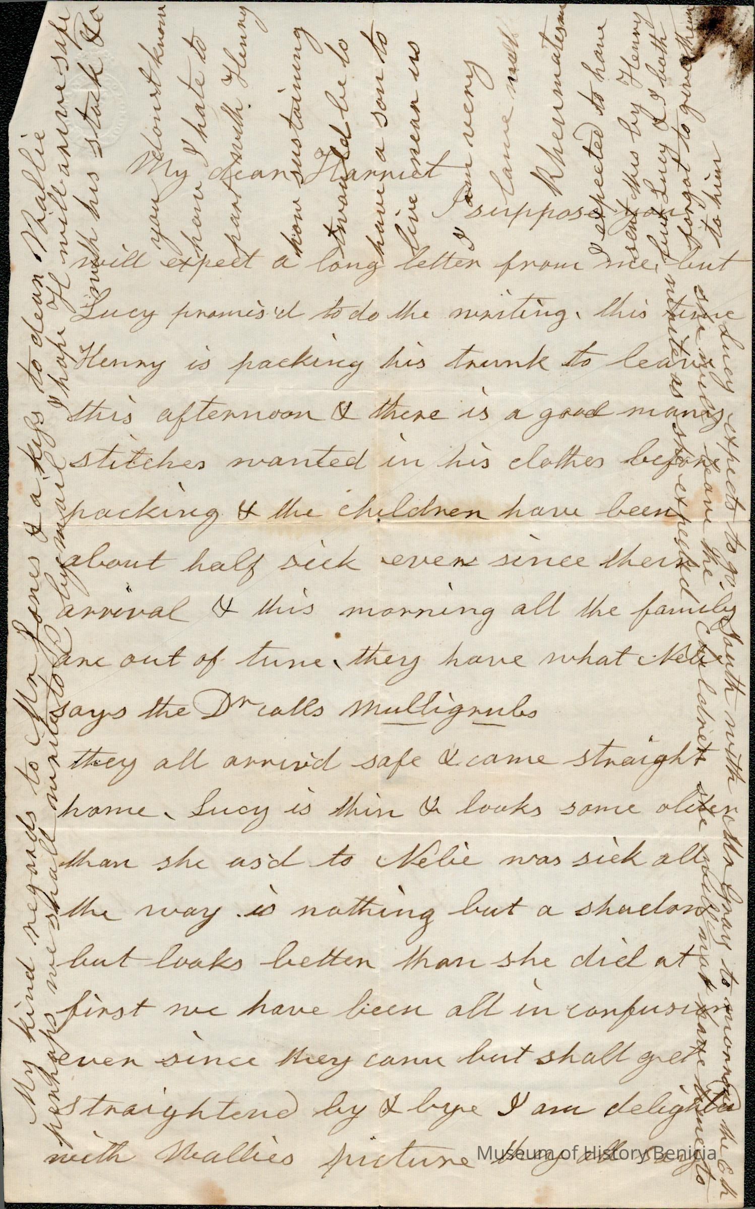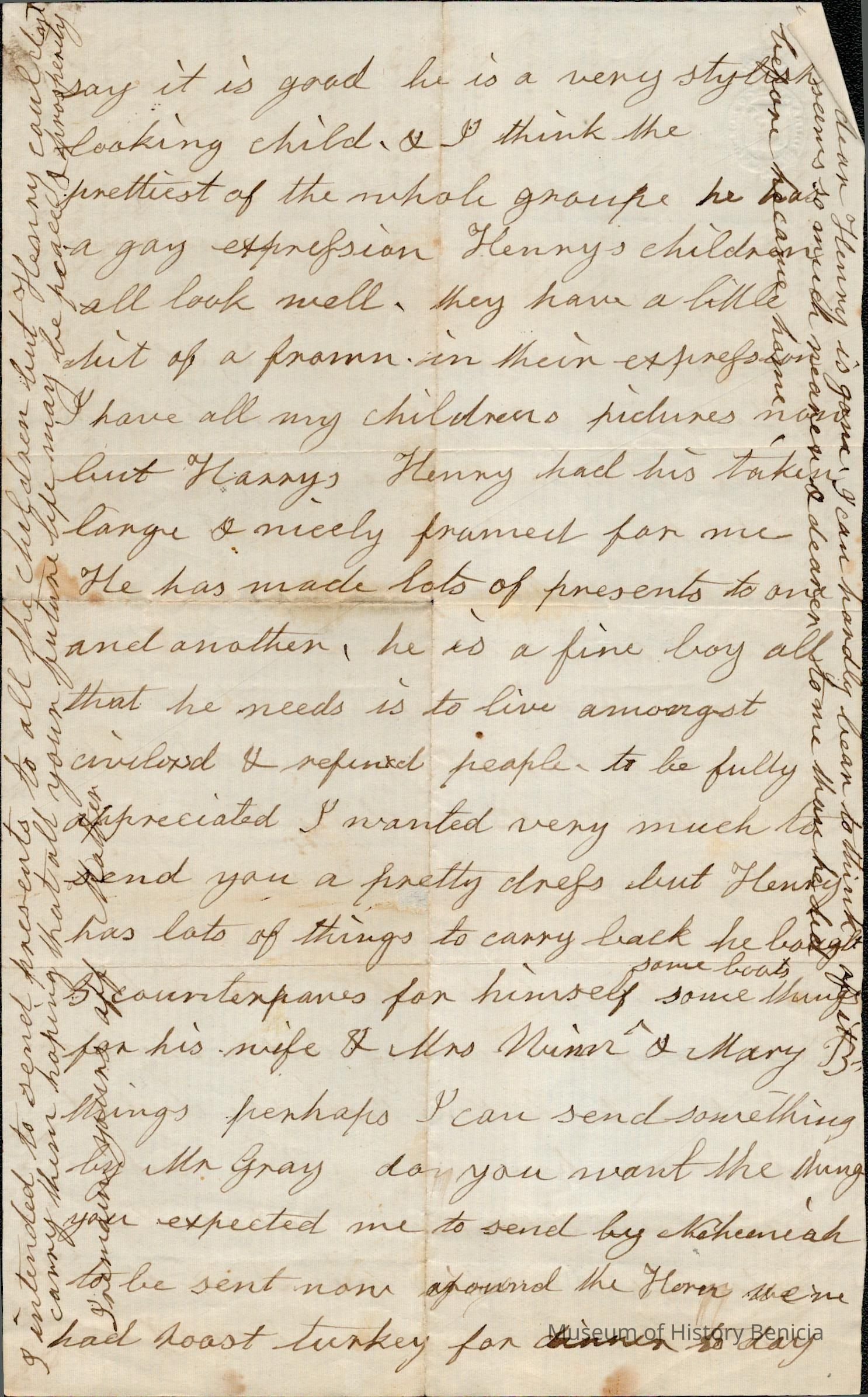 This is a letter, undated, to Harriet Wetmore Jones from her mother Rebecca Wetmore regarding family matters. She mainly talks about her son Henry Wetmore and the fact that he is leaving. She wanted to send gifts to Harriet's children in California by Henry but says he can't take them along with his "stock". She also mentions Lucy being there and her plans. A previous letter dated 05/05/1859 from Samuel Gray talks about Henry trying to bring sheep and horses back to California and the problems he will have. I assume this letter was written about that same time since both Henry Wetmore and Samuel Gray are in the East and it mentions "stock" that Henry is bringing home.