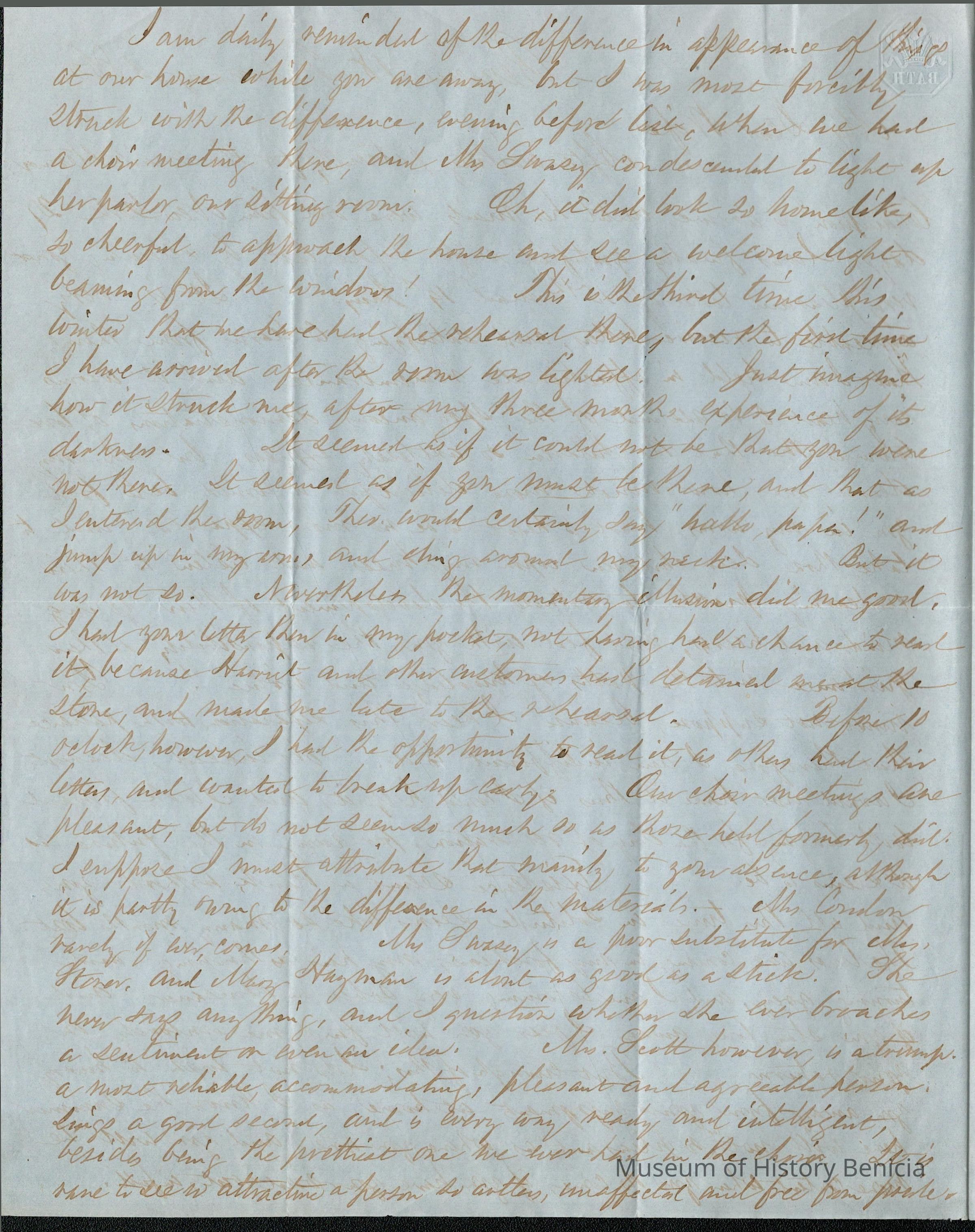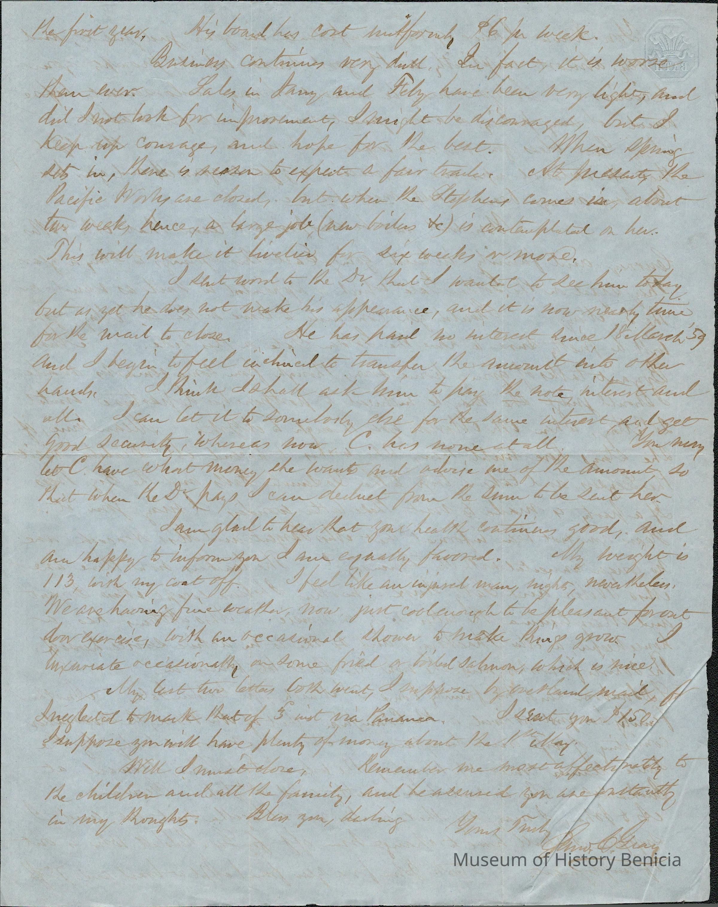 This is a letter from Samuel C Gray to his wife Lucy Wetmore Gray when she was visiting on the East Coast.