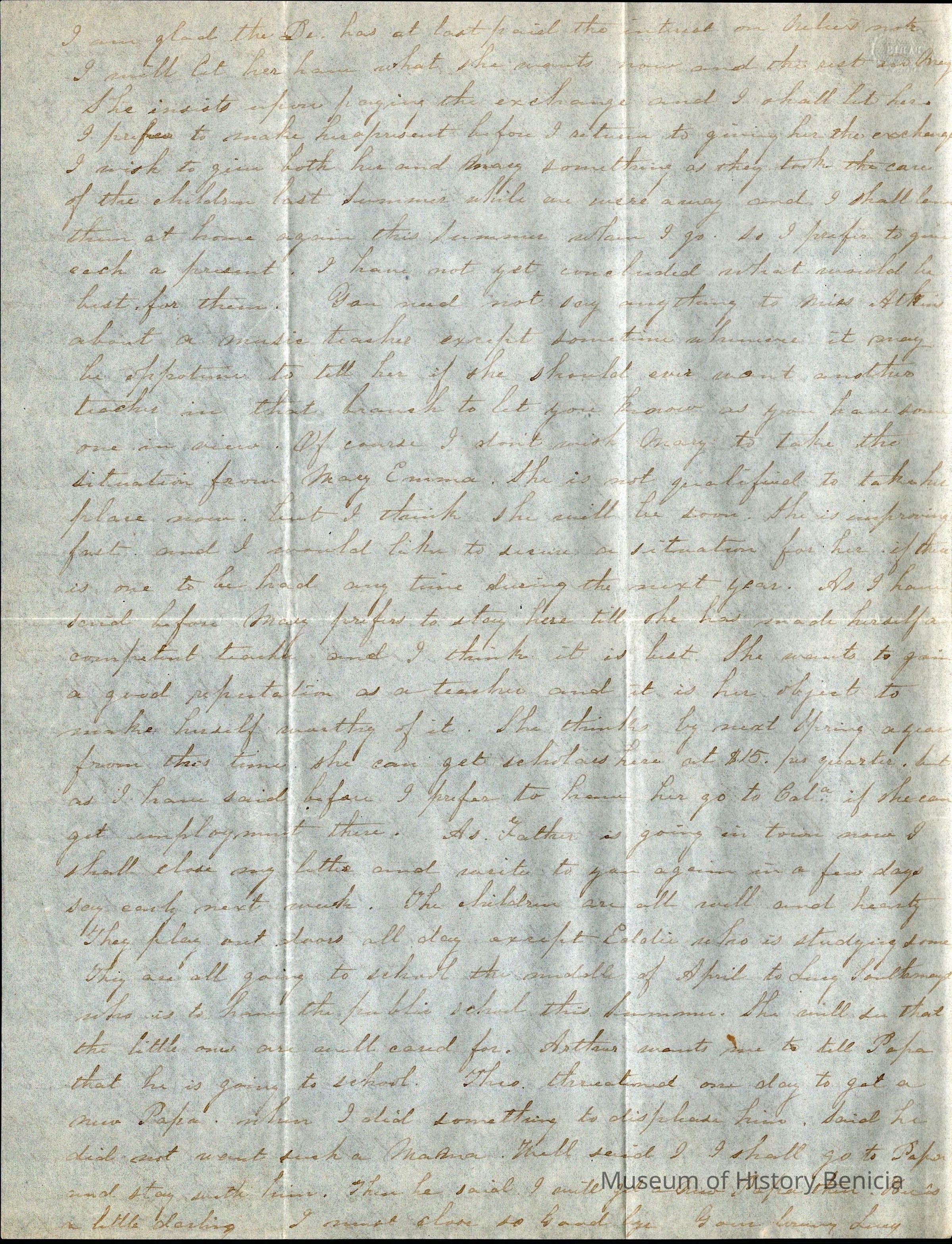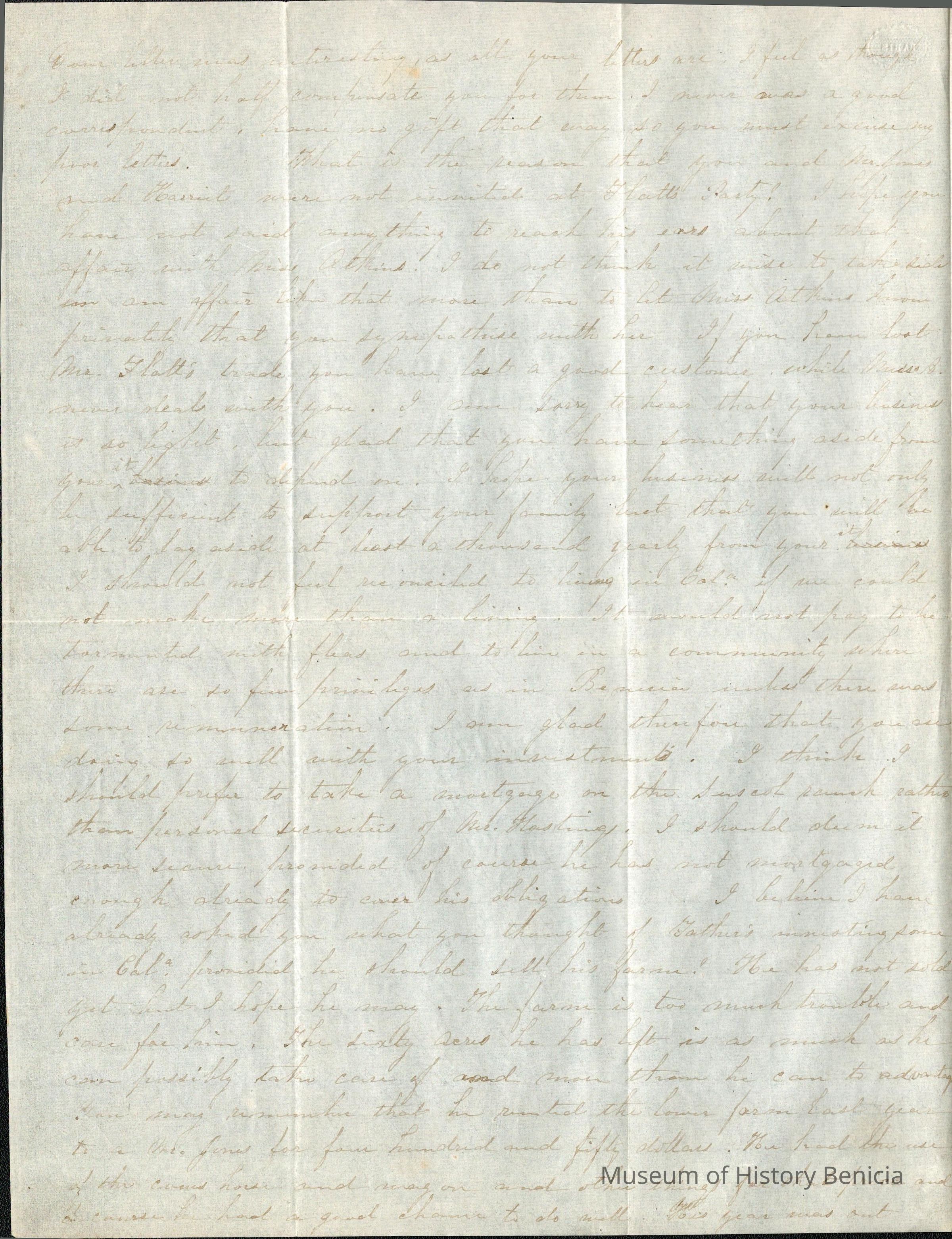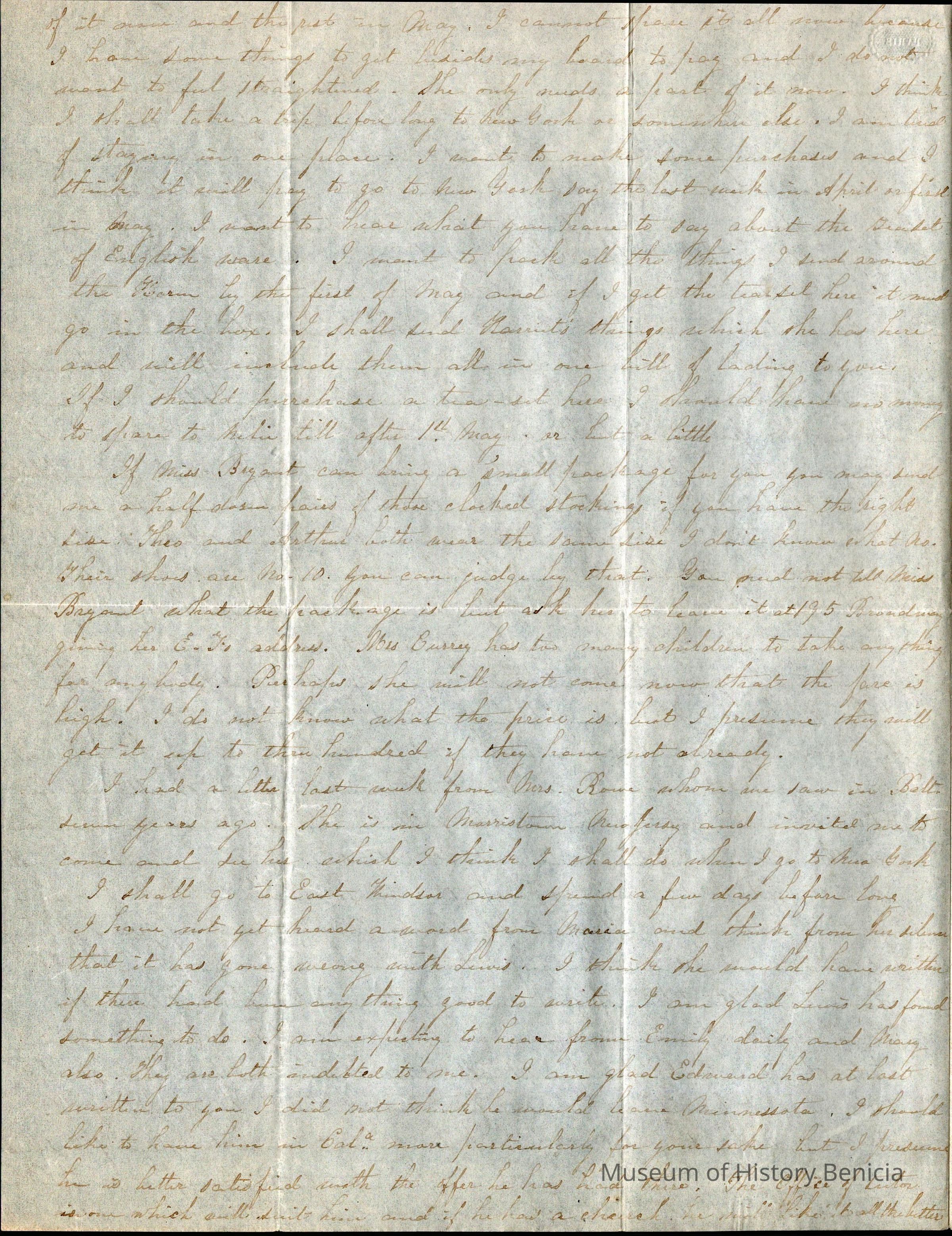 This is a letter from Lucy Wetmore Gray on the East Coast to her husband Samuel C Gray in Benicia.