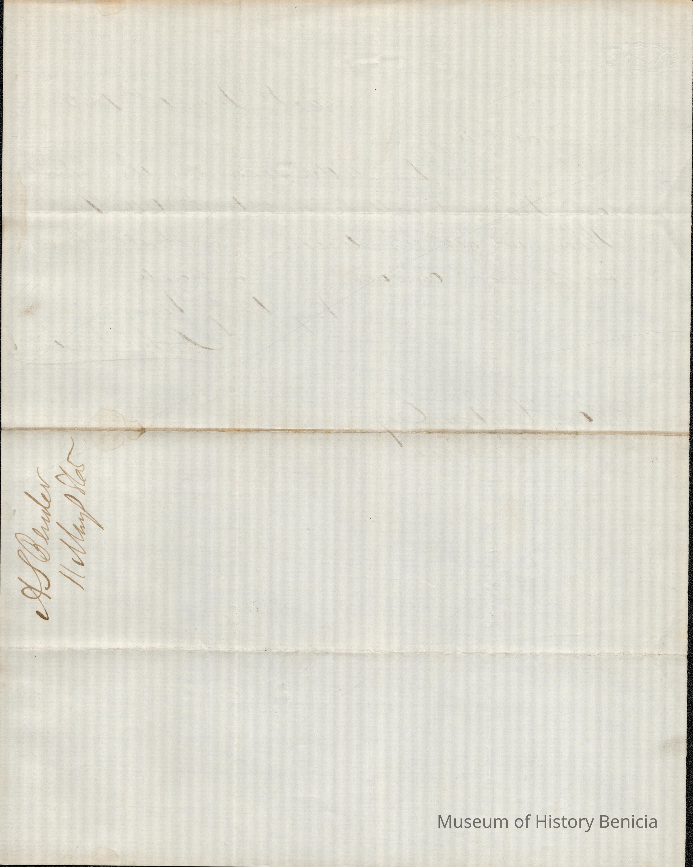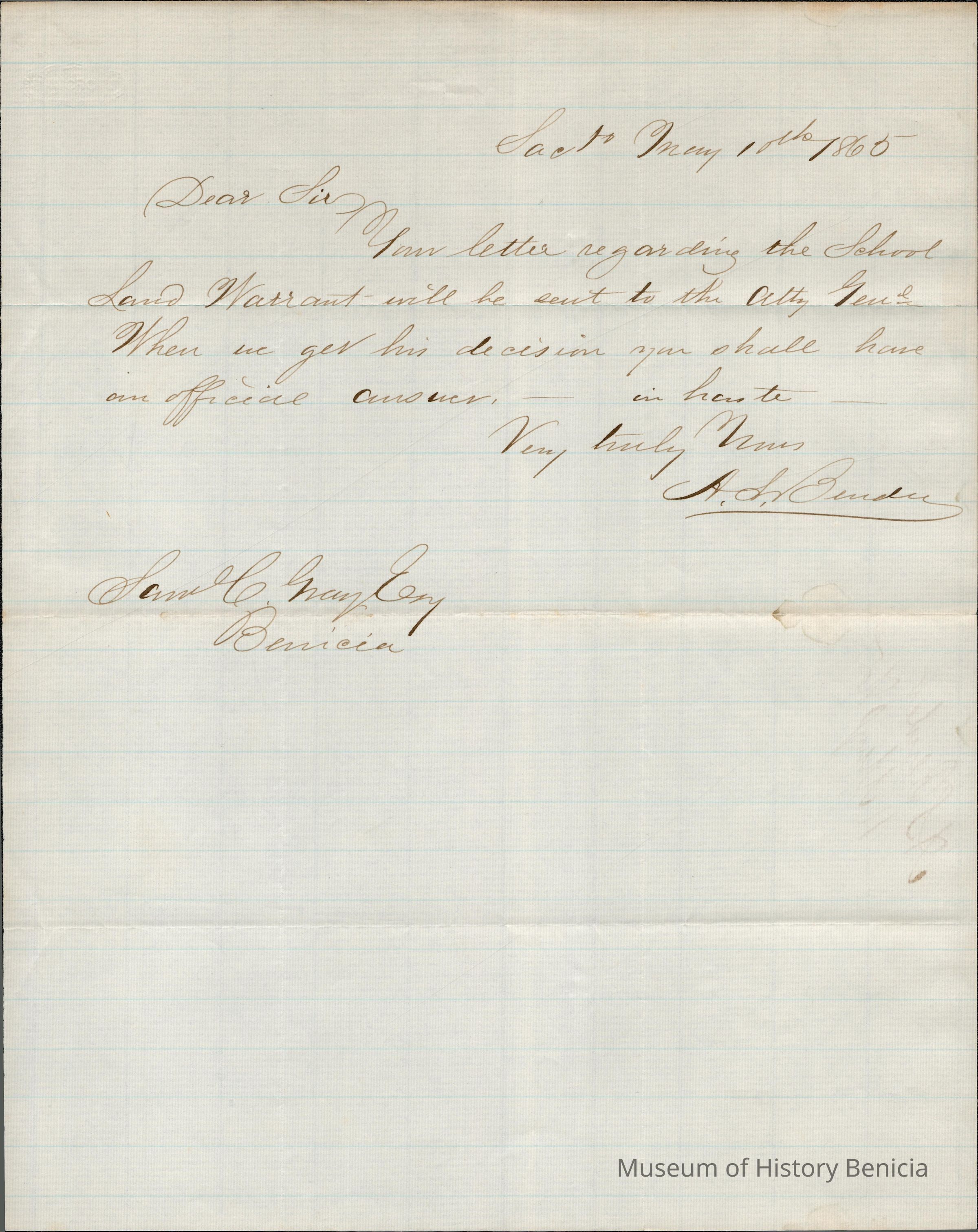 The image shows a handwritten letter dated May 11th, 1865, addressed to Mr. Samuel C. Gray in Benicia. The letter discusses Mr. Gray's correspondence regarding a school land warrant, indicating that the matter will be forwarded to the Attorney General. The writer assures Mr. Gray that he will receive an official response once a decision is made. The letter is signed by A. S. Bender, who conveys urgency by noting the promptness of an impending reply. The paper is lightly lined, with the ink appearing to be brownish, likely due to aging. The handwriting exhibits the ornate, cursive style characteristic of the 19th century.