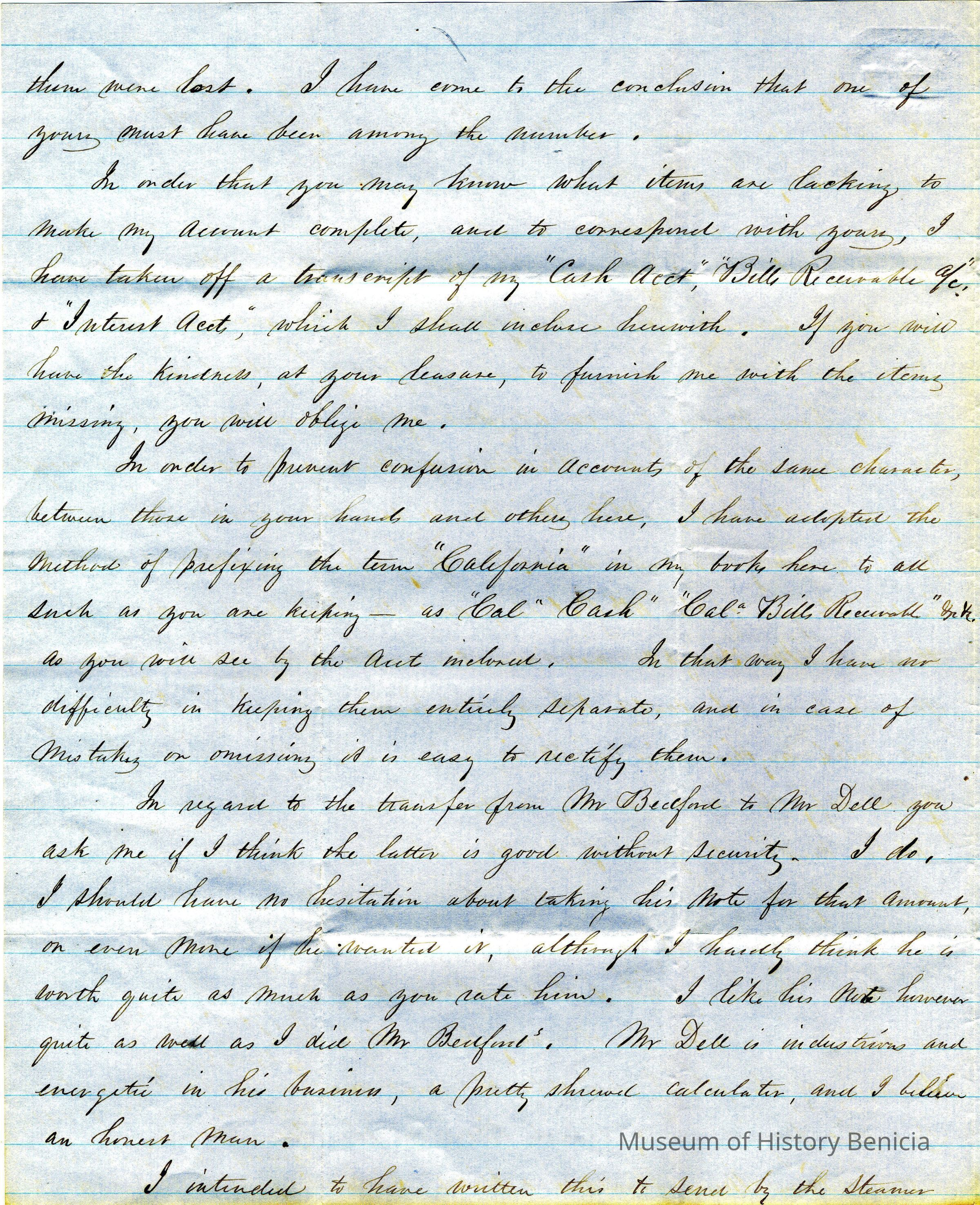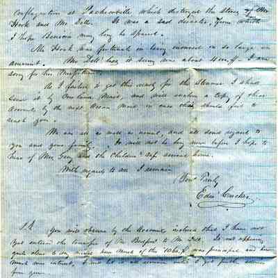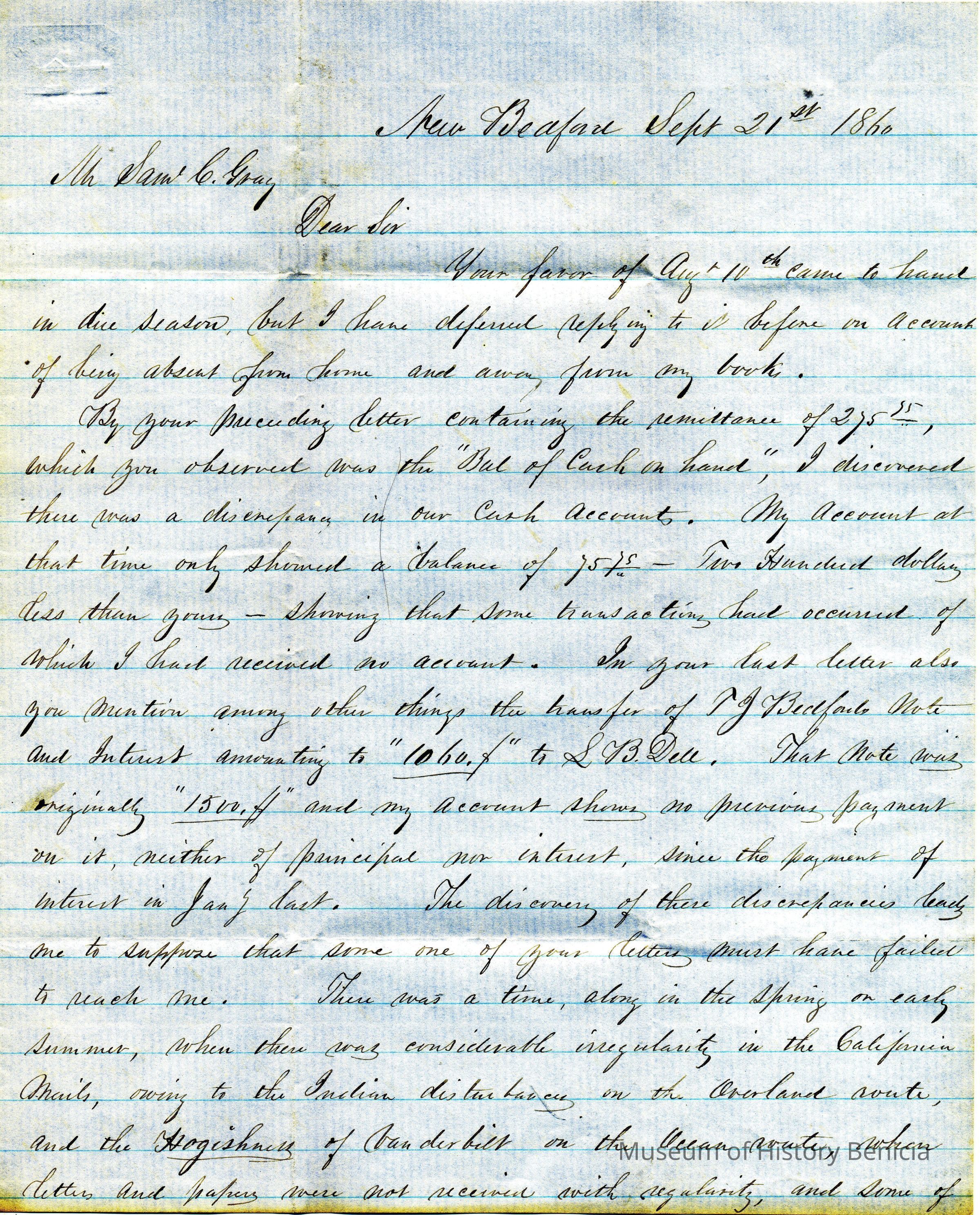 This is a letter to Samuel Gray in Benicia from Edward Crocker in New Bedford dated 09/21/1860. Mr. Crocker says there is a discrepancy in the books based on Mr. Gray's last received letter and his own figures. He suspects that he is missing a letter from Mr. Gray and suggests that there was a time recently when the mails were a little disrupted. He suggests the disruptions were due to the "Indian" disturbances and to the "Hogishness" of Vanderbilt on the ocean routes.
