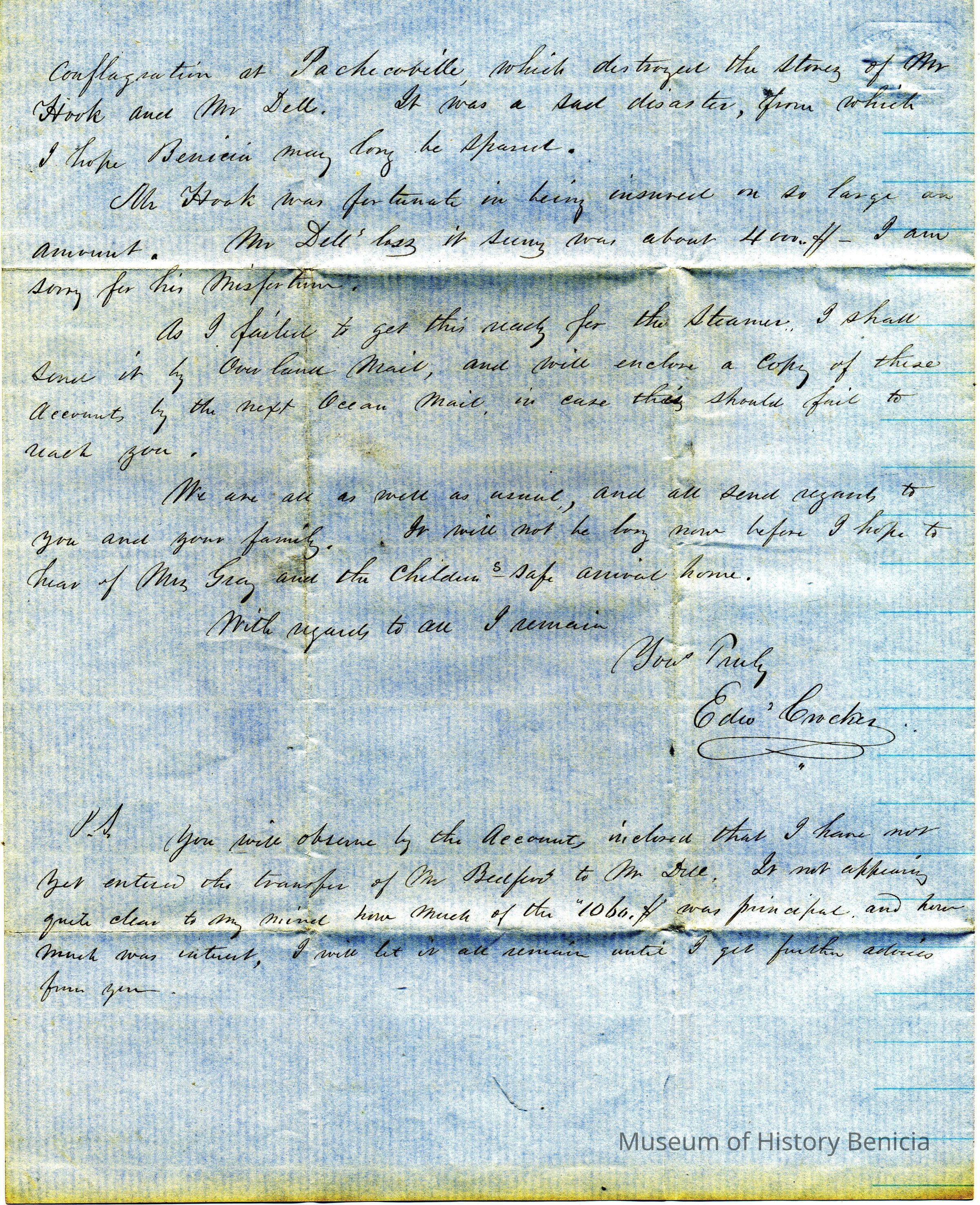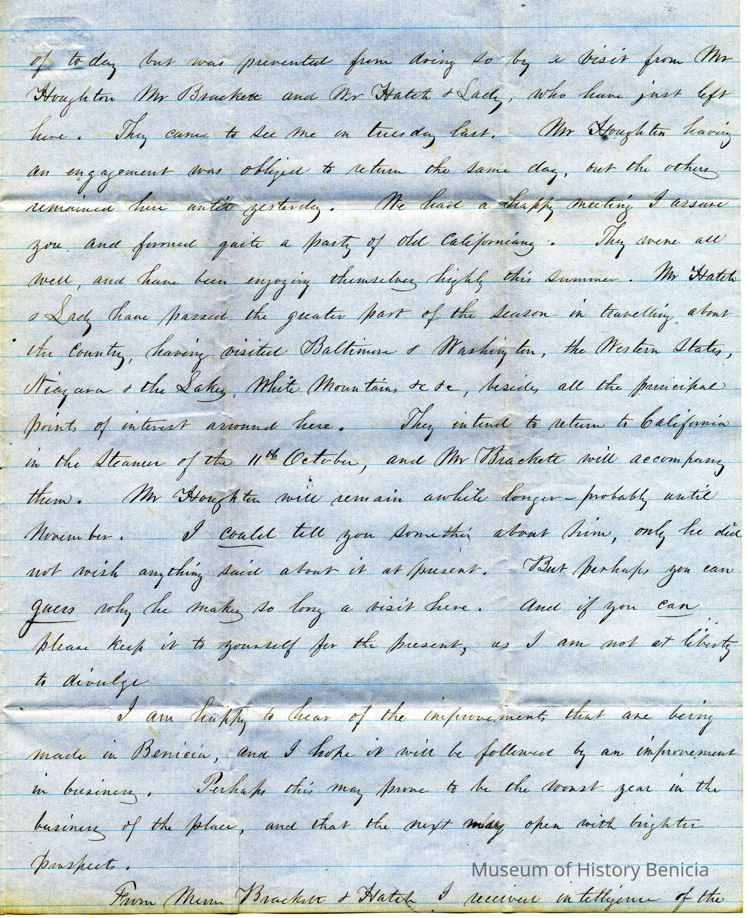 Mr. Crocker had a visit from Mr. Houghton, Brackett, and Hatch. They are all acquaintances of theirs from Benicia. Mr. Houghton told Mr. Crocker a secret that he promised not to reveal but Crocker thinks Mr. Gray can guess what it is.Collection