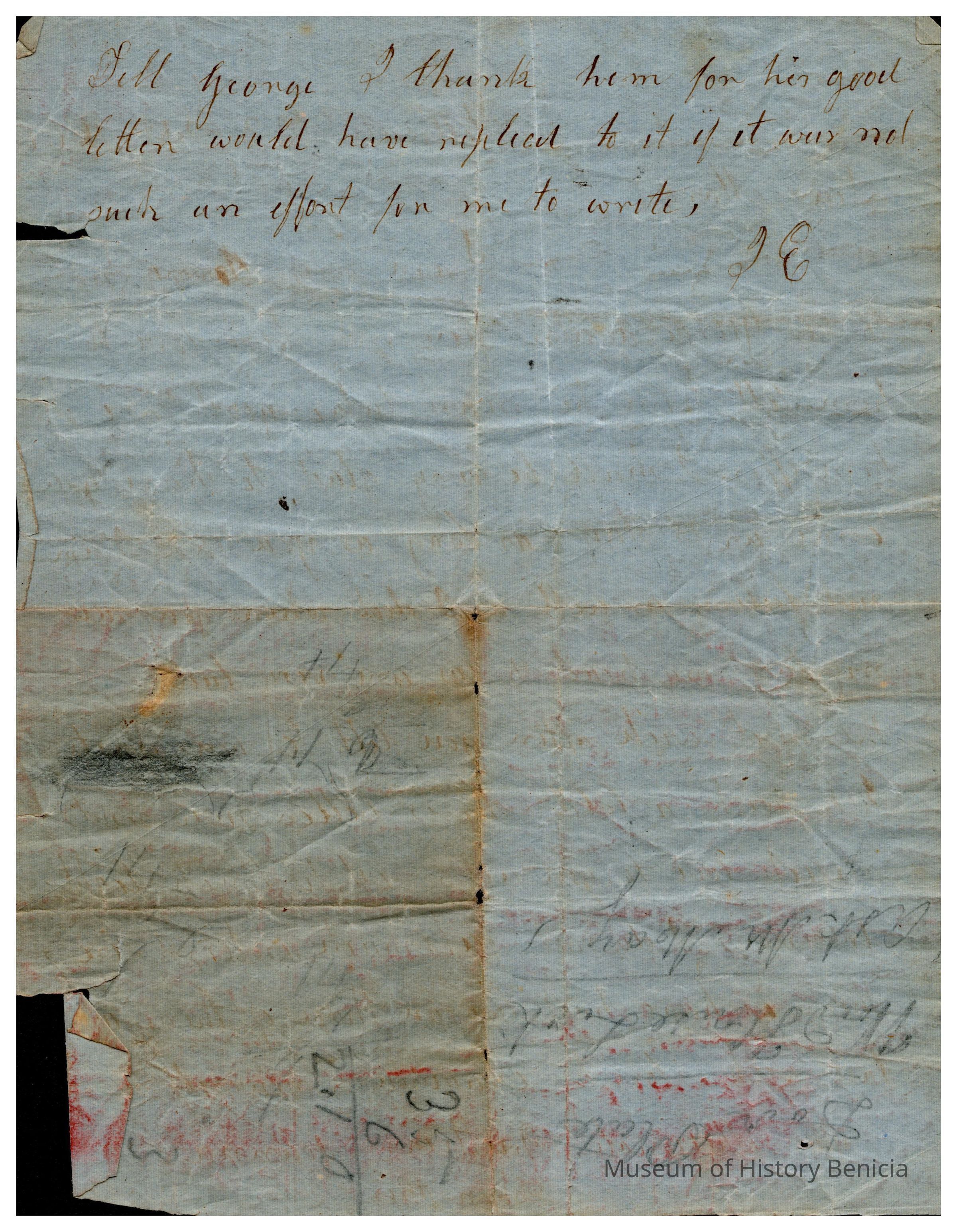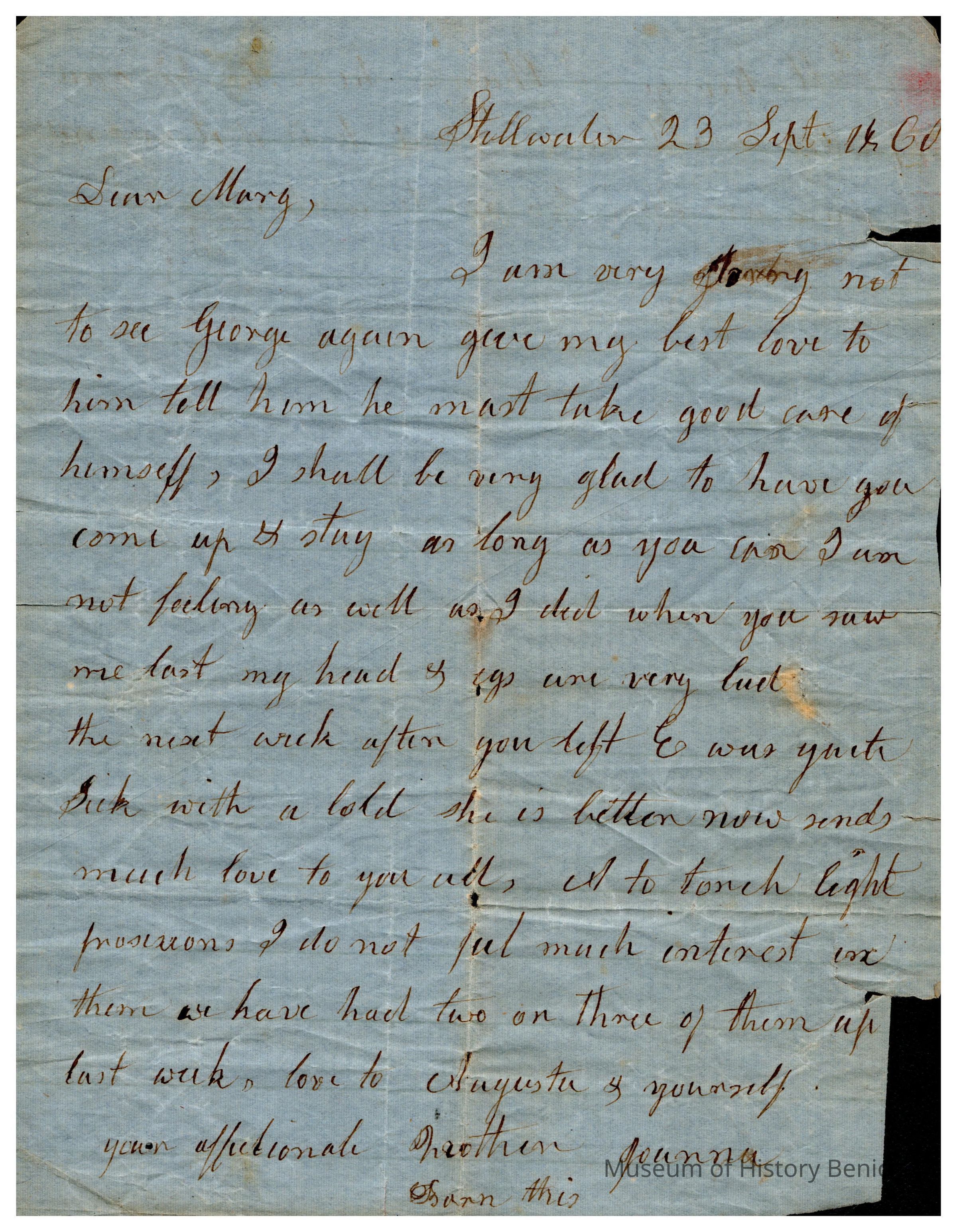 The image displays a handwritten letter dated 23rd September 1860, from Joanna Evans to someone named Mary. The letter is penned on aged blue paper, with the ink appearing slightly faded, indicative of its historical context. Joanna expresses her regret about not seeing "George Morton" and sends her best wishes, advising him to take care. She mentions feeling unwell since Mary left and discusses light provisions, noting a lack of interest in them. Joanna also sends love to Mary’s relatives, specifically mentioning others. Despite the letter showing signs of wear, it retains a heartfelt tone throughout.