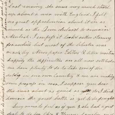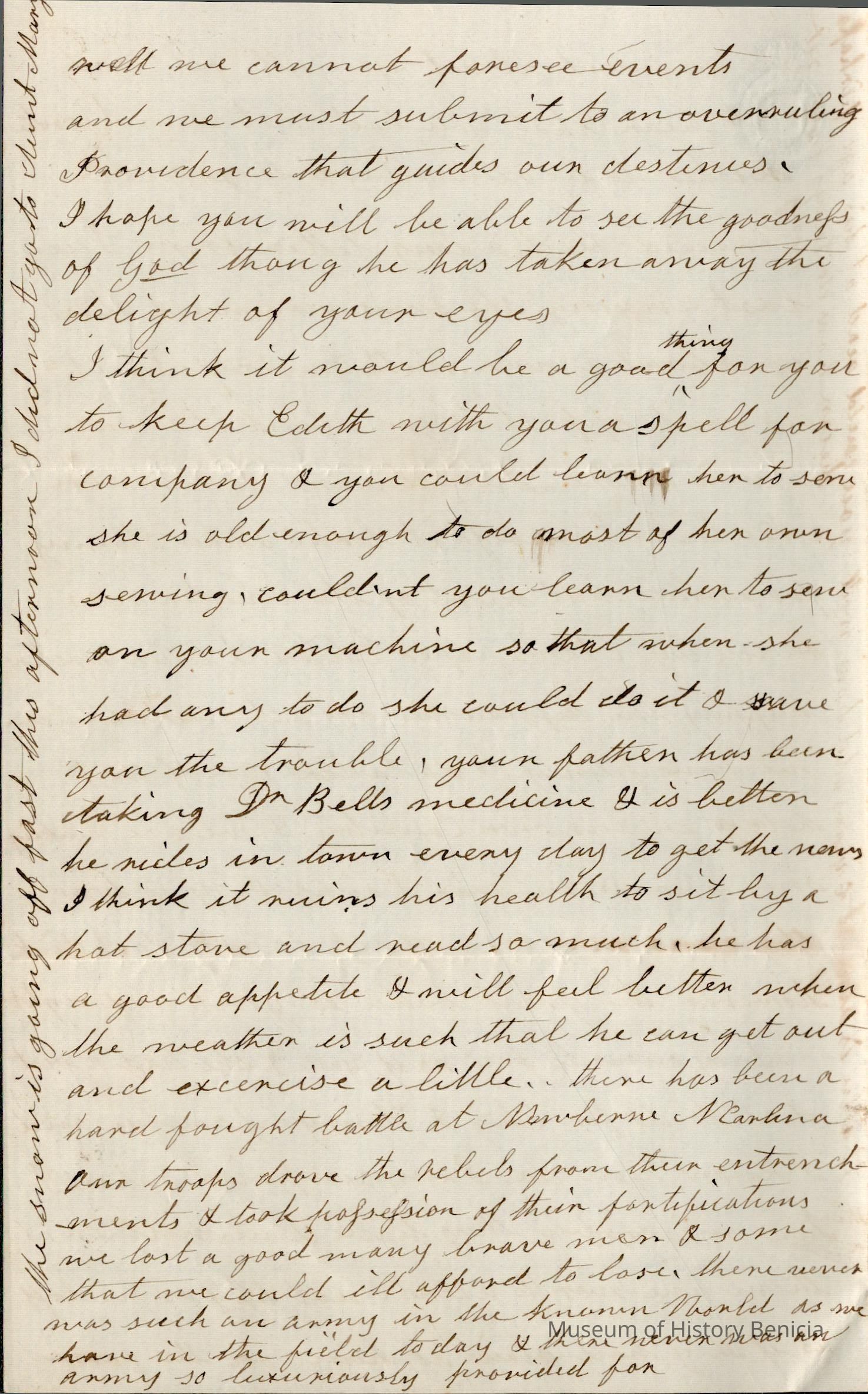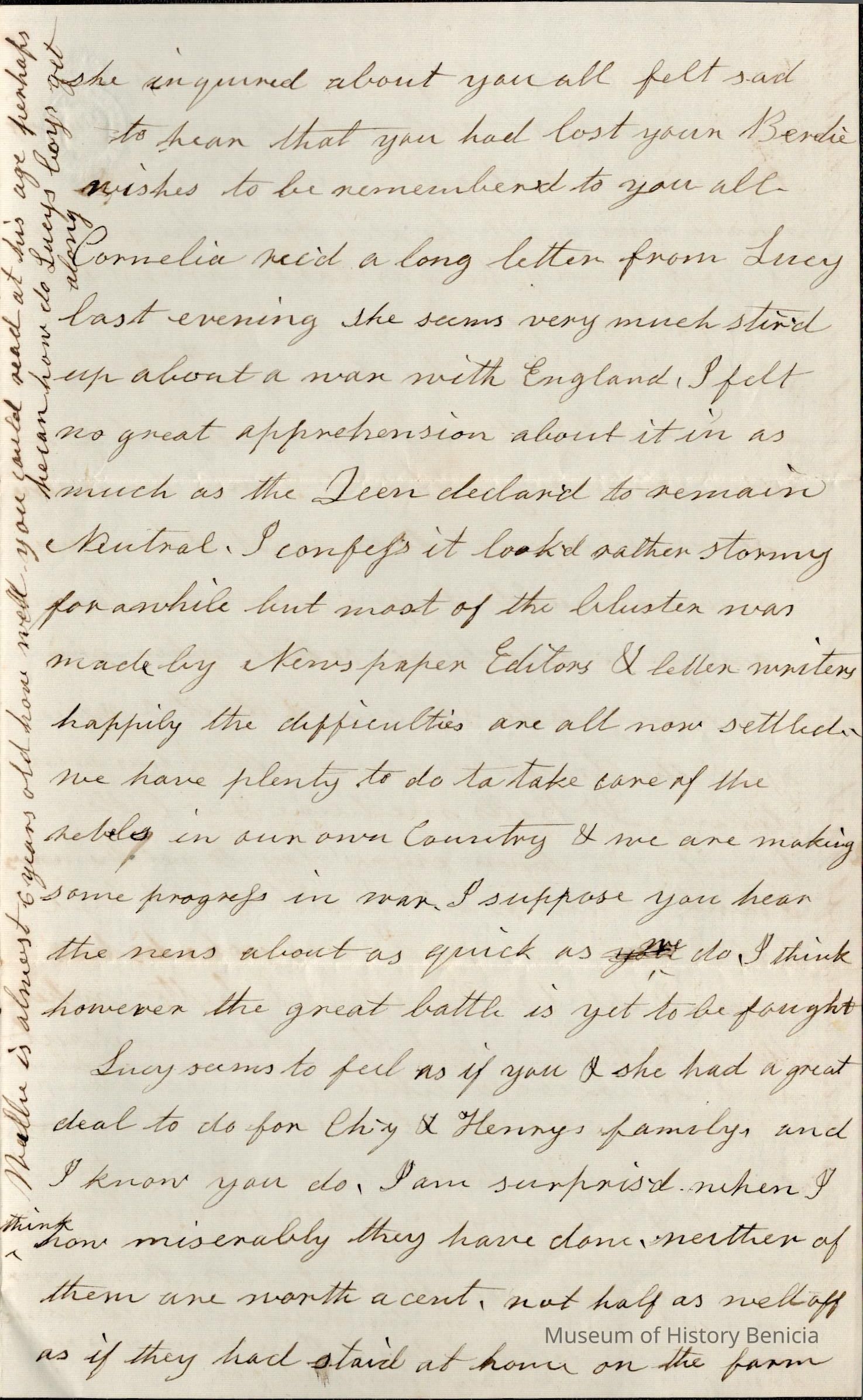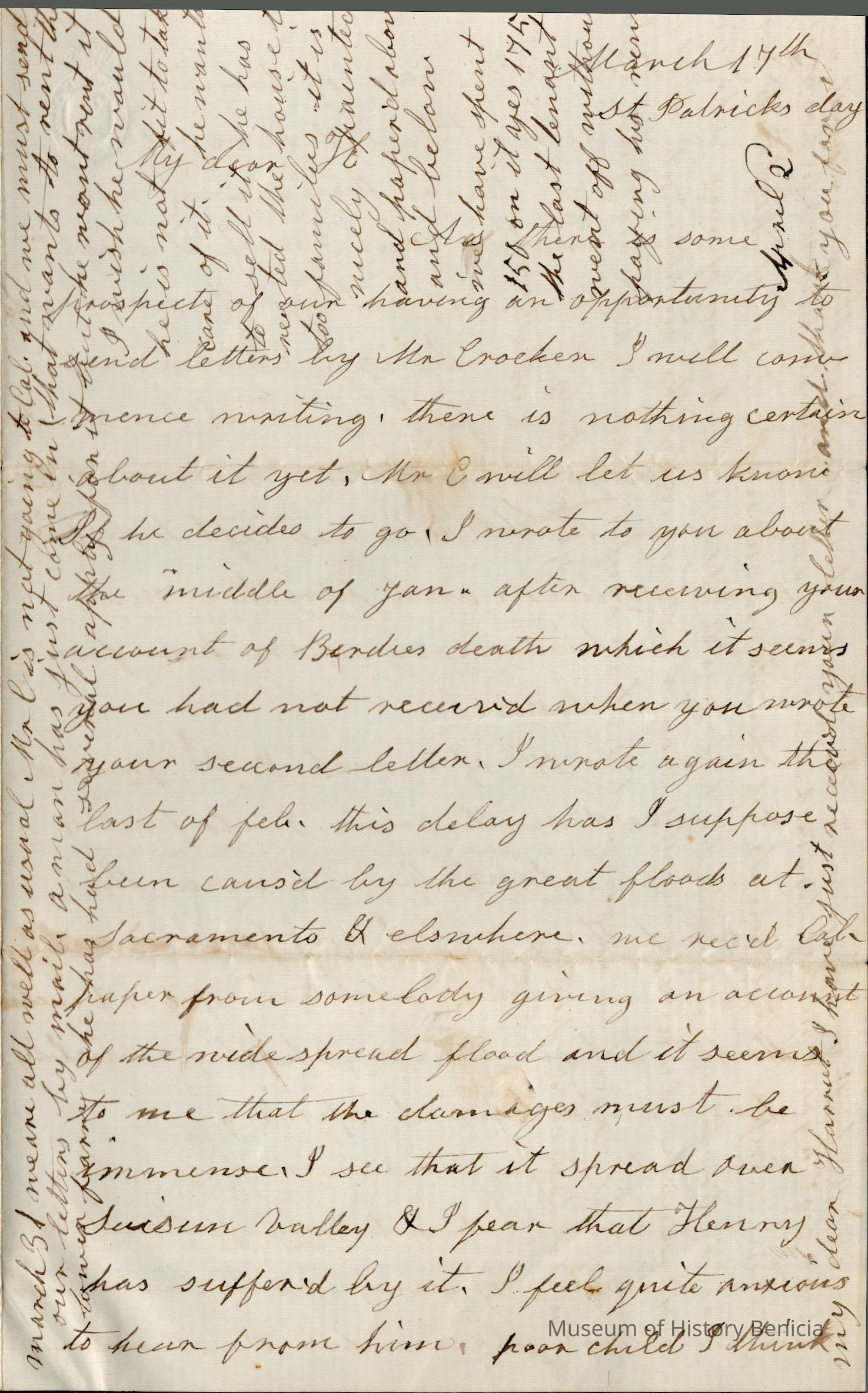 This is a letter dated 03/17/unknown to Harriet Wetmore from her mother Rebecca Wetmore regarding family matters. She talks of widespread flooding around Sacramento and Suisun Valley. She worries for her son Henry who she says has so many troubles. She also gives condolences for the loss of Harriet's child, Berdie (Bertha Jones 1859 - 12/1861). (this means the letter was probably written 03/17/1862). It is further substantiated by the mention of the Civil War battle of New Berne, NC which was in March 1862. In Rebecca's letter she has a very heartfelt paragraph about the men lost in this war and wishes it would end soon.