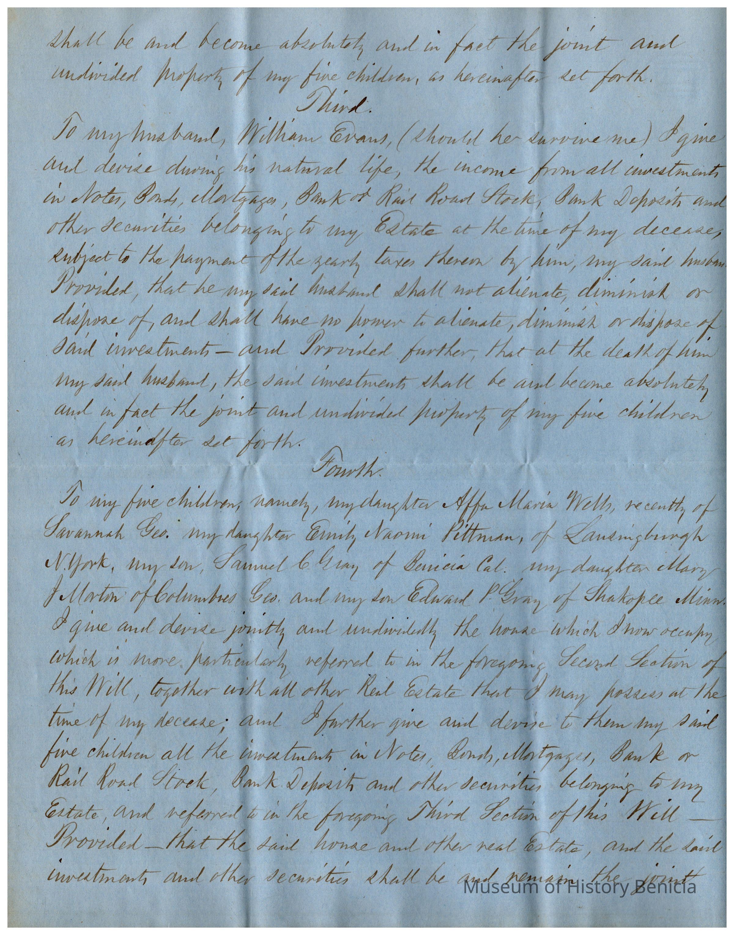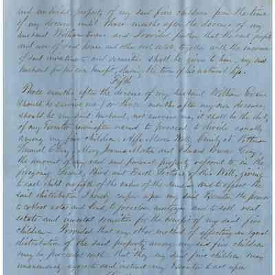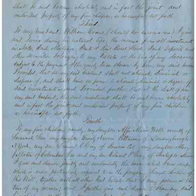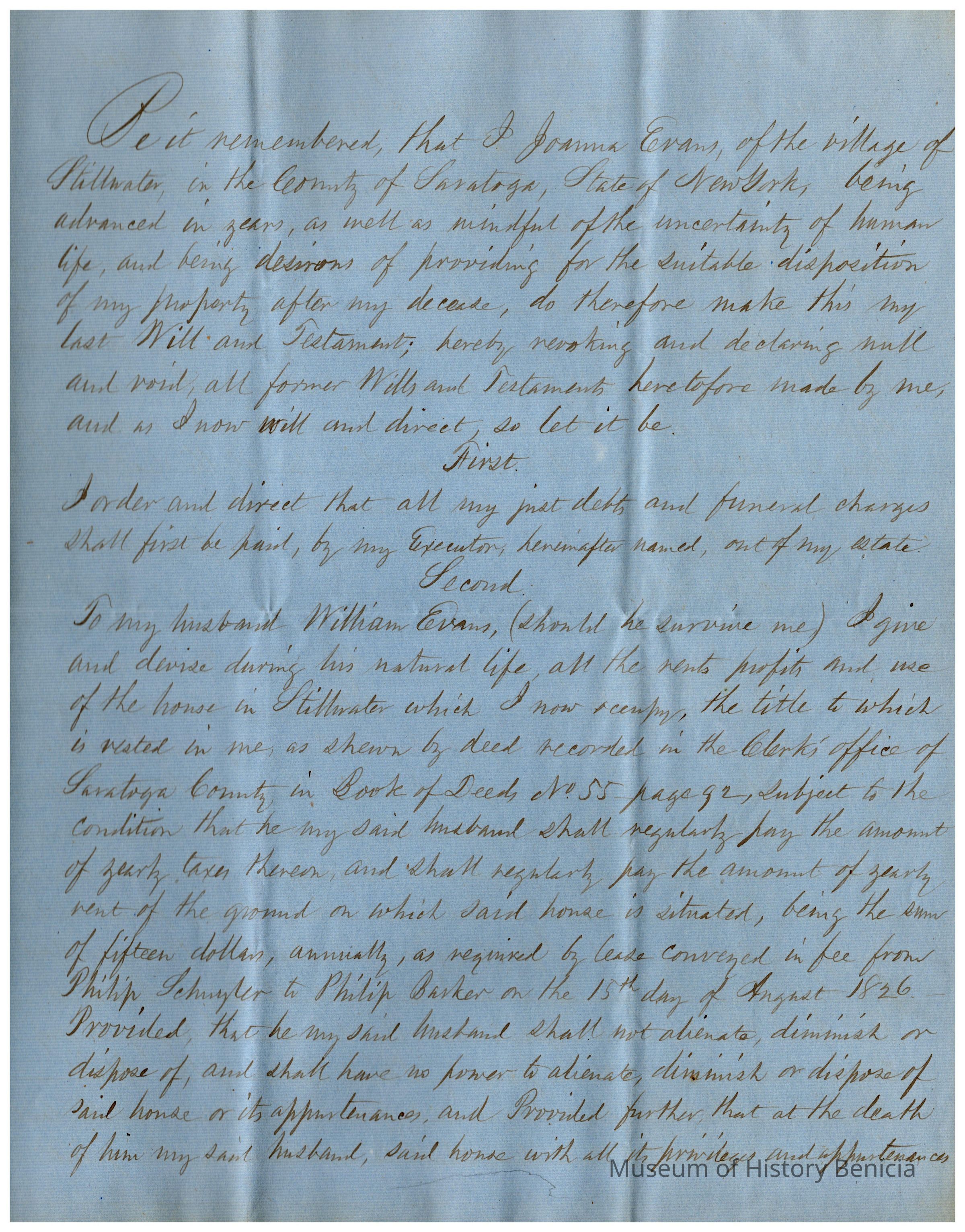 The image depicts the first page of the last will and testament of Joanna Powers Gray Evans, written in neat, cursive handwriting on blue paper. The document begins with formal language indicating Joanna's intentions to distribute her property after her demise. It outlines her wishes to pay off debts and funeral expenses first, followed by bequeathing assets to her husband, William Evans, should he outlive her. She specifies that he is to receive the use and profits of their house in Stillwater for his lifetime, contingent on certain conditions such as taxes and a specific financial obligation. The document emphasizes that her husband must not sell or transfer the property; upon his death, the house, including all associated rights and appurtenances, is to be distributed according to further stipulations not visible on this page.