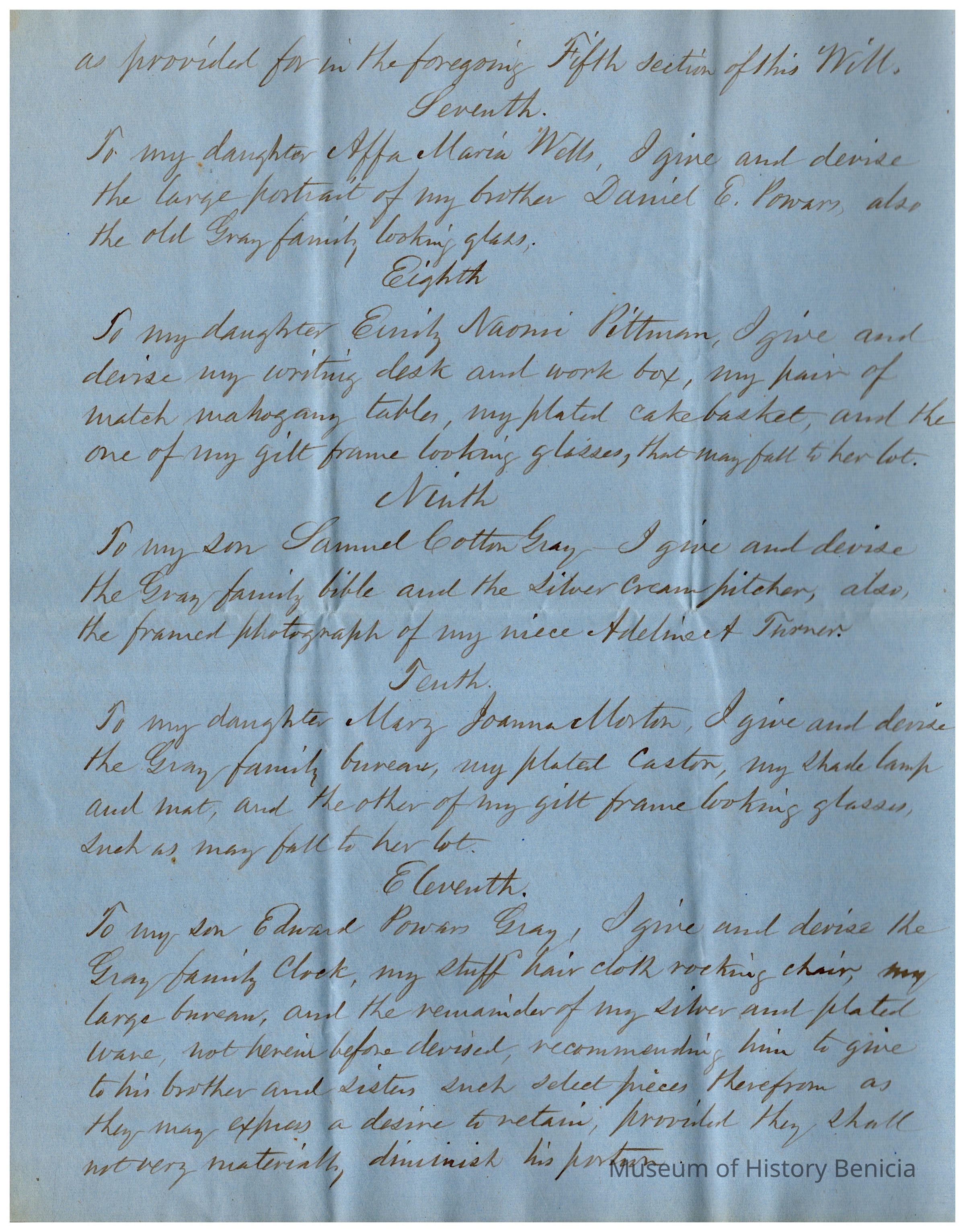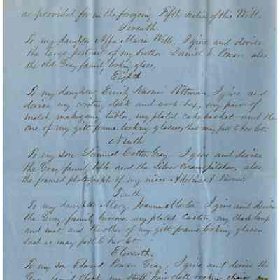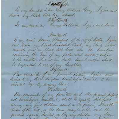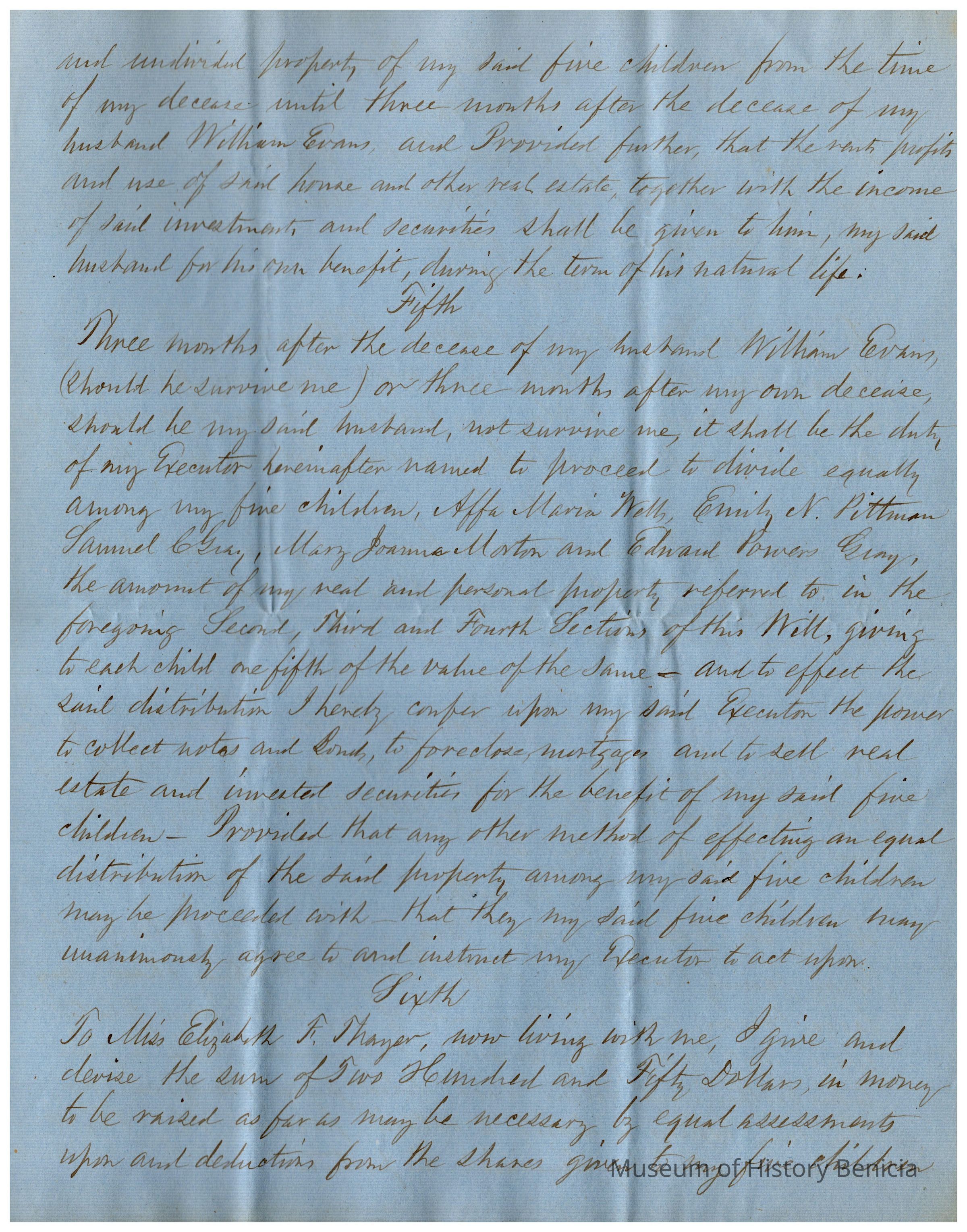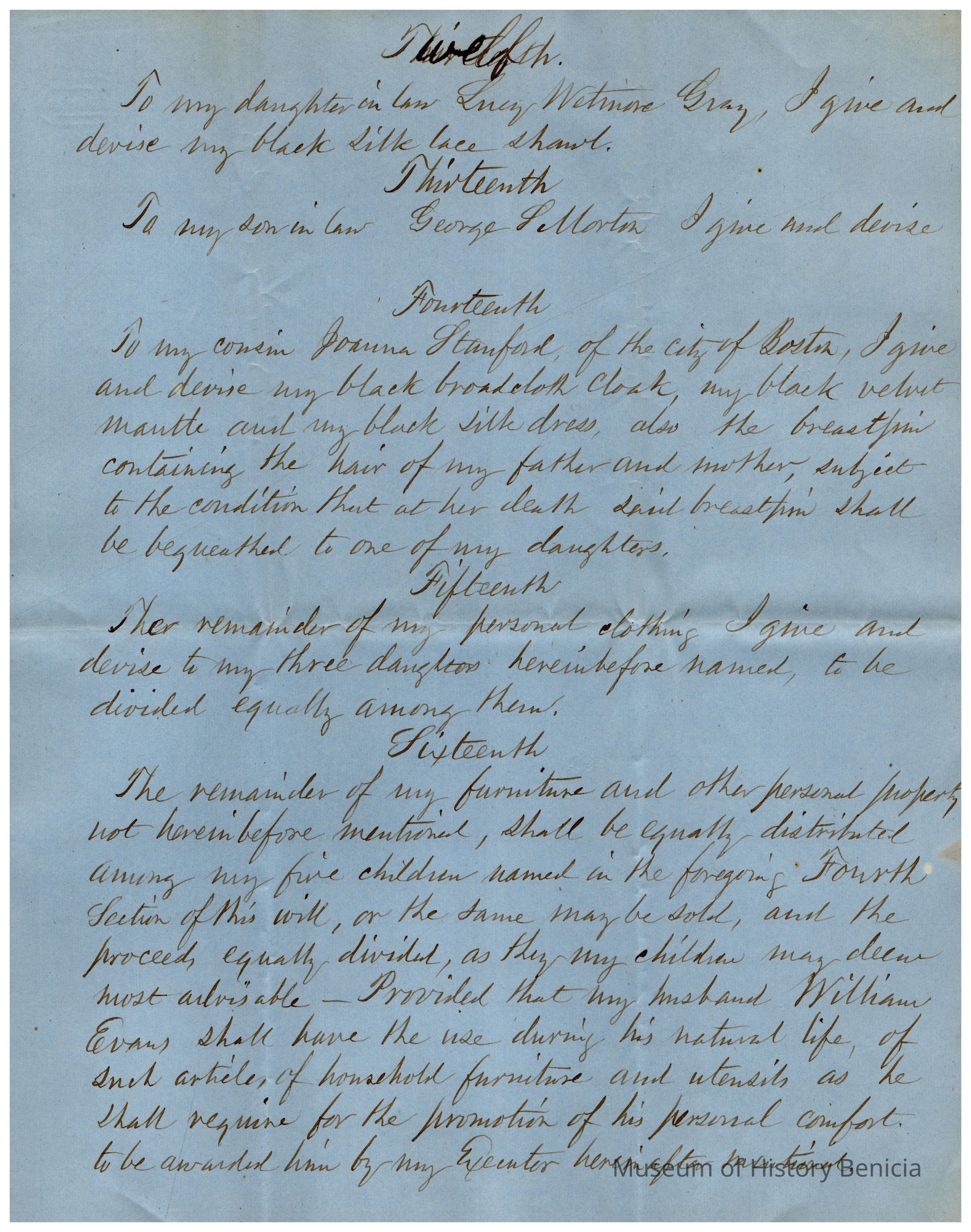 The image depicts the first page of the last will and testament of Joanna Powers Gray Evans, written in neat, cursive handwriting on blue paper. The document begins with formal language indicating Joanna's intentions to distribute her property after her demise. It outlines her wishes to pay off debts and funeral expenses first, followed by bequeathing assets to her husband, William Evans, should he outlive her. She specifies that he is to receive the use and profits of their house in Stillwater for his lifetime, contingent on certain conditions such as taxes and a specific financial obligation. The document emphasizes that her husband must not sell or transfer the property; upon his death, the house, including all associated rights and appurtenances, is to be distributed according to further stipulations not visible on this page.