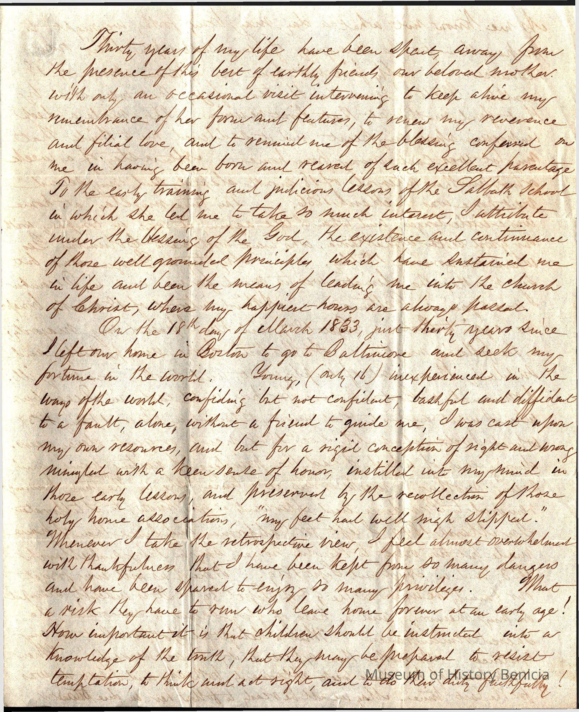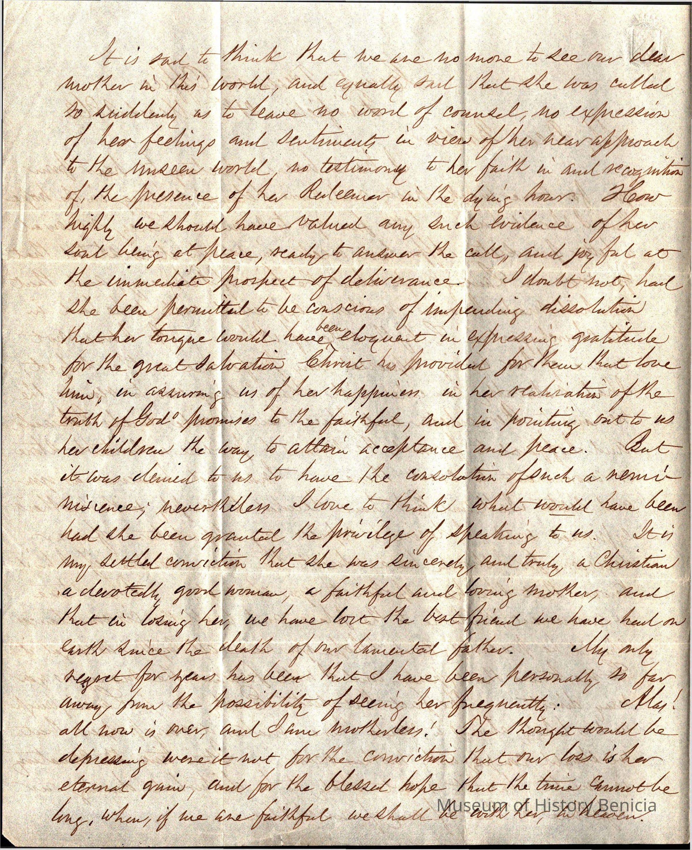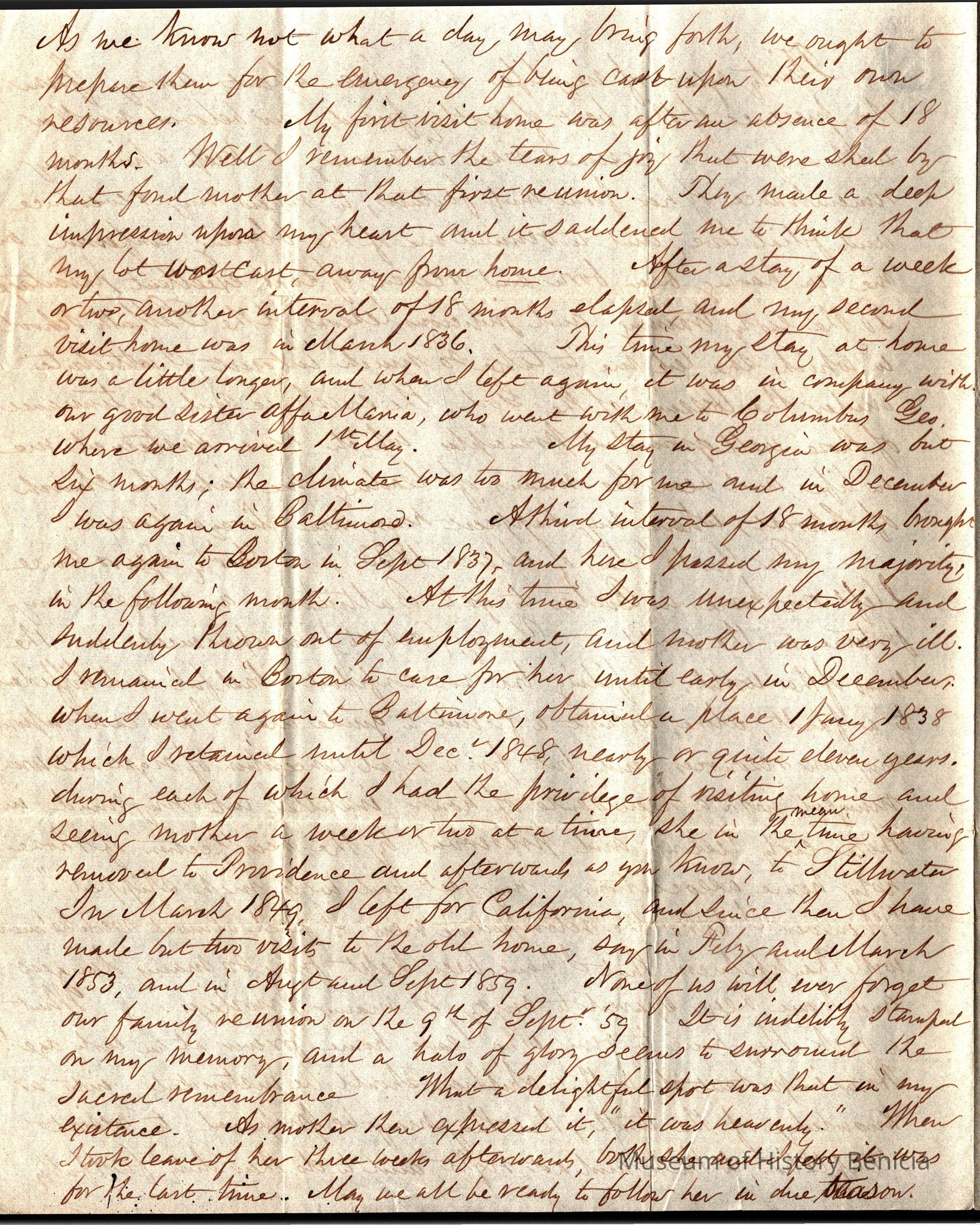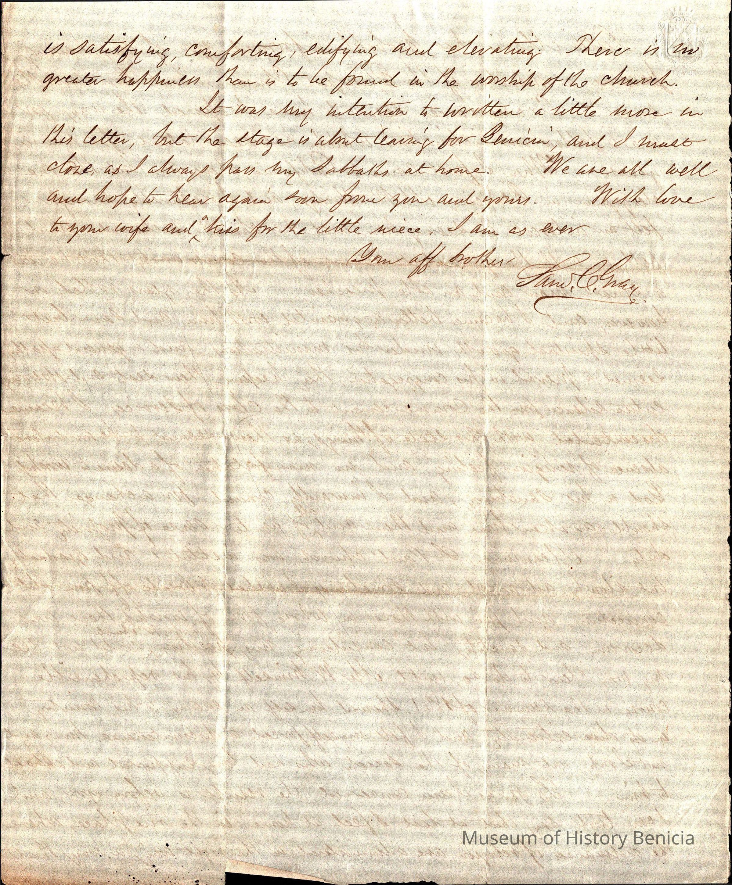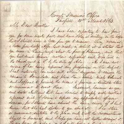 This is a letter addressed from the Fairfield, CA County Treasurers Office and written by Samuel C Gray dated 03/21/1863 to one of his brothers. He mentions his mother's wish to be buried at Trinity Church in Lansingburgh, Rensselaer County, New York. Most of the letter talks of Samuel's times away from home and his periodic visits back to see his mother.