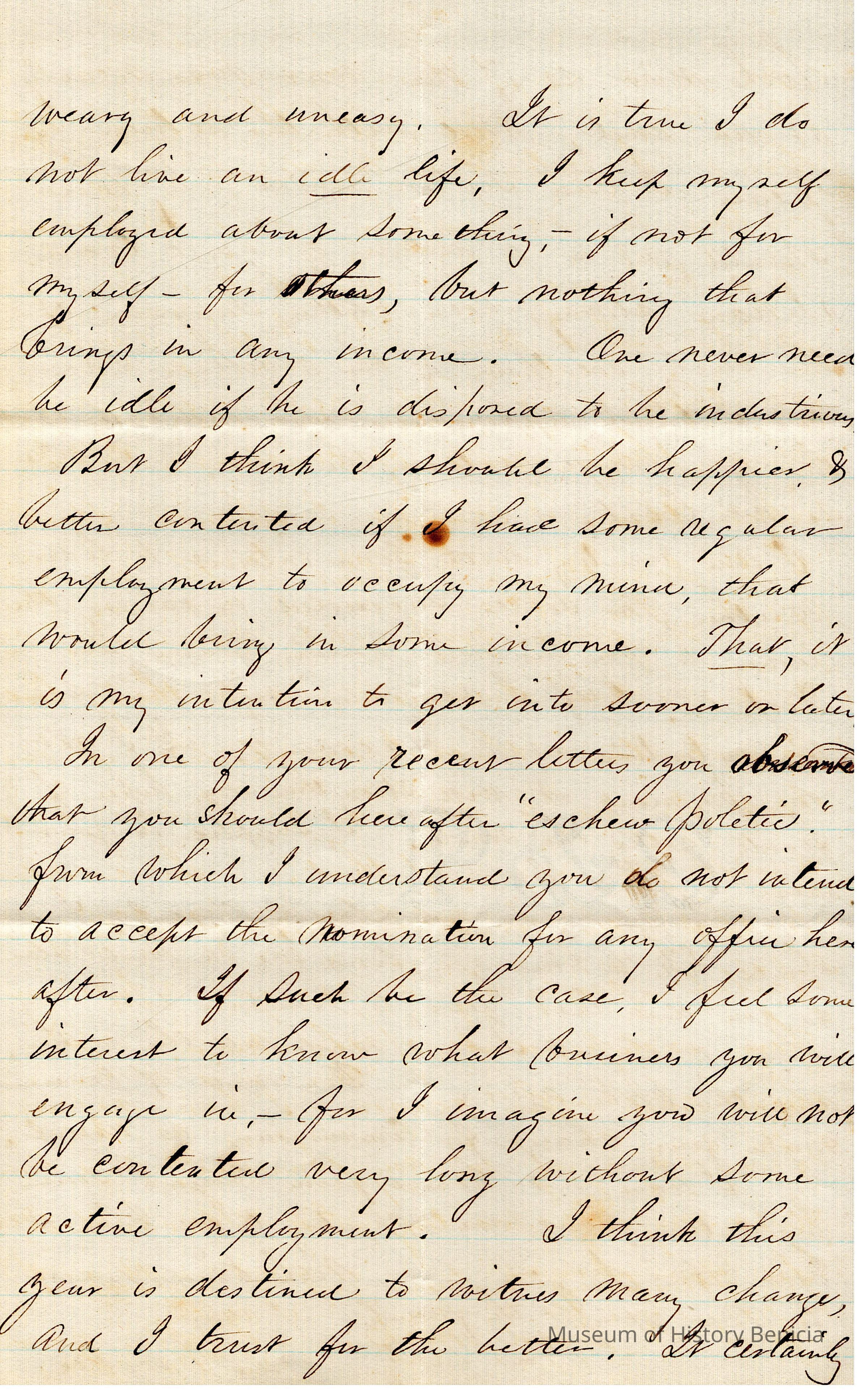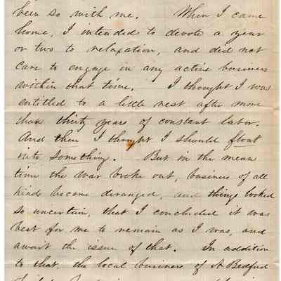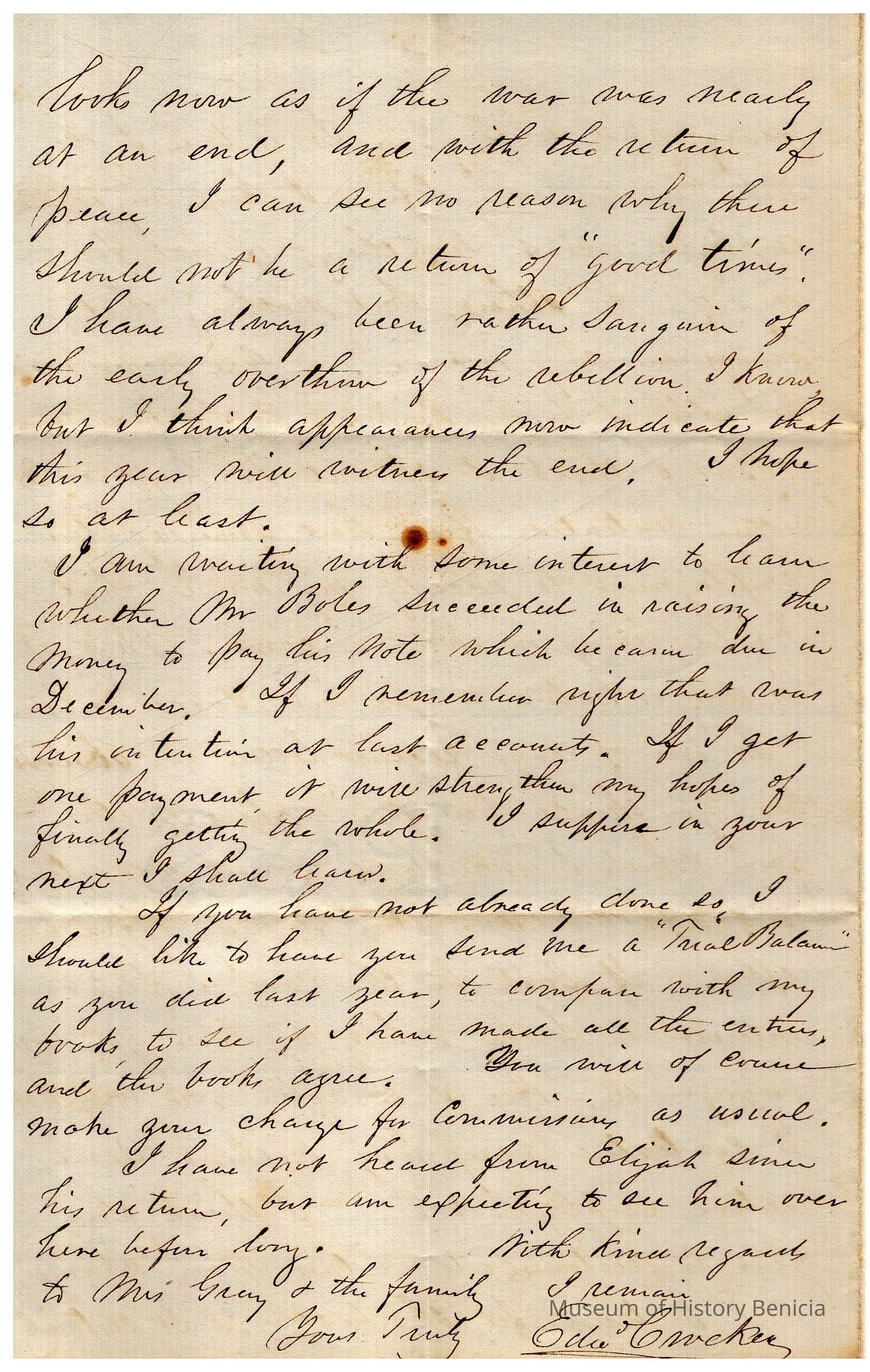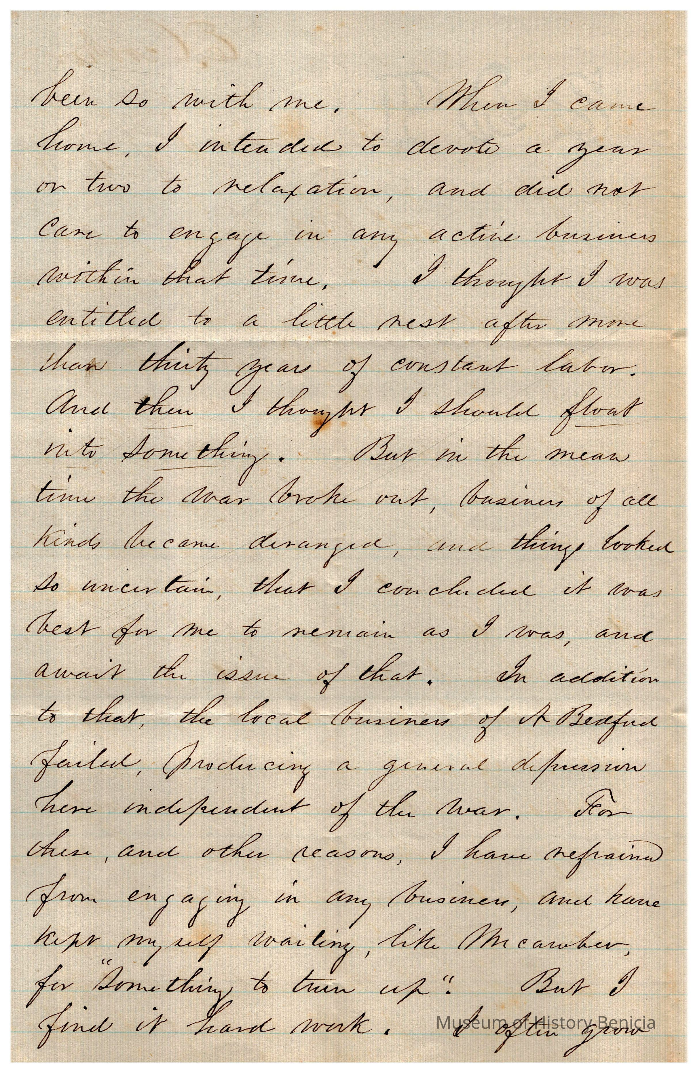 The image showcases a handwritten letter from E. Crocker to Samuel C. Gray, dated January 25, 1864, from New Bedford. The letter is penned in cursive on lined paper. Mr. Crocker congratulates Mr. Gray on completing his duties as County Treasurer and suggests he may now enjoy a period of rest at Benicia away from business responsibilities. Crocker acknowledges the hard work and service Gray has provided over many years and suggests that Gray deserves some relaxation and freedom from business obligations. However, Crocker humorously notes that if Gray is anything like himself, he might soon grow restless during this idle time, feeling the urge to return to active employment. Overall, the letter conveys a warm and understanding tone, pairing formal congratulations with personal insight and reflection on the common human need for both rest and activity.