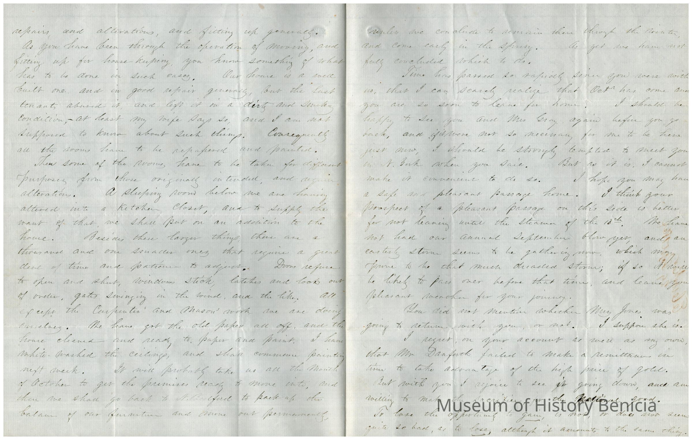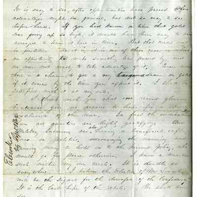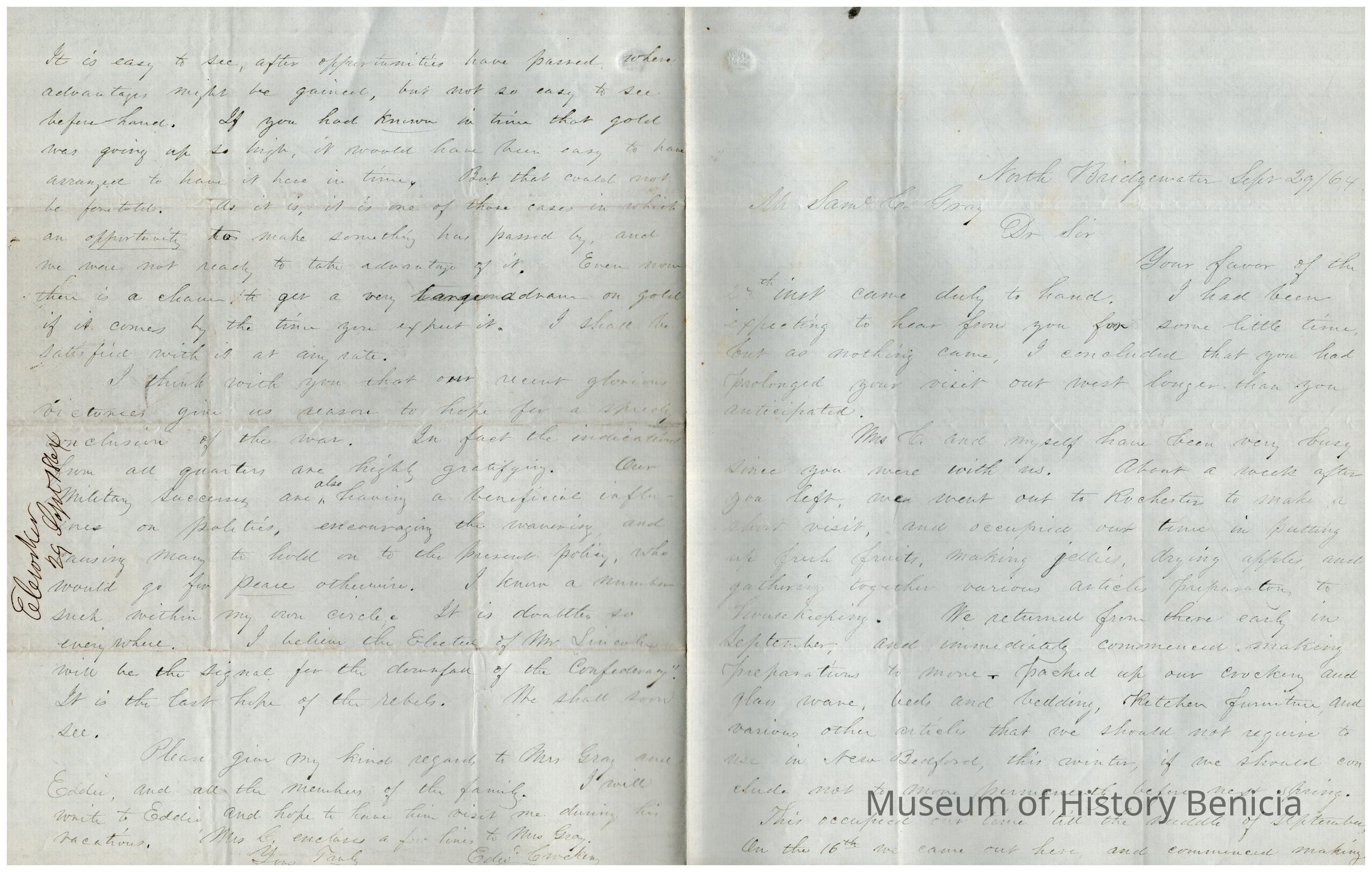 Edward Crocker talks about his coming move to New Bedford from North Bridgewater and the things they have been doing to keep busy. He discusses the high price of gold and the fact that it is now coming down. He wishes they could have known about the rising price but is glad for the country that the price is falling. (Gold price in 1864 was $47.02 and was less than half that amount , $20.67, in 1861.)