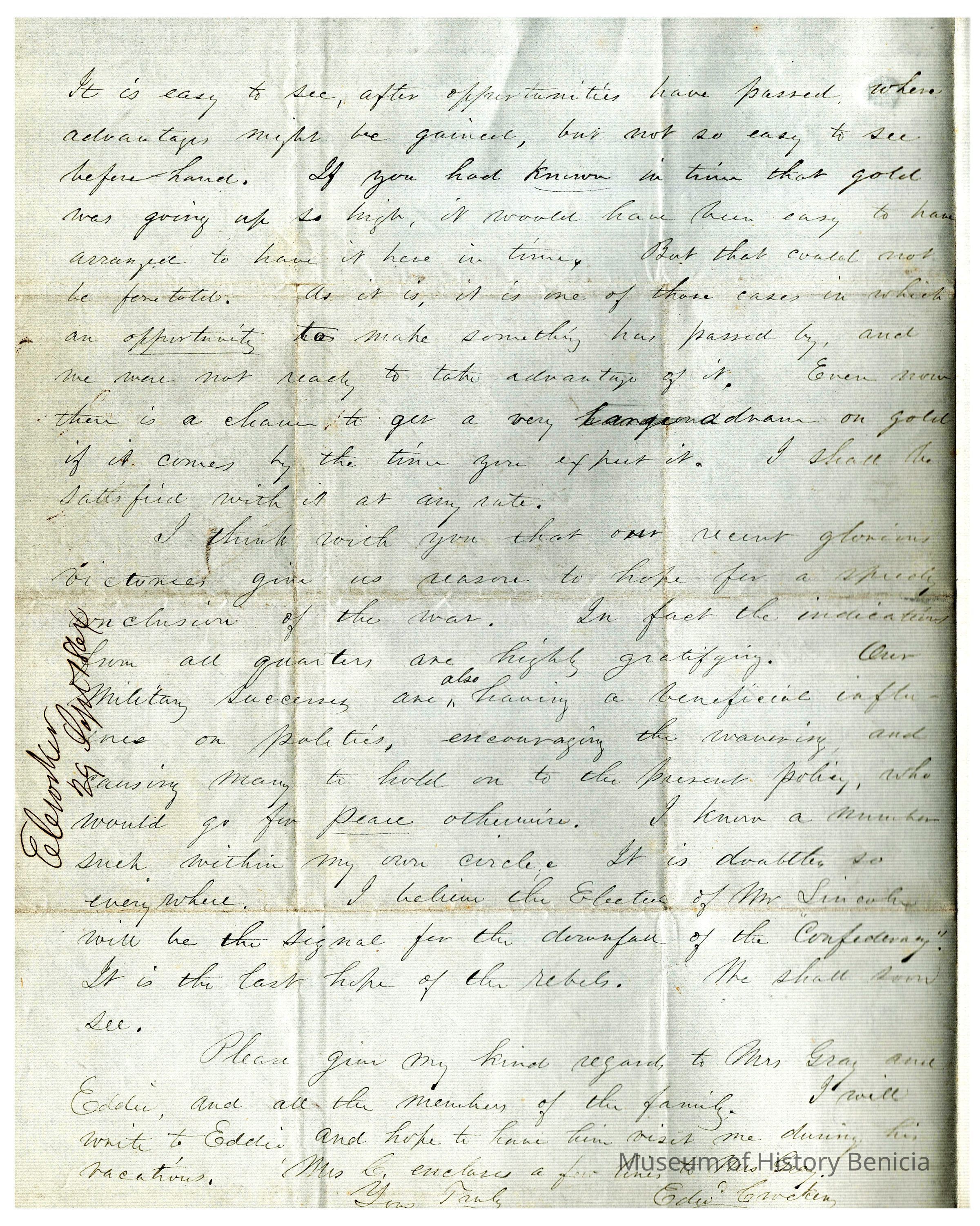 At the end of the letter he says that the coming election of Mr. Lincoln could be the end for the Confederacy. He thinks that the recent victories on the battlefield could be causing people to hold on to the current war policy rather than pushing to sue for peace.