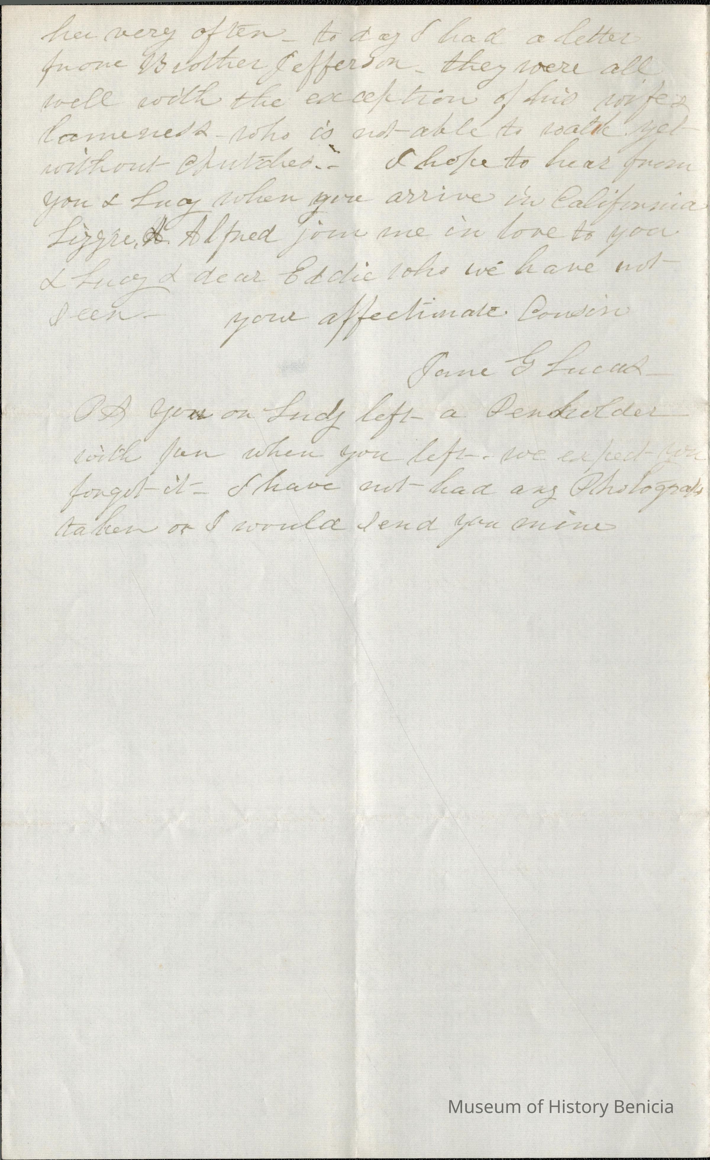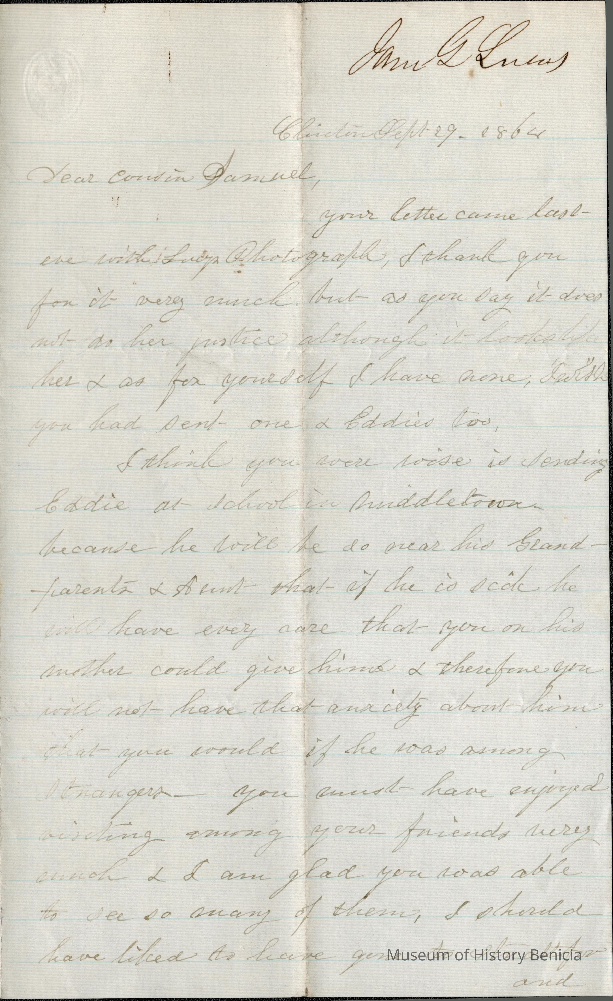 This is a letter to Samuel C Gray from his cousin Jane G. Lucas date 09/29/1864. She lives in Clinton, NY in Onida County. She was born about 1811 in Connecticut and died 11/14/1872 and is buried in Clinton, NY. The "G" in her name stands for Gray.Collection