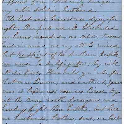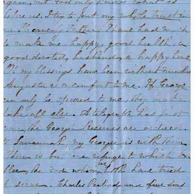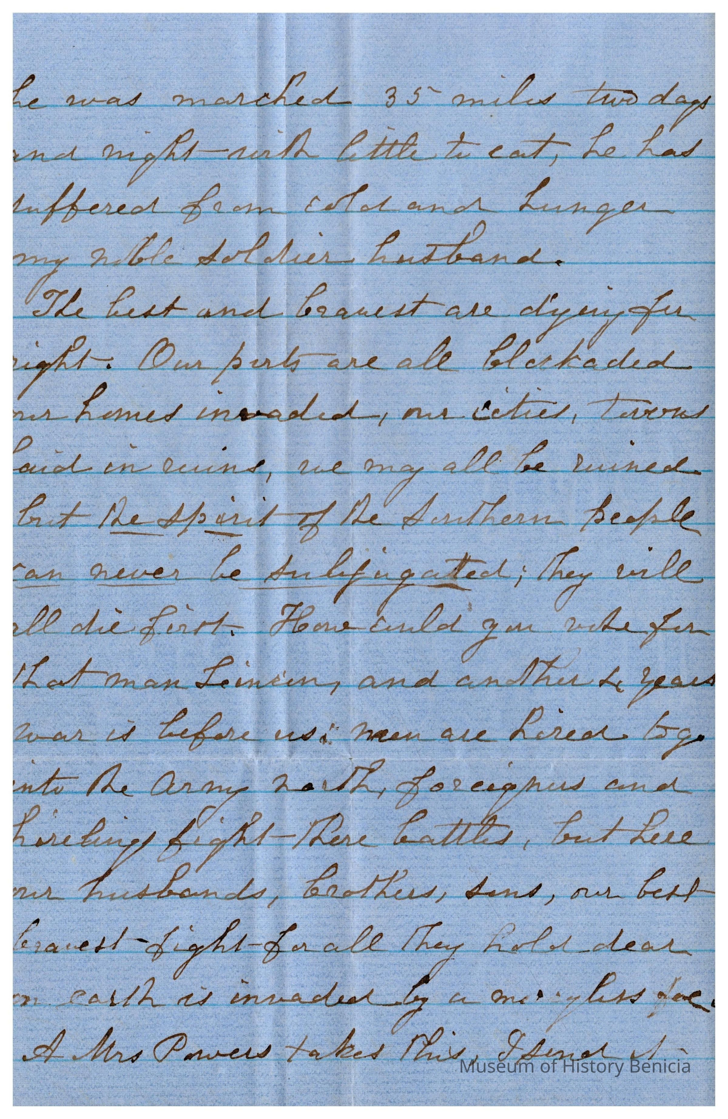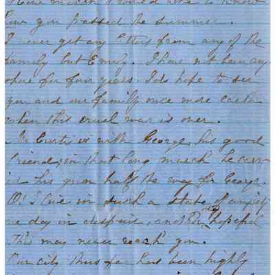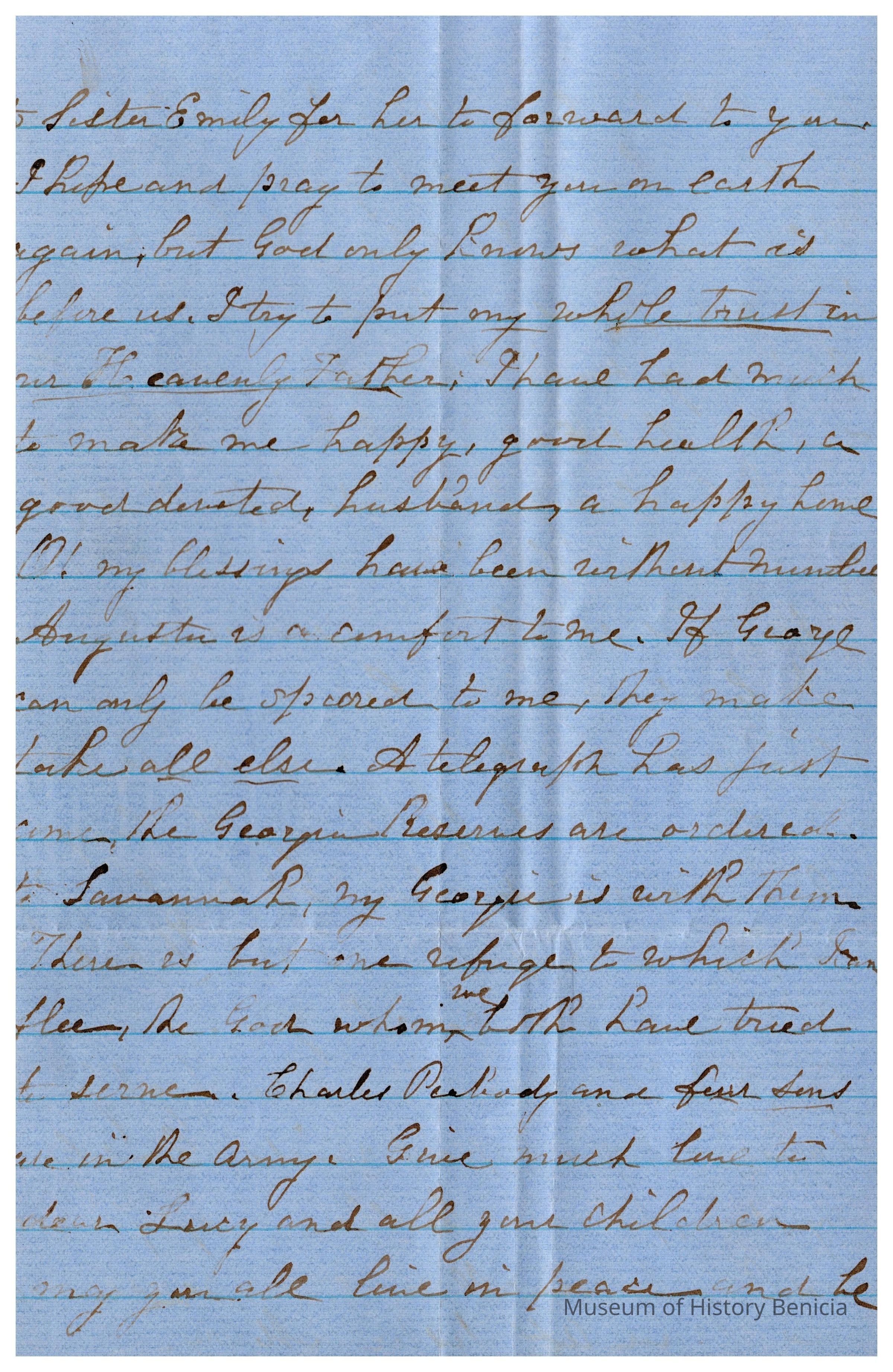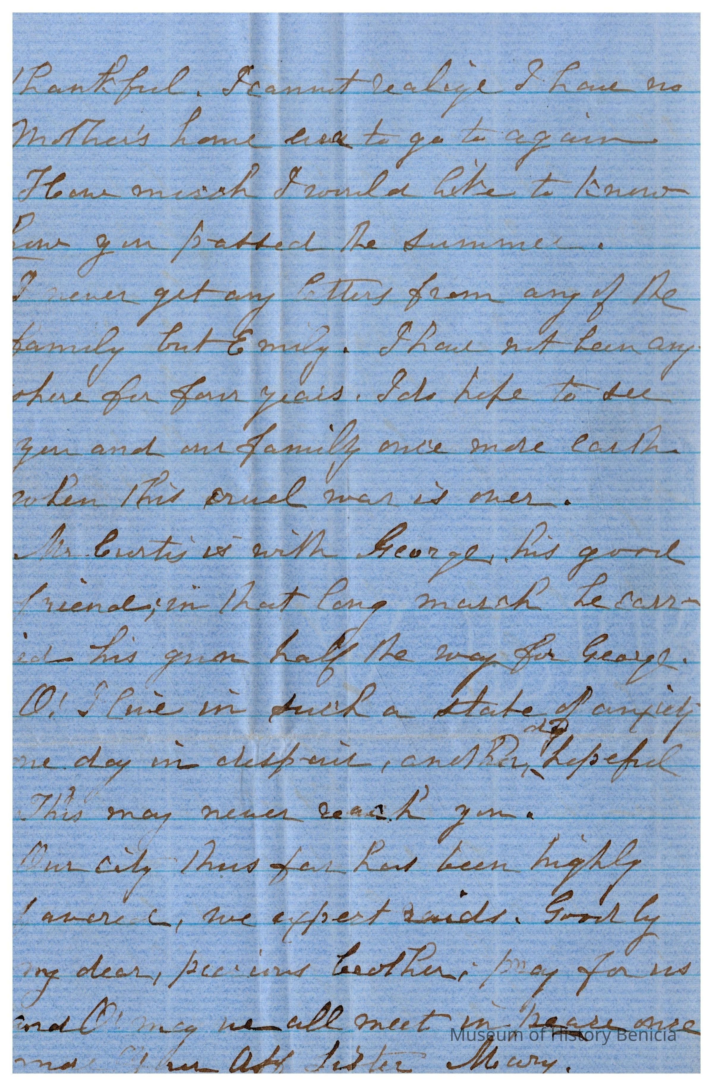 The image depicts a handwritten letter dated November 27, 1864, from Mary Morton in Georgia to her brother Samuel Gray in California during the Civil War. The letter is written on blue-lined paper and expresses Mary's concerns about not receiving letters or messages from Samuel despite knowing he sailed for California in October. She mentions learning from a third party about his departure and expresses frustration and doubt about his efforts to communicate. Mary also describes how her husband, George, joined a company called the Fire Guards, tasked with protecting homes from enemy forces, who were invading their land, destroying cities, and creating distress. She describes the emotional toll, noting the anguish caused by the separation and threats of war.
