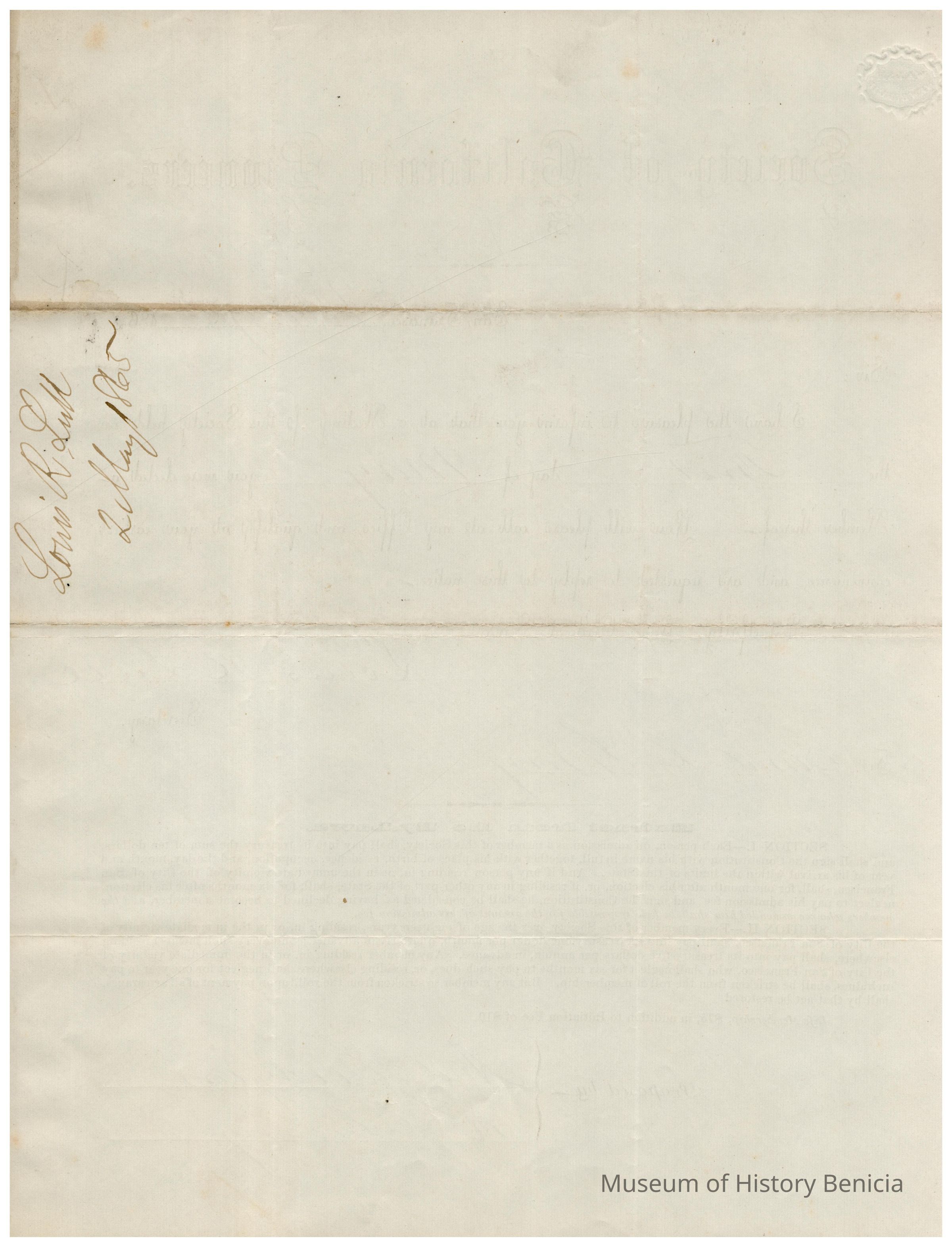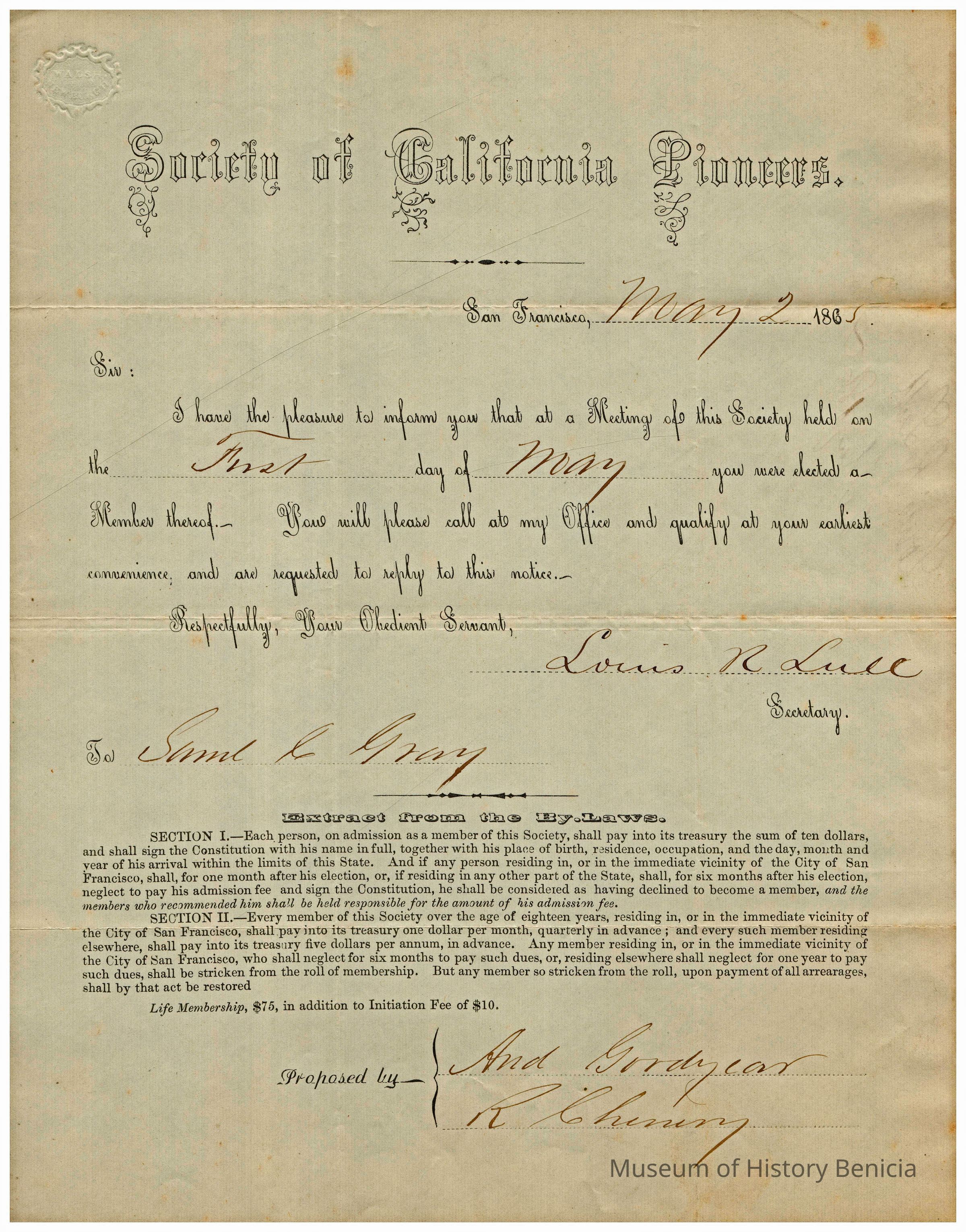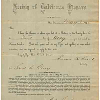 Certificate of membership in the California Society of Pioneers dated 05/02/1865. It was sent to Samuel C Gray and he was proposed by Andrew Goodyear and R. Chenuny(?).Collection