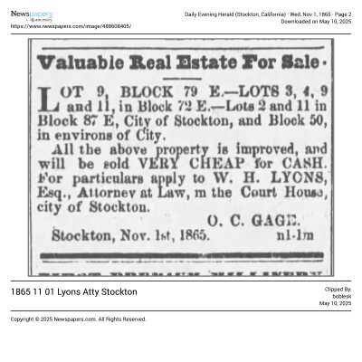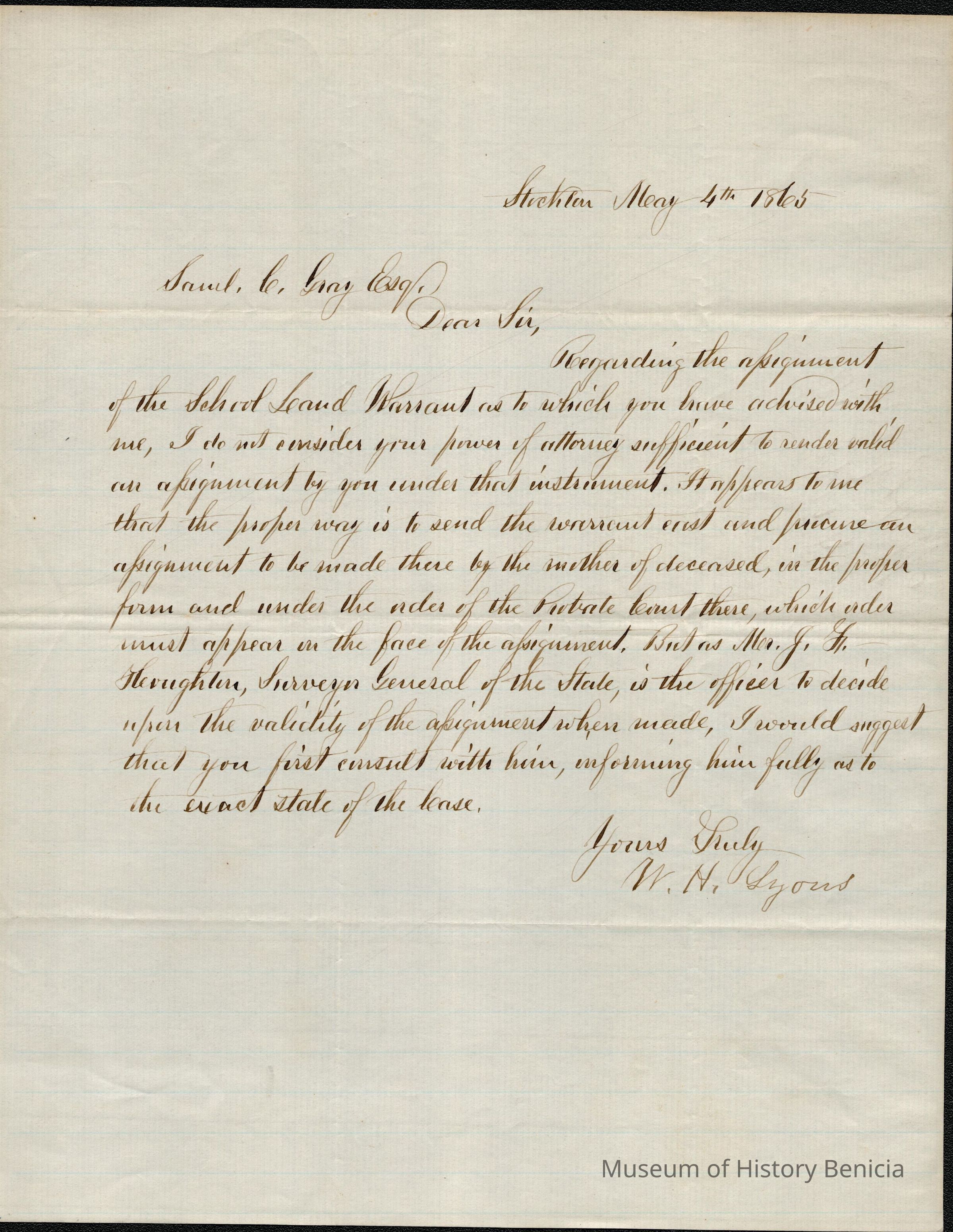 This is a letter dated 05/04/1865 from W.H. Lyons to Samuel Gray. Mr. Lyons is in Stockton and is writing about the School Land Warrant of a property having to do with someone's estate. Mr. Lyons is disagreeing with Mr. Gray as to how best to handle the matter.