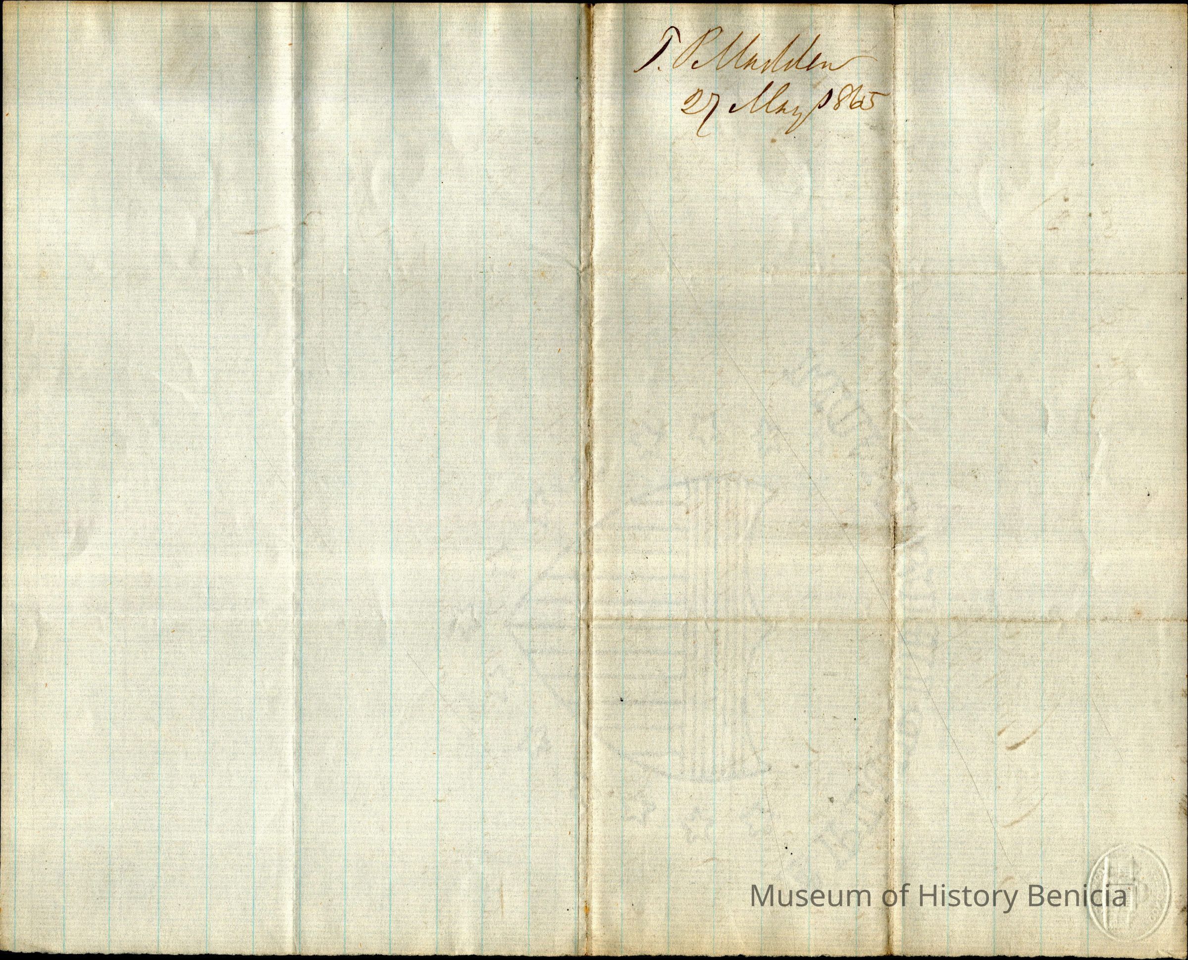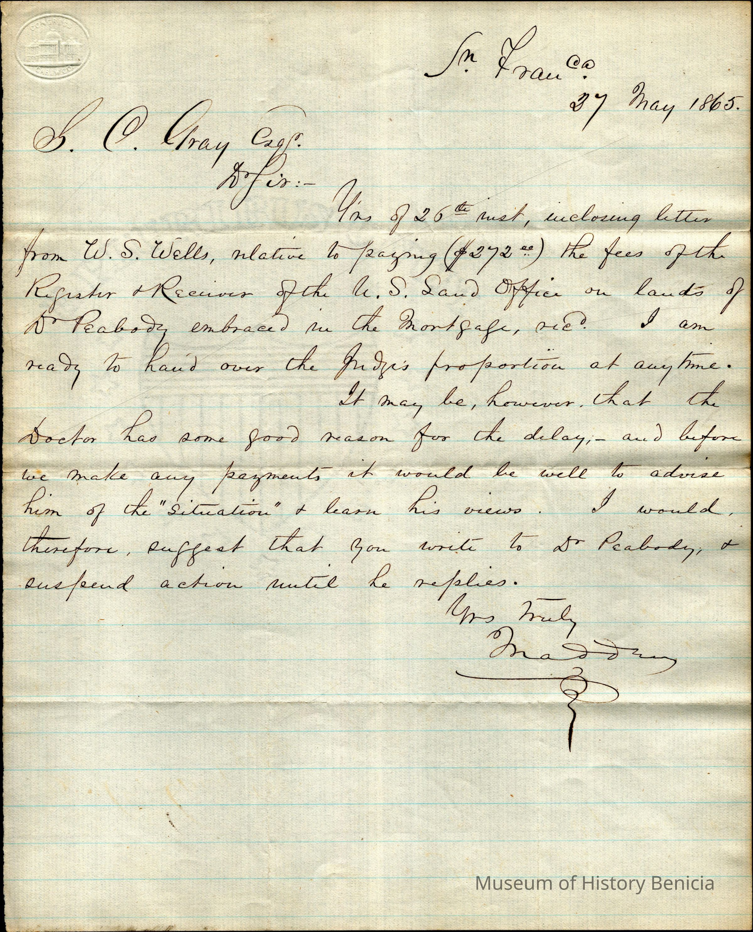 The image depicts a handwritten letter dated 27 May 1865, addressed to "S. C. Gray Esq." and signed by someone named "Mr. Madden." The letter is written on lined paper with a watermark, suggesting a formal document. It mentions a letter received from "W. S. Wells" regarding a payment of $272 for fees related to a U.S. Land Office transaction involving lands of Dr. Peabody within a mortgage. Mr. Madden indicates readiness to proceed with a transaction but advises Mr. Gray to consult with Dr. Peabody before proceeding with any payments, advising patience.