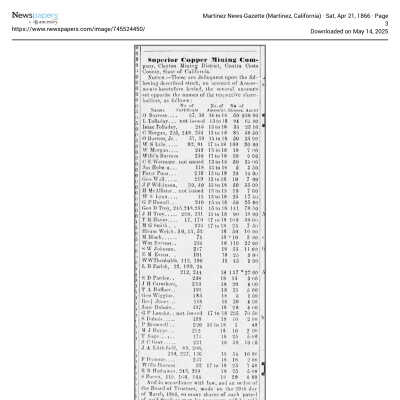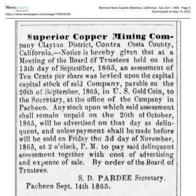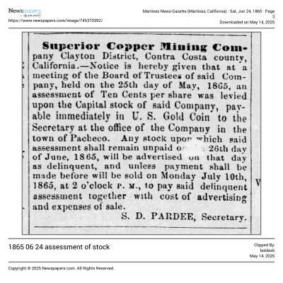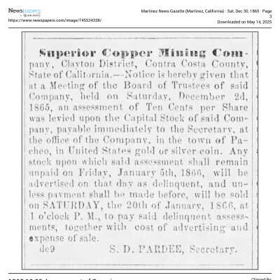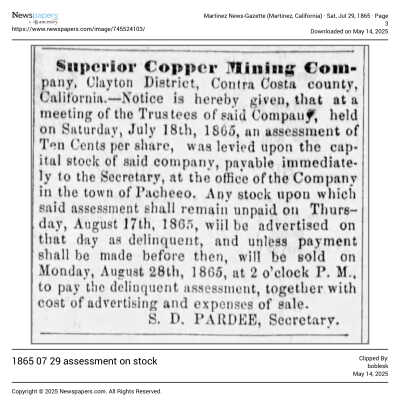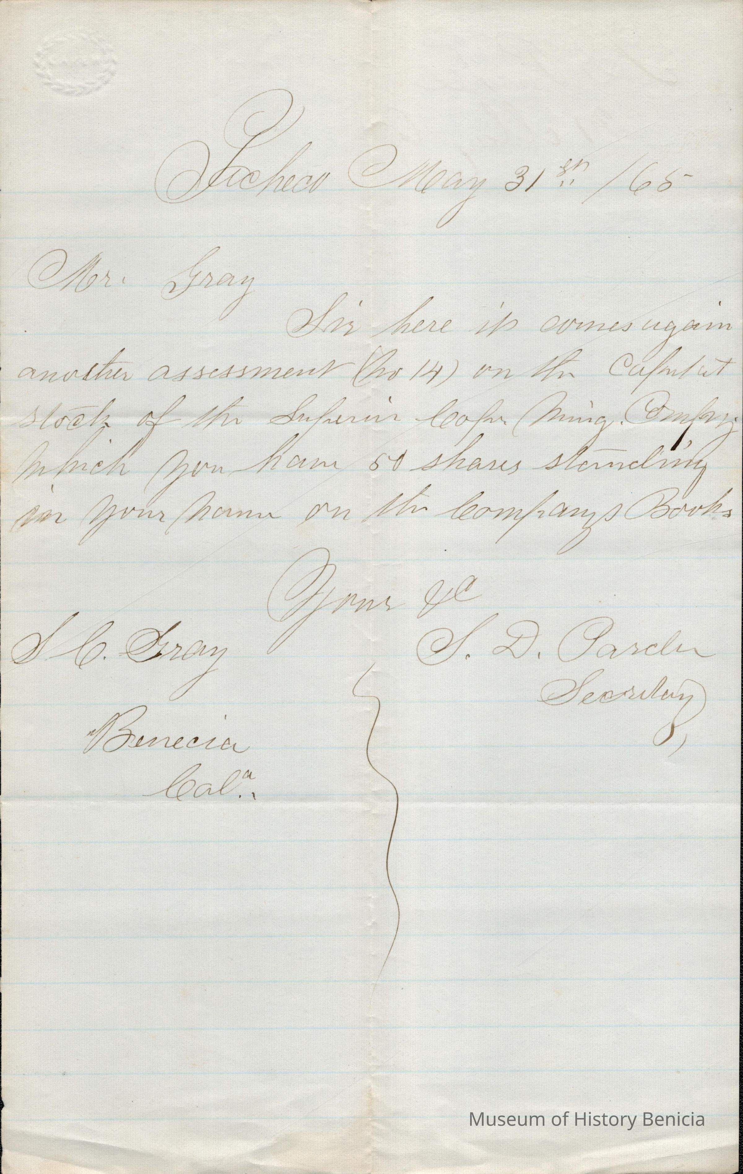 The image is a handwritten letter dated May 31, 1865, addressed to Mr. Samuel Gray in Benicia, California. It informs Mr. Gray of an assessment (No. 14) on the capital stock of the Superior Copper Mining Company, in which he possesses 60 shares. The letter is written in elegant cursive on lined paper with a watermark visible at the top. It is signed by J.D. Rardin, who appears to be associated with Pacheco, CA, as indicated by the location mentioned at the top of the letter. The purpose of the letter is to notify Mr. Gray of his financial obligations concerning his stock holdings with the company.