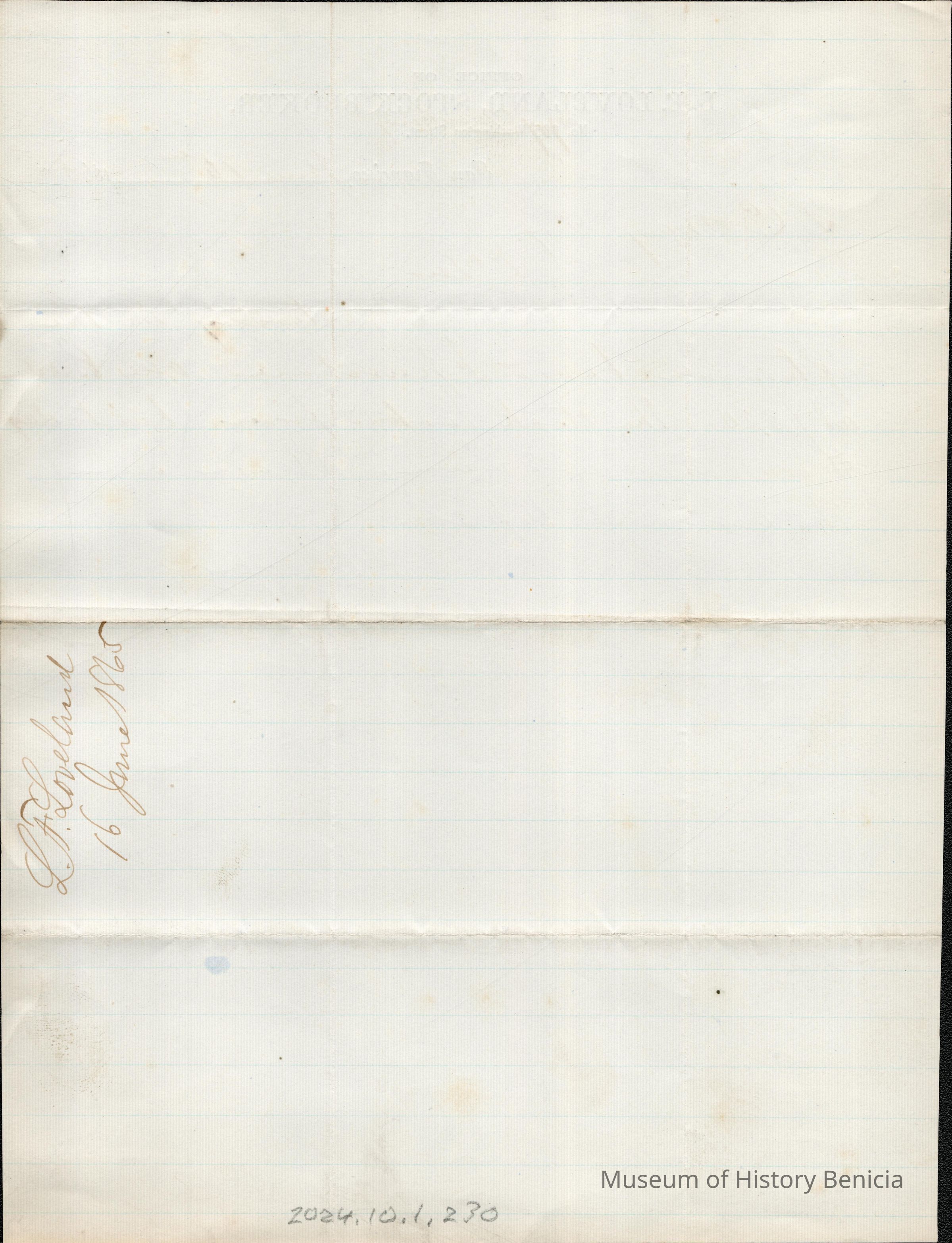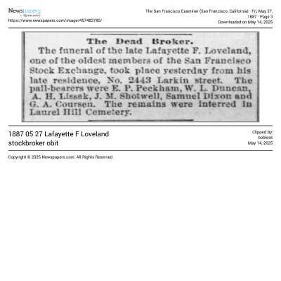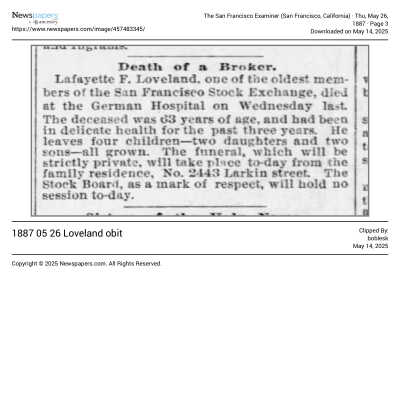 The image is a handwritten letter on stationery from the office of L.F. Loveland, a stockbroker located at 407 Montgomery Street, San Francisco, dated June 10, 1865. Addressed to "S. C. Gray Esq," the letter informs Mr. Gray of a recent stock transaction involving the purchase of shares in a company identified as "Belden" at a price of $820. The broker, L.F. Loveland, notes that while the stock appeared firm the previous day, there has been a decline in value. The letter concludes with a request for a payment of $4500 and is signed by L.F. Loveland. The text is written in a cursive script in brown ink on lined paper.