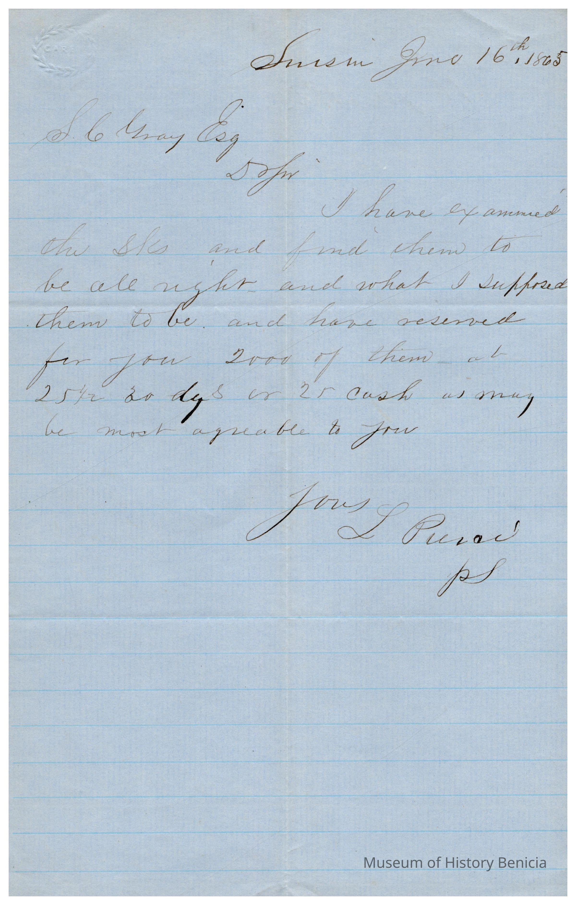 This is a letter to Samuel C Gray from C L Pierce dated 06/16/1865 regarding some stocks. The stocks are priced at $25.25 per share and the broker is holding out 2,000 for Samuel C Gray ($50,500 total).Collection