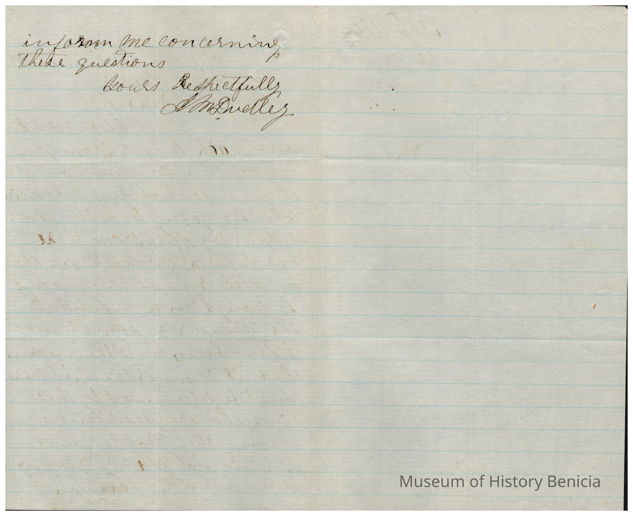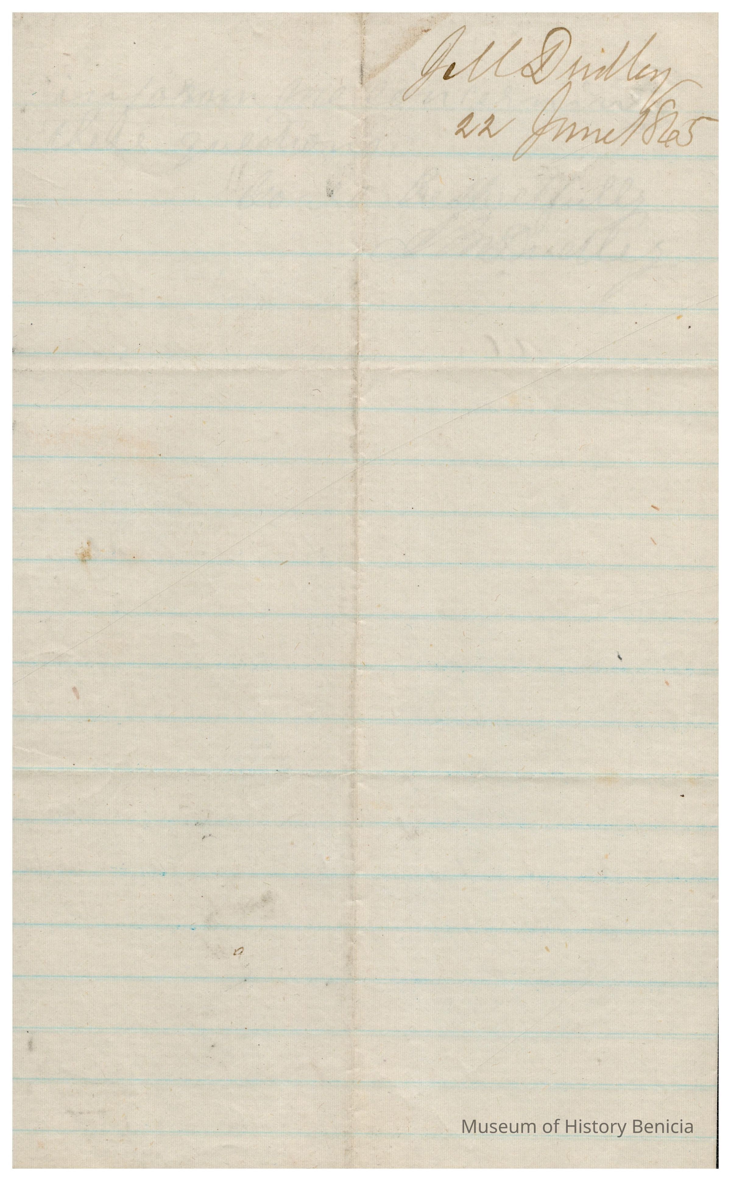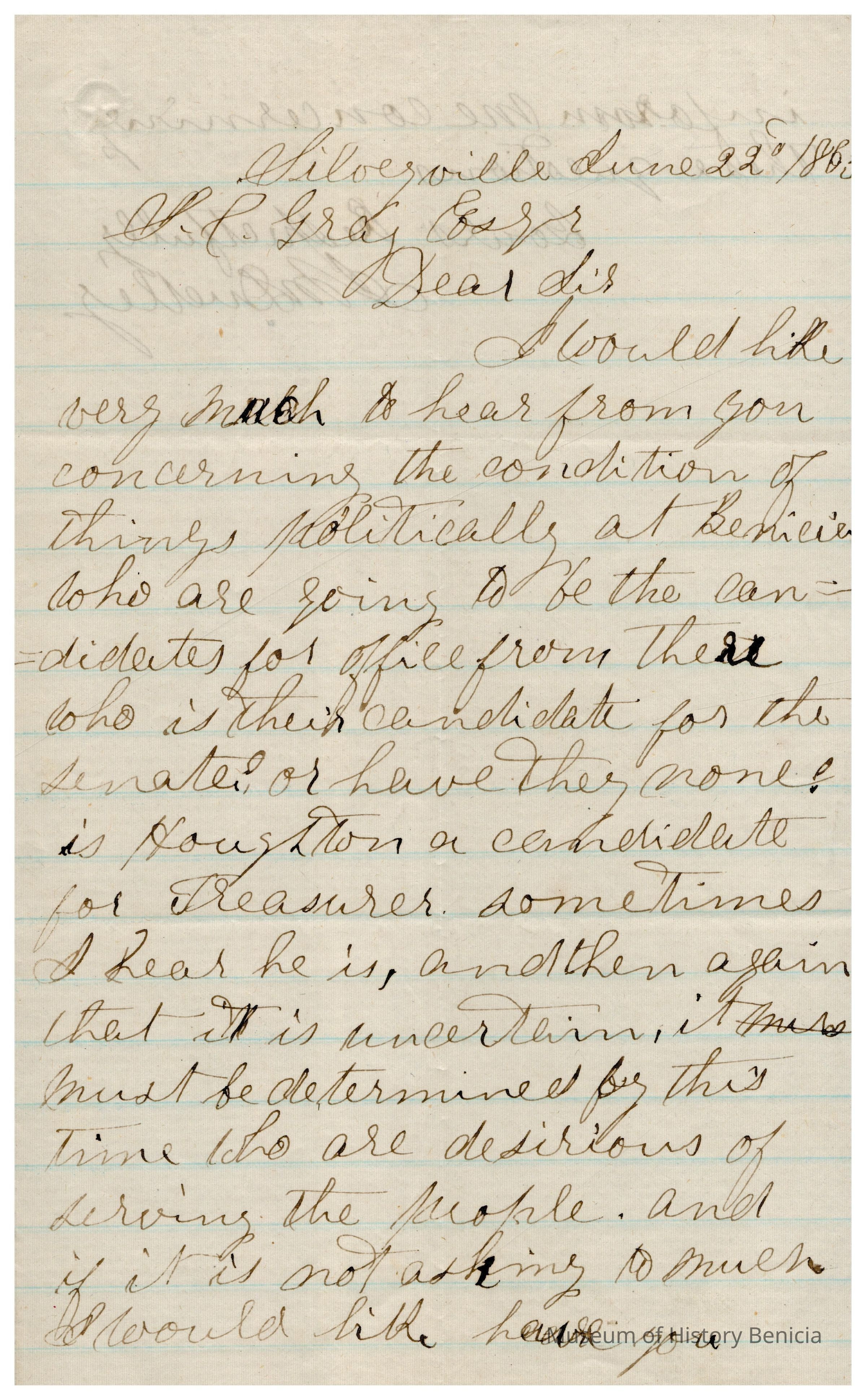 This is a letter to Samuel C Gray from J. M. Dudley dated 06/22/1865 regarding politics in Benicia. Mr. Dudley is from a now non-existent town in Solano County called Silveyville (it became Dixon). He asks specifically about C.B. Houghton and if he is considering running for Treasurer.Collection