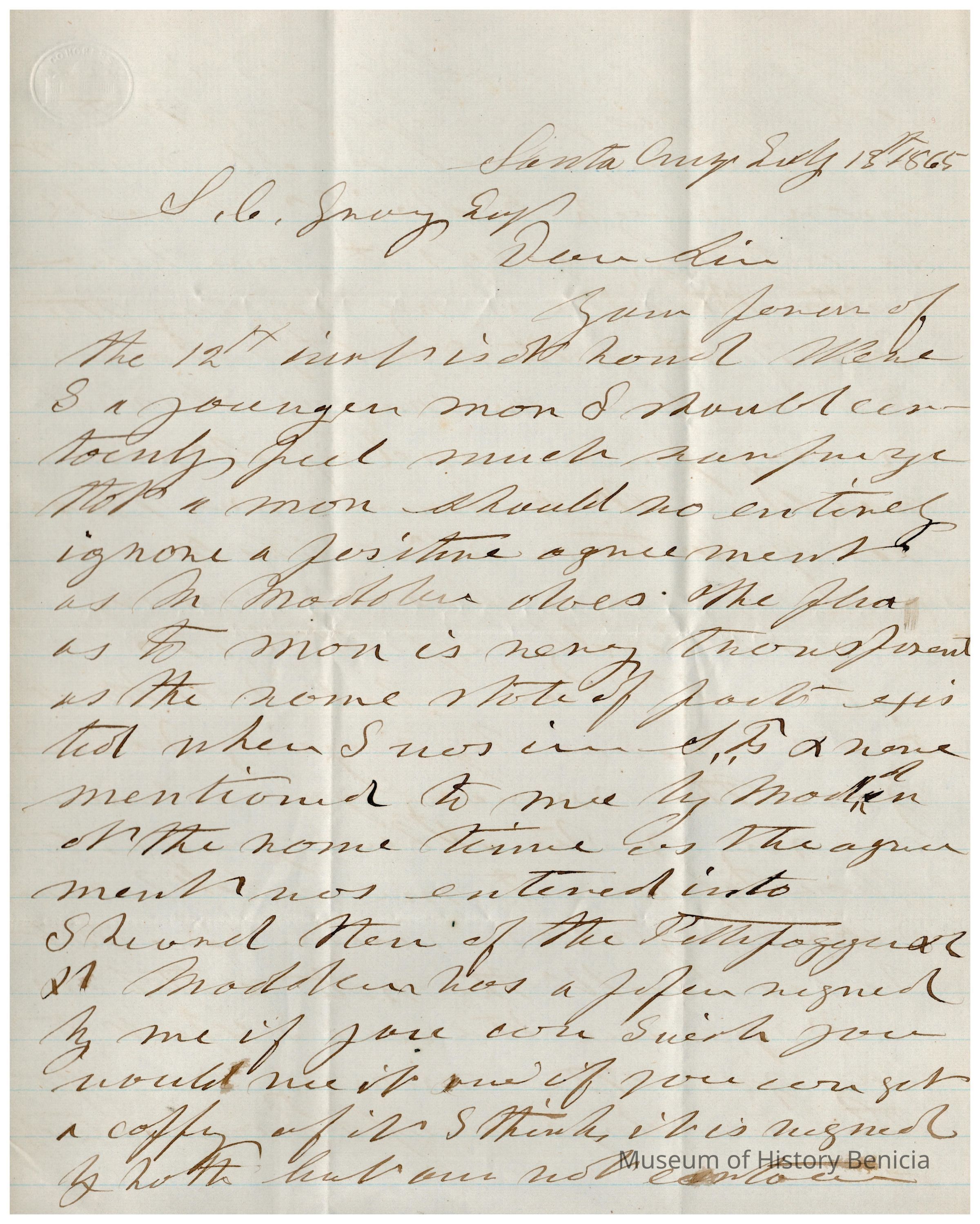 This is a letter to Samuel C Gray from Dr. W. F. Peabody dated 07/18/1865 regarding money he owes. The handwriting is very hard to read.Collection