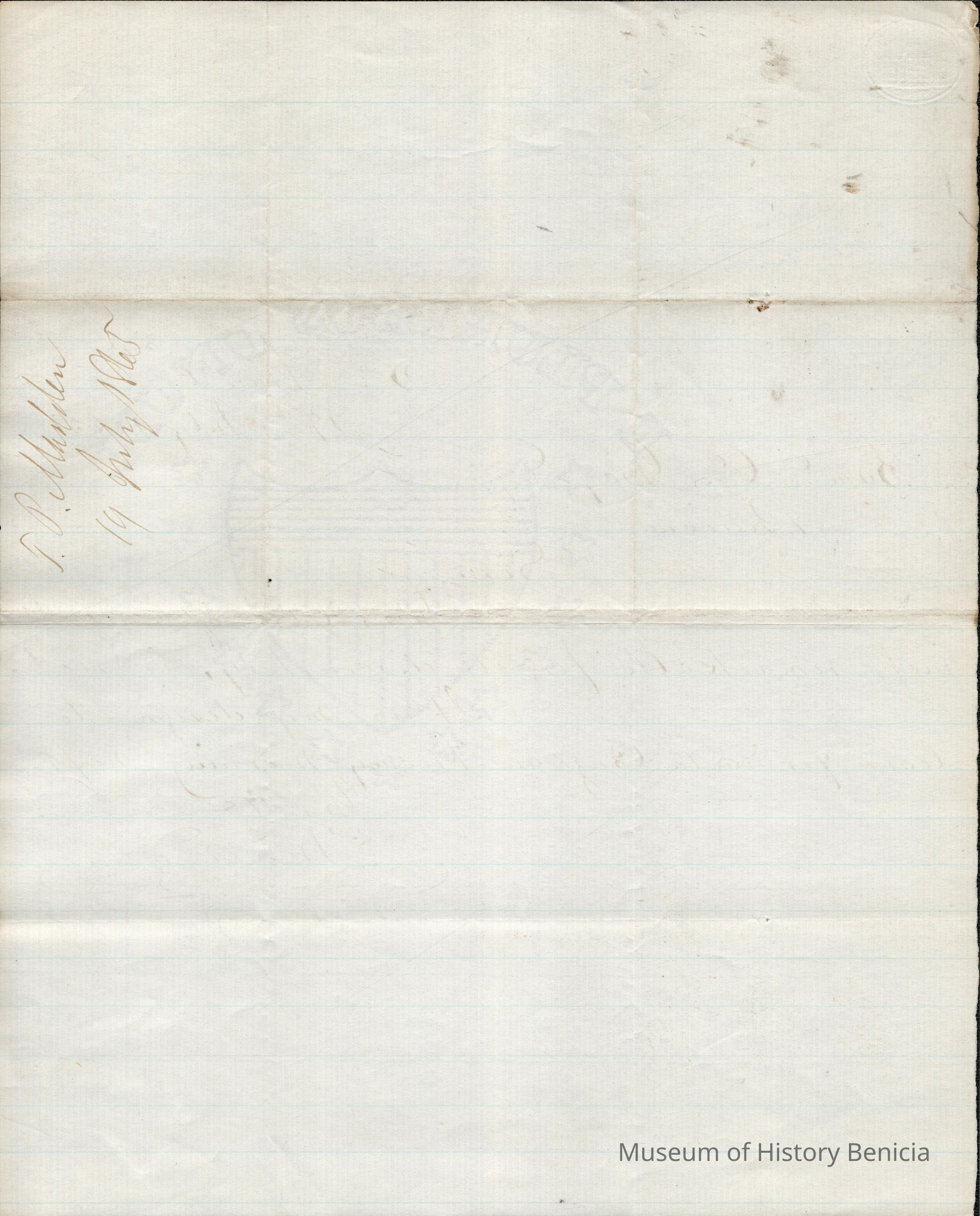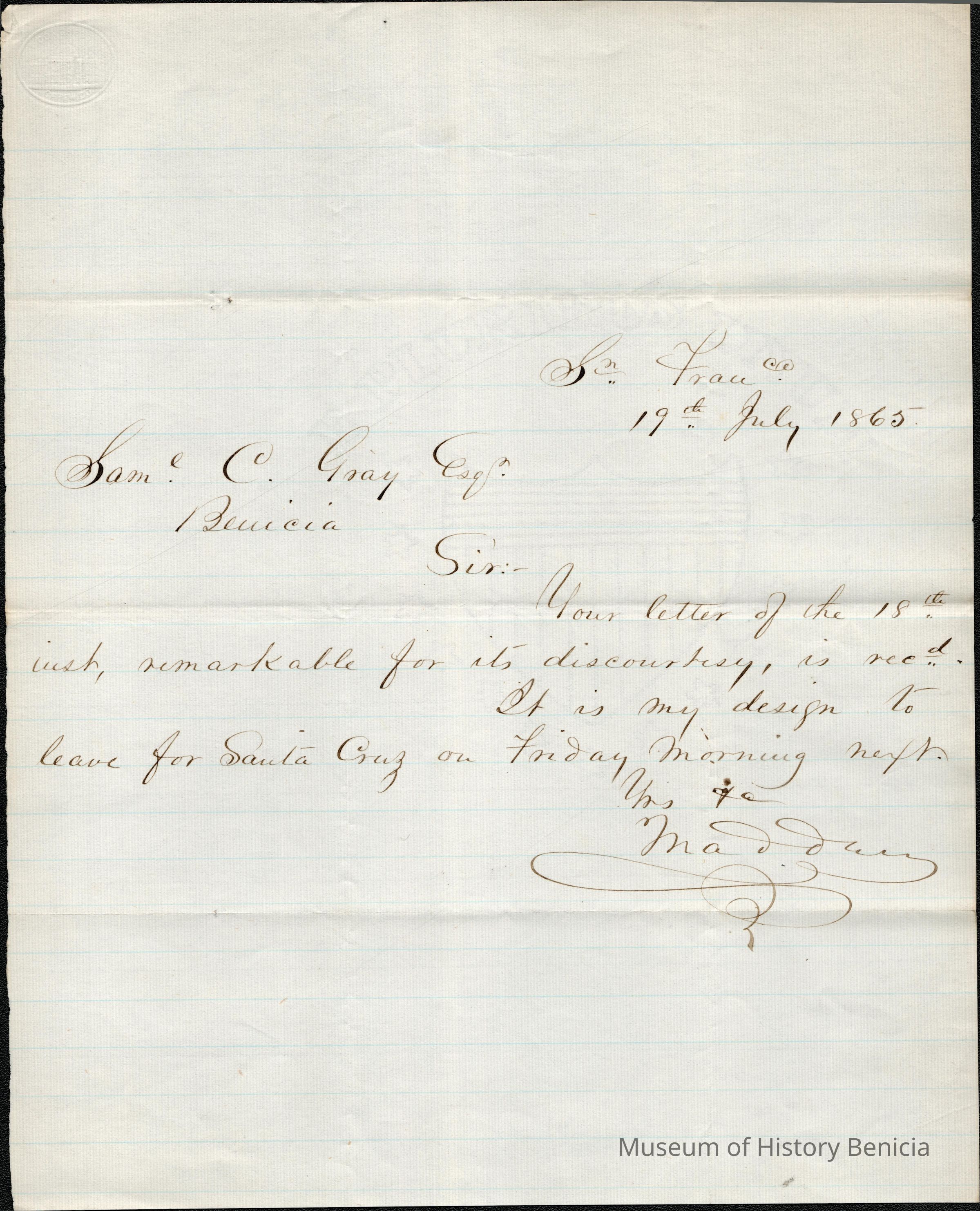 This is a letter dated 07/19/1865 from Mr. Thomas P. Madden to Samuel Gray. Mr. Madden writes about how discourteous Mr. Gray was in his last letter and that he is leaving for Santa Cruz.