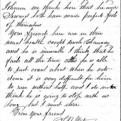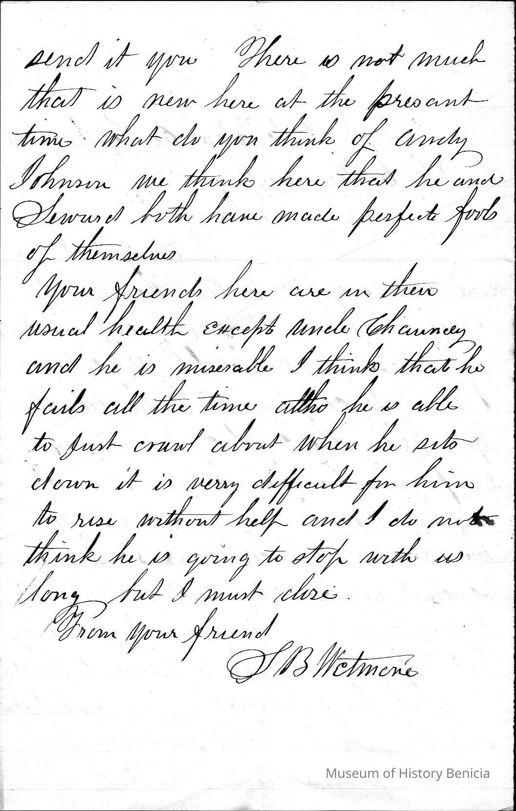 Mr. Wetmore mentions his opinion of President Andrew Johnson and Mr. Seward. He also comments on his uncle Chauncey Wetmore's health (Samuel Gray's brother-in-law who preceded him to California.)Collection