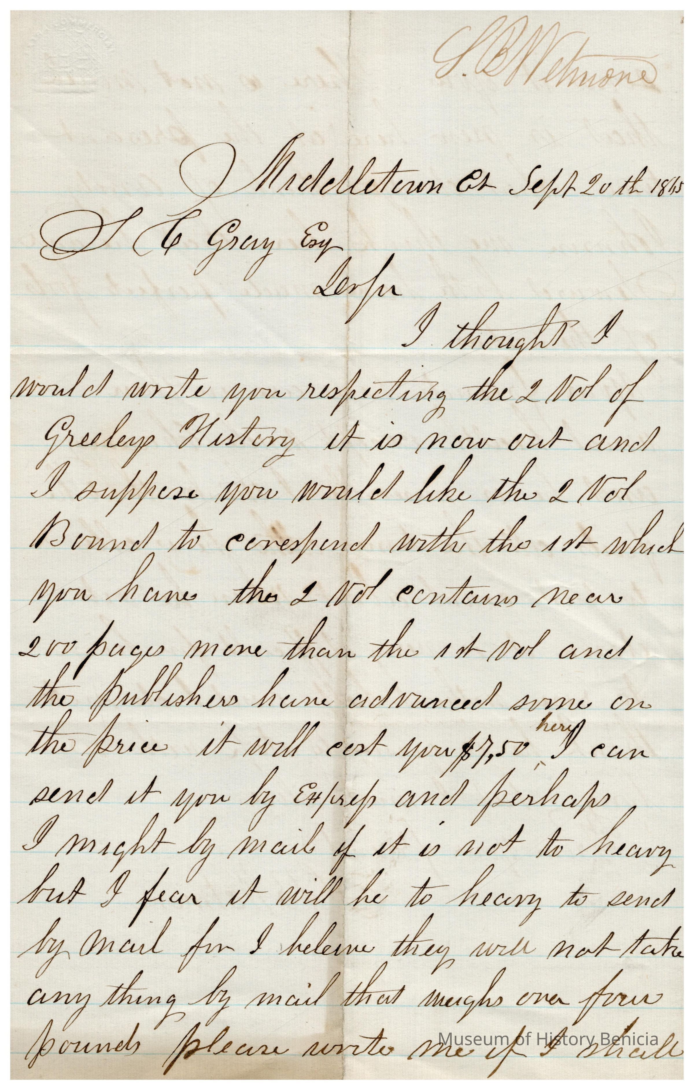This is a letter to Samuel C Gray from S. D. Wetmore dated 09/20/1865 regarding purchasing the second volume of a publication by Horace Greeley. Most likely this is Mr. Greely's 2 volume text on the Civil war ("The American Conflict: A history of the great rebellion in the United States of America").