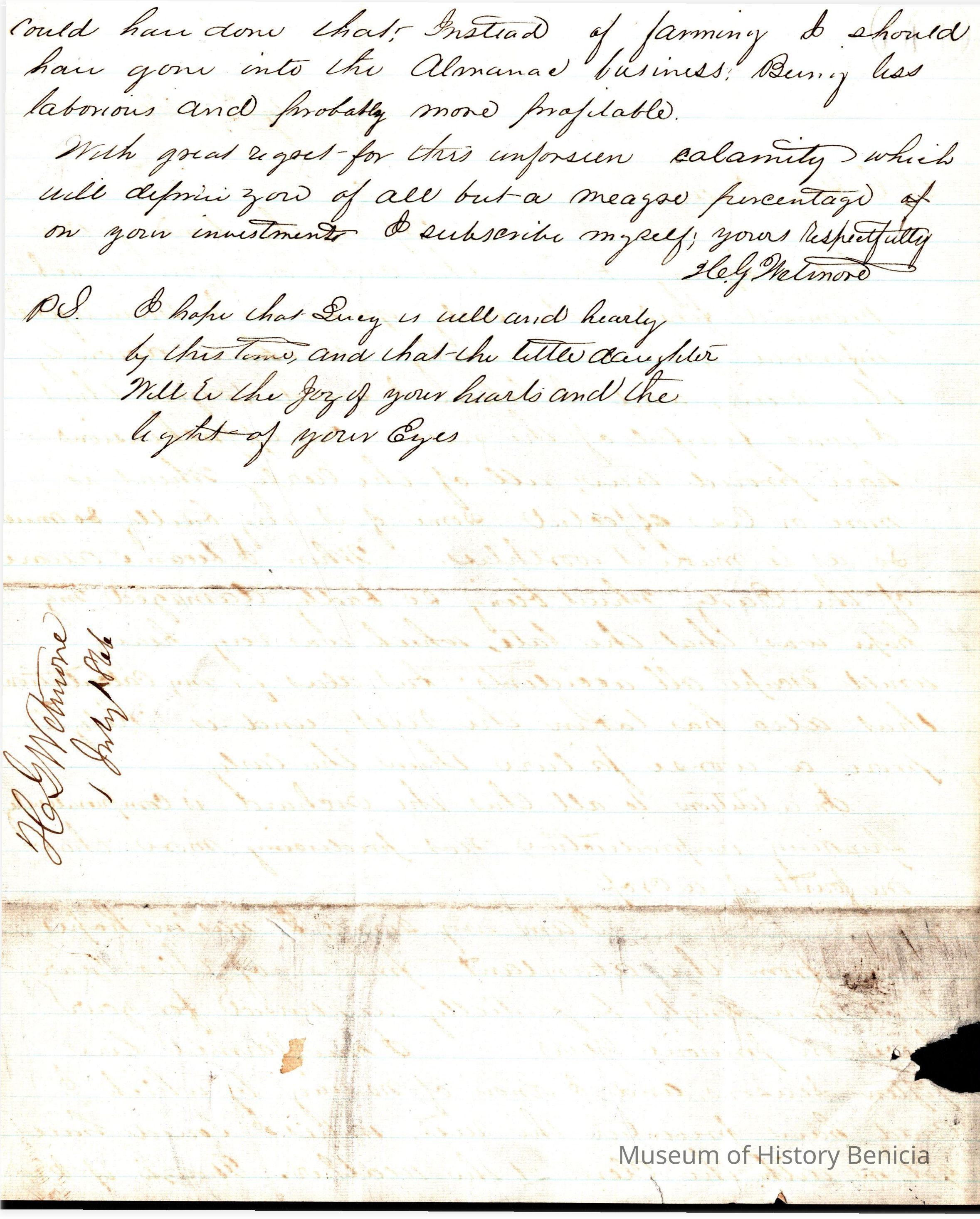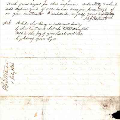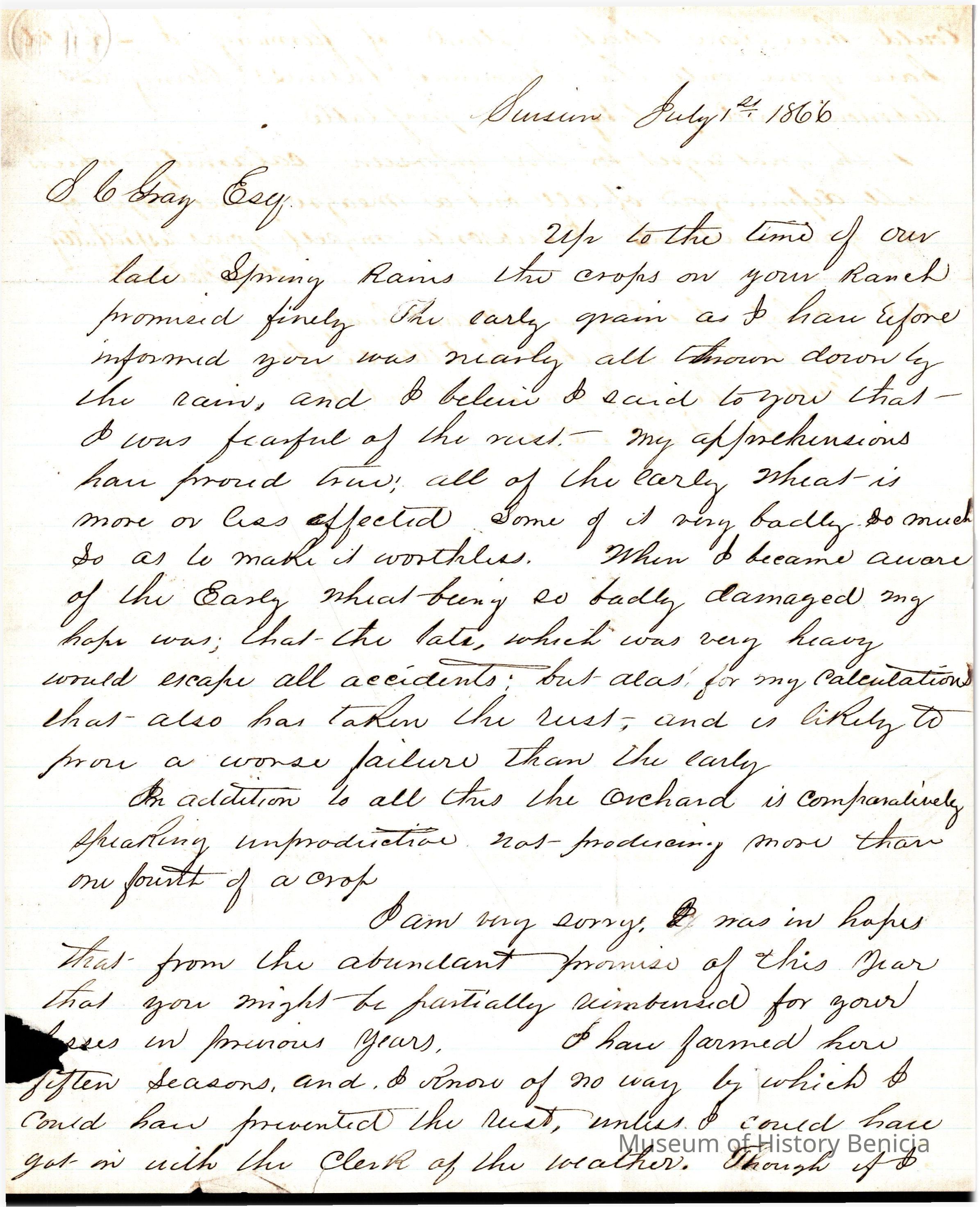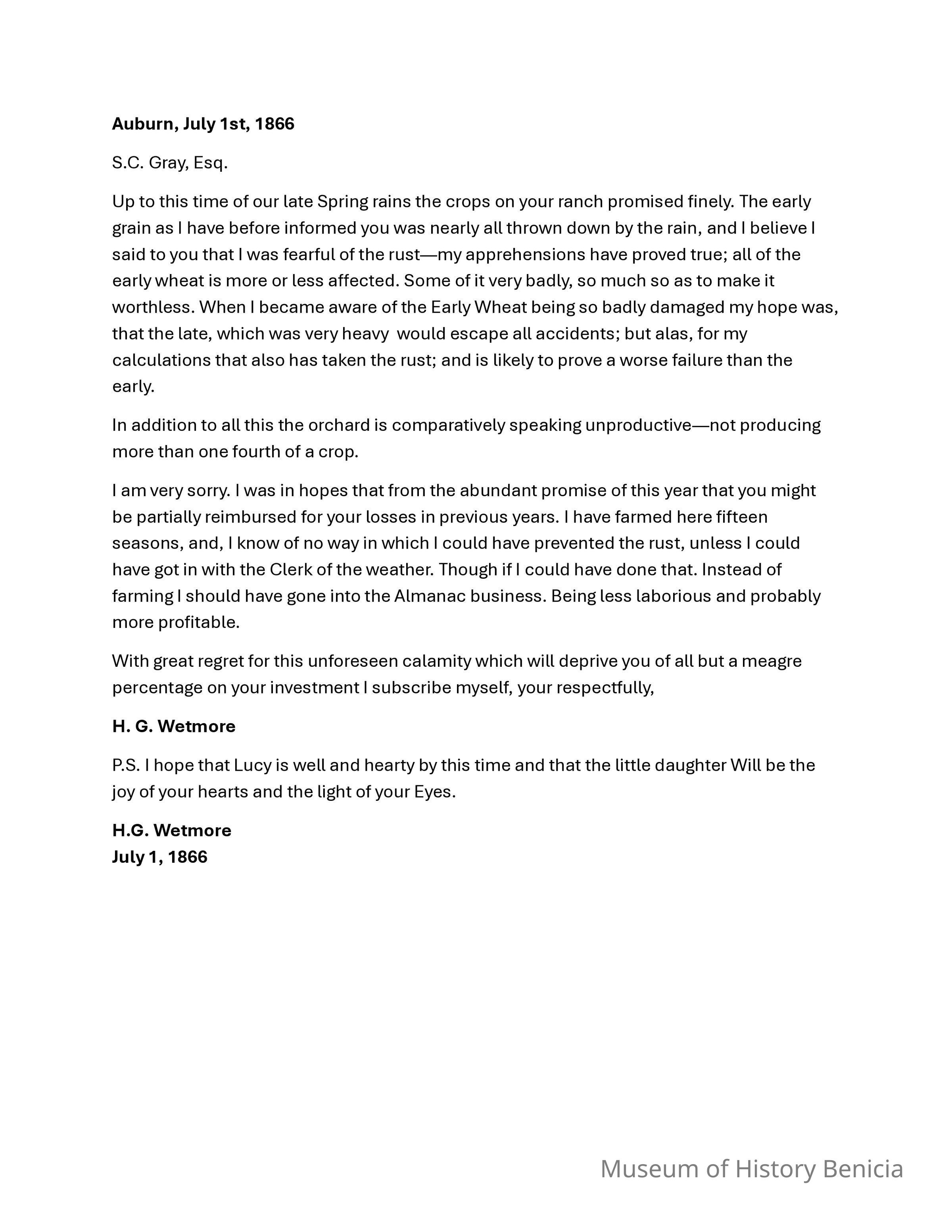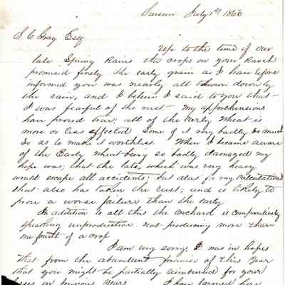 This is a letter from Henry Wetmore to Samuel C Gray dated 07/01/1866. Henry is Samuel's brother-in-law. The letter dated July 2, 1866, from Henry Wetmore to Samuel Gray provides an update on the agricultural situation at Gray's ranch, affected by late spring rains. Wetmore explains that early grain crops were almost entirely destroyed by the downpours, confirming his earlier fears and rendering many of the crops worthless. Despite hopes that the late-seeded wheat would avoid similar damage, it too succumbed to the persistent wet conditions, resulting in an even more disappointing yield. Additionally, the orchard is underperforming, producing only about a quarter of the expected output. Wetmore expresses regret and disappointment, noting that predictions of an abundant harvest have been dashed due to uncontrollable weather conditions, which no foresight could have prevented.