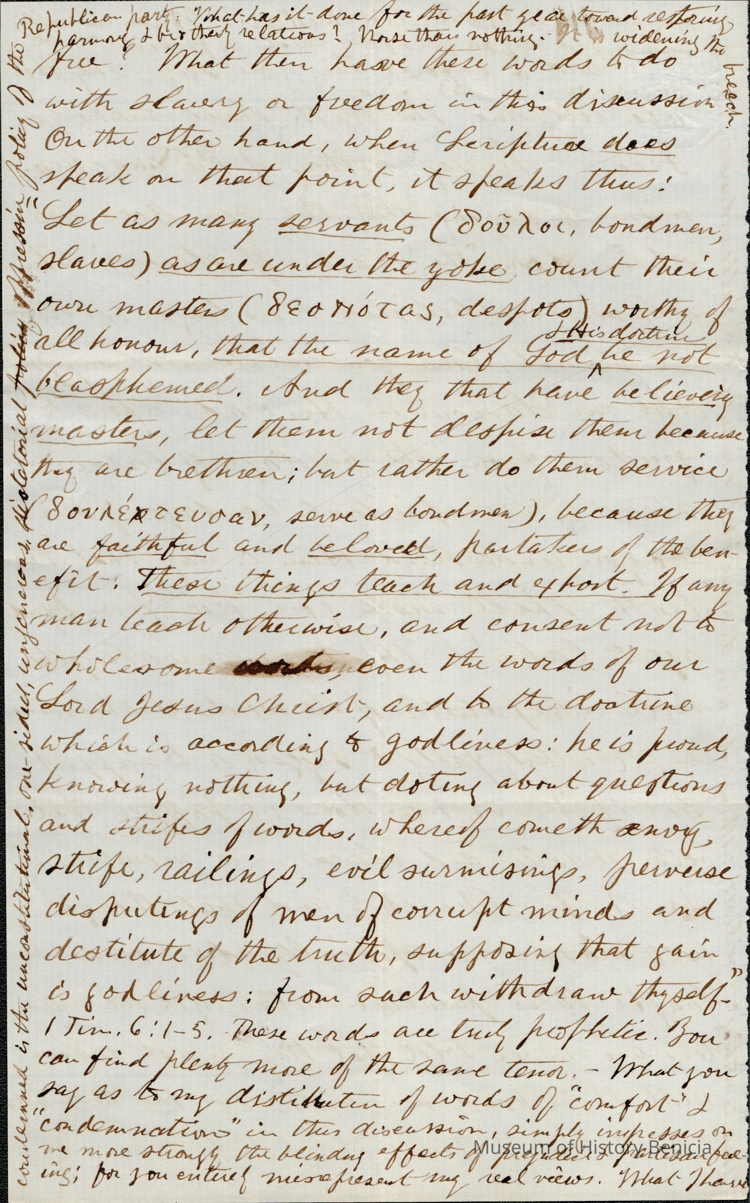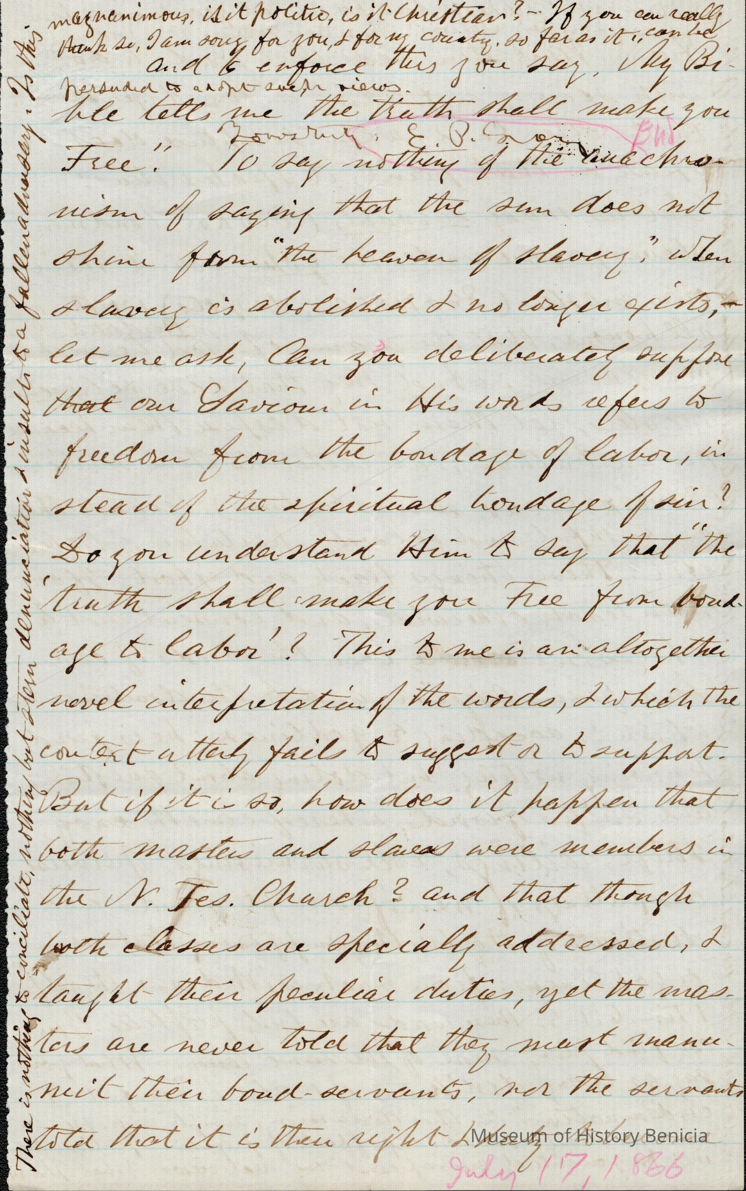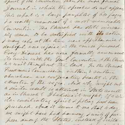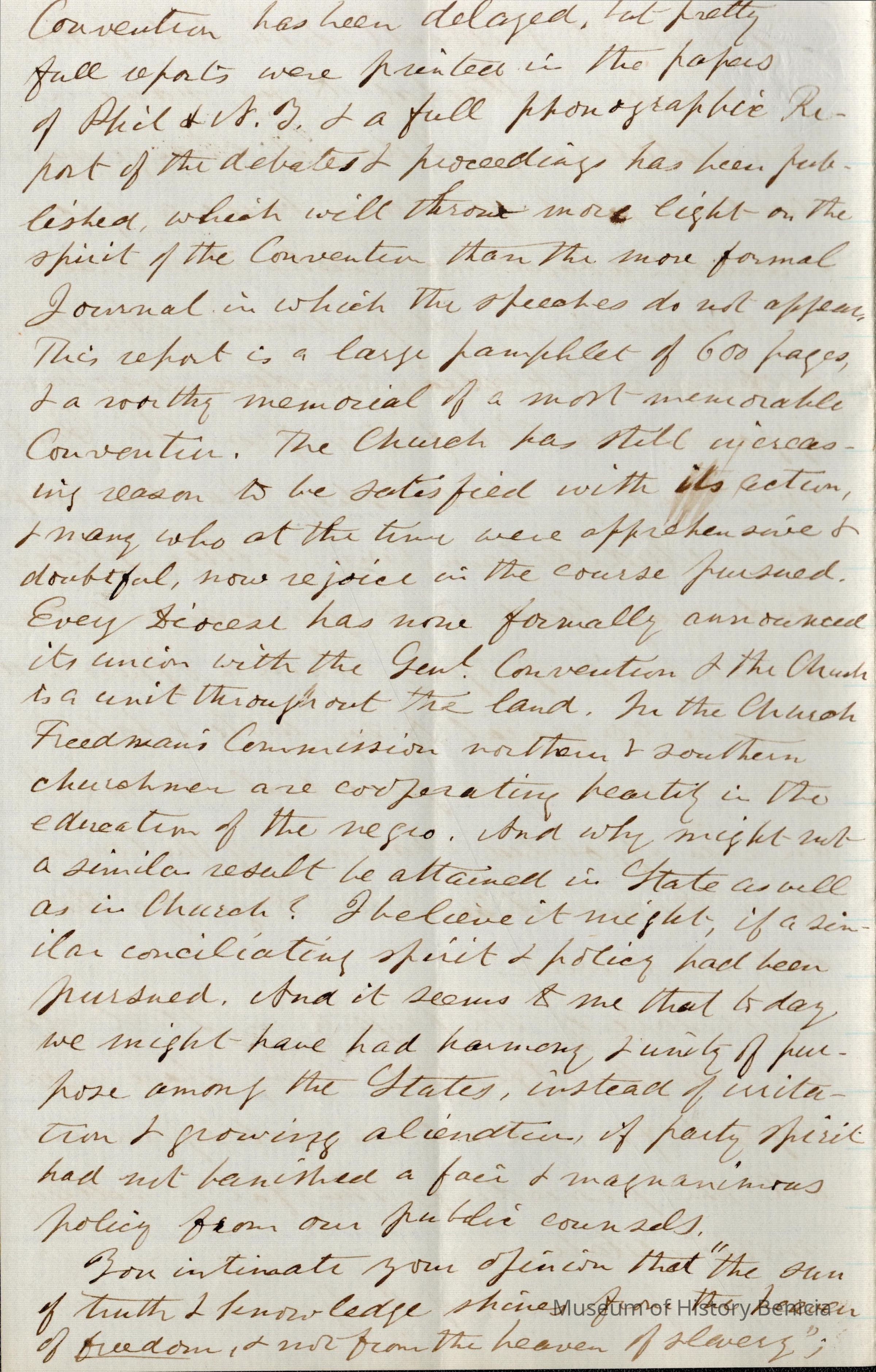 Edward also talks of his being a professor and giving lectures. He mentions writing a book with 500 copies published. Next he discusses the church's Freedmen Commission and its endorsement of educating the freed slaves. Lastly, he gives a philosophical discussion of how this spirit could have avoided the conflict.