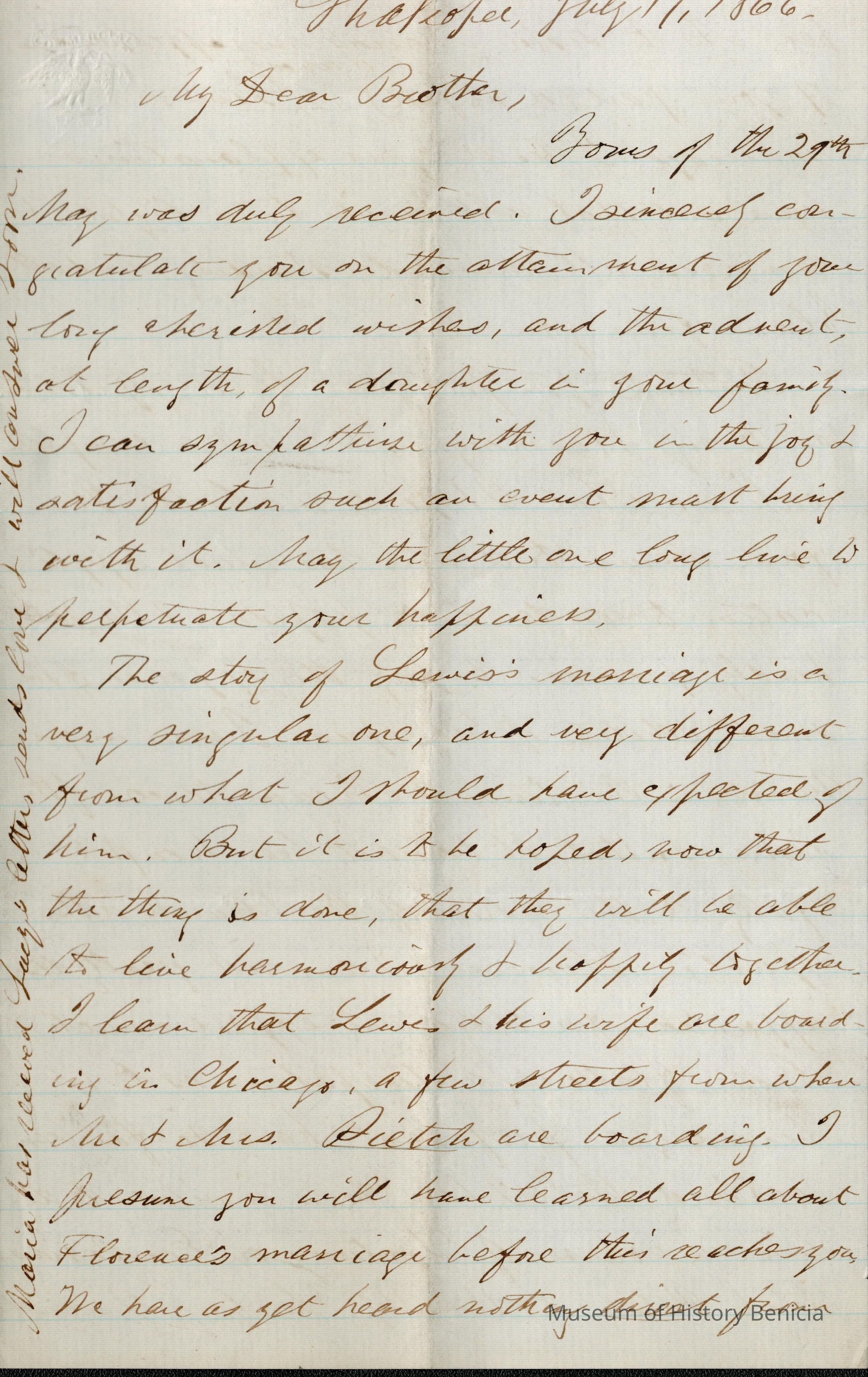 This is a letter dated 07/17/1866 from Mr. Edward Gray to Mr. Samuel C. Gray regarding mostly family matters. He starts by congratulating Samuel on the birth of a daughter (Lucy Gertrude Gray 1866 - 1937) and mentions the marriage of a relative named Lewis. (This could be Lewis Gray Wells (1841 - 1913) who married (05/21/1866) Mary Ellen Wetmore (1834 - 1874).