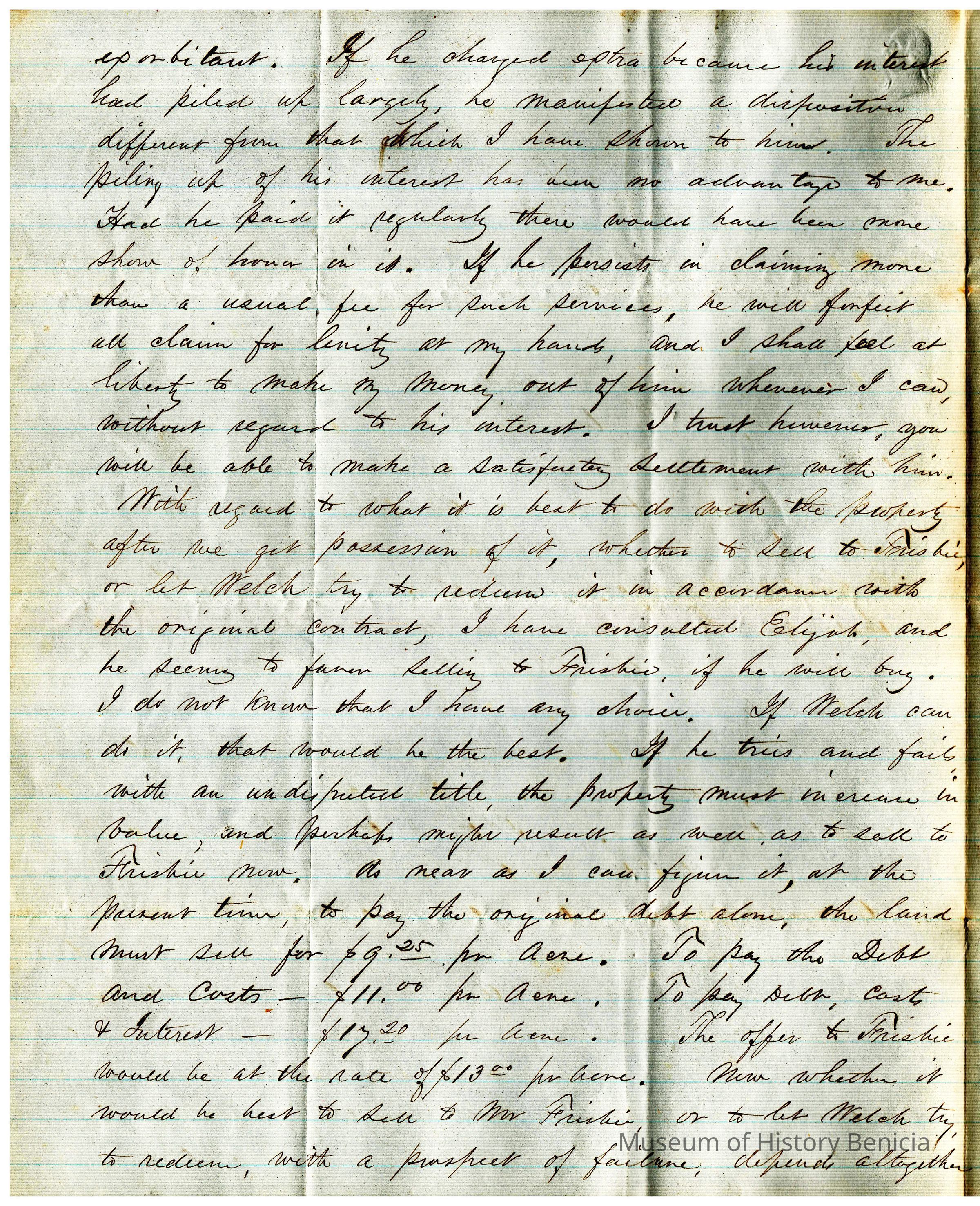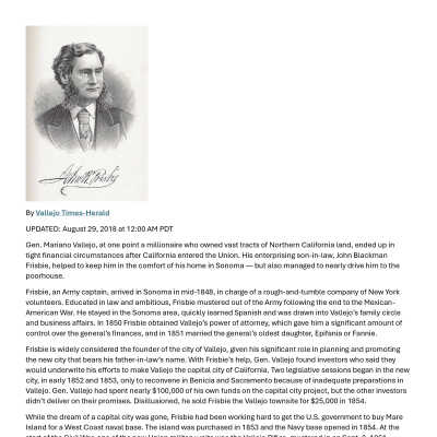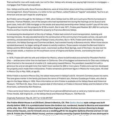 The Frisbee mentioned in the letter is probably John B. Frisbe who was the son-in-law of General Vallejo. In 1866 he was a very rich man in the Vallejo-Benicia area. His biography is shown below.