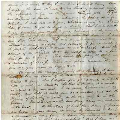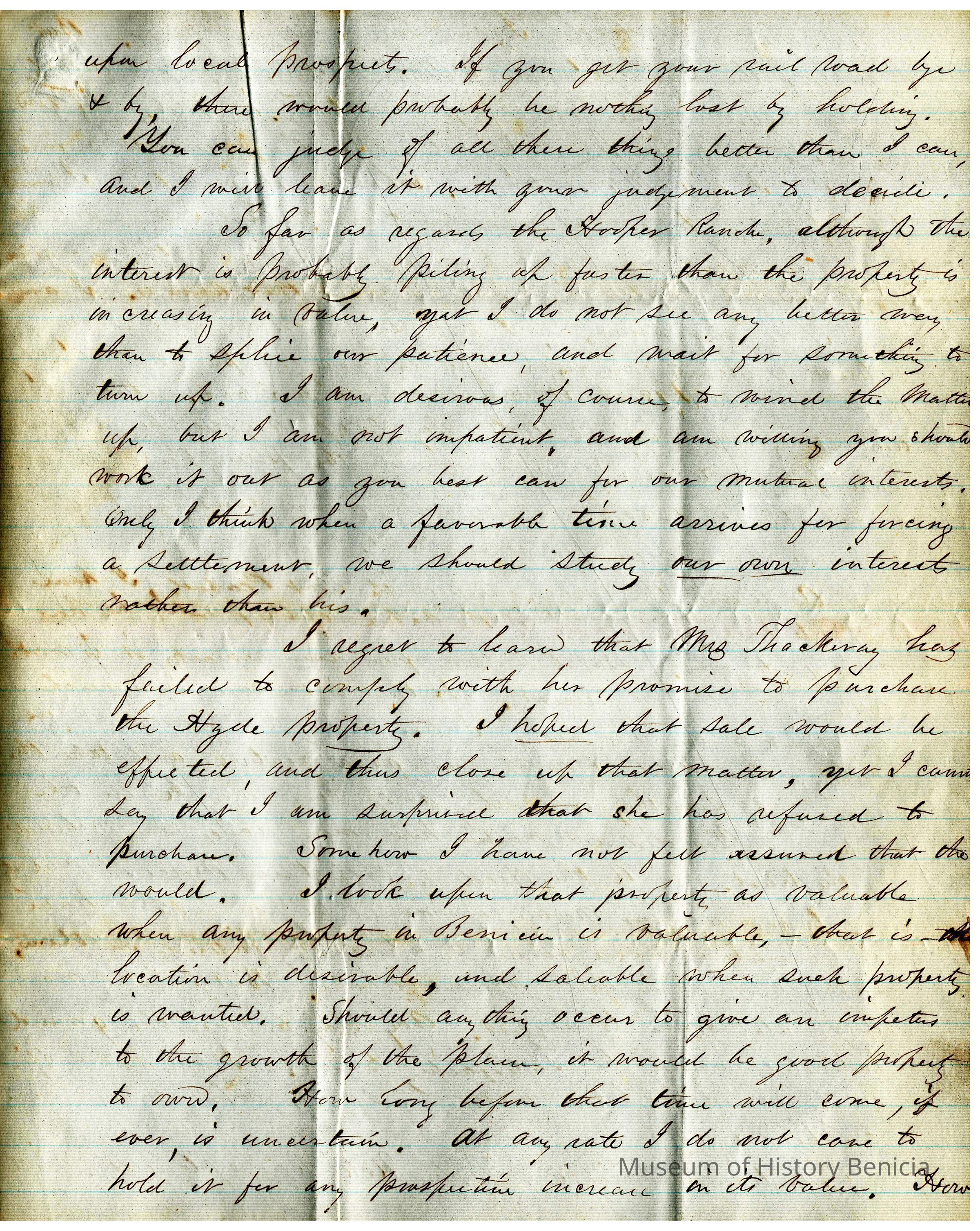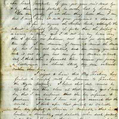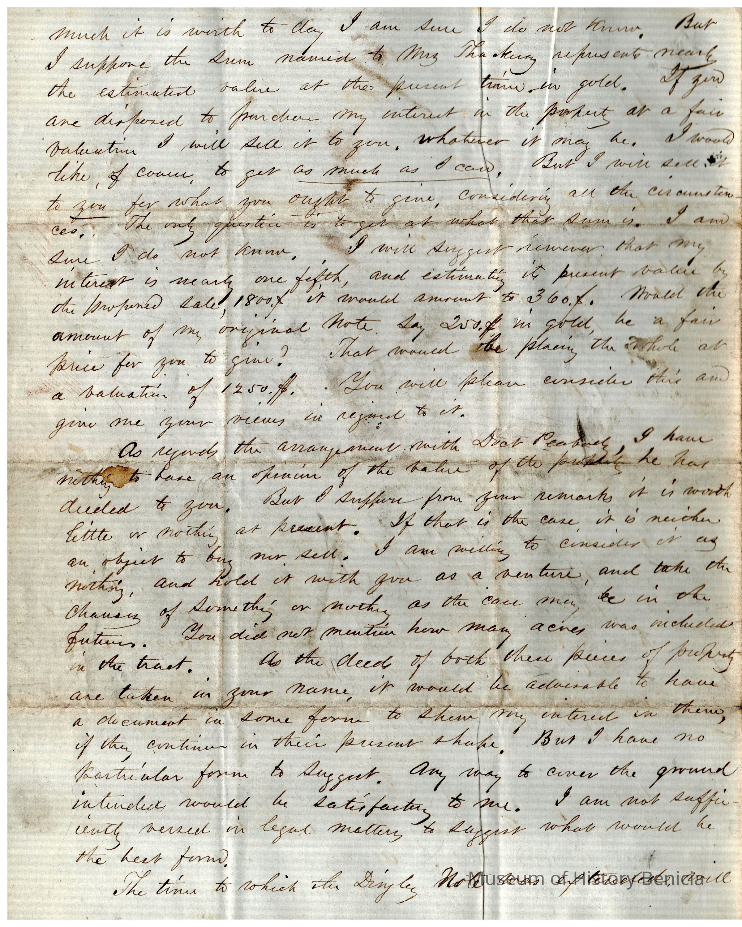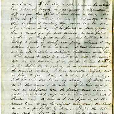 This is a letter from Edward Crocker in North Bridgewater, MA to Samuel C Gray in Benicia dated 12/08/1866. The letter mainly discusses the properties and loans that are now viable since the Suscol Ranch question has been settled. Mr. Crocker is glad the "Boles Woodbridge" situation is now cleared up. He is having some disagreement with Judge Swan about the interest on his loan. Mr. Crocker then brings up the topic of what to do with the properties once they are deeded over. One option is to sell them to Mr. Frisbe and the other is to let Mr. Welch redeem them. Options range from getting $9.25 to $17.20 per acre with the offer from Frisbie at $13.00 per acre. He then talks of Mrs. Thackery not wanting to buy the Hyde property and that he is willing to sell his 1/5th share to Gray for $250. The last item mentioned is the property from Dr. Peabody which was deeded over to Mr. Gray. The letter says little about this land.