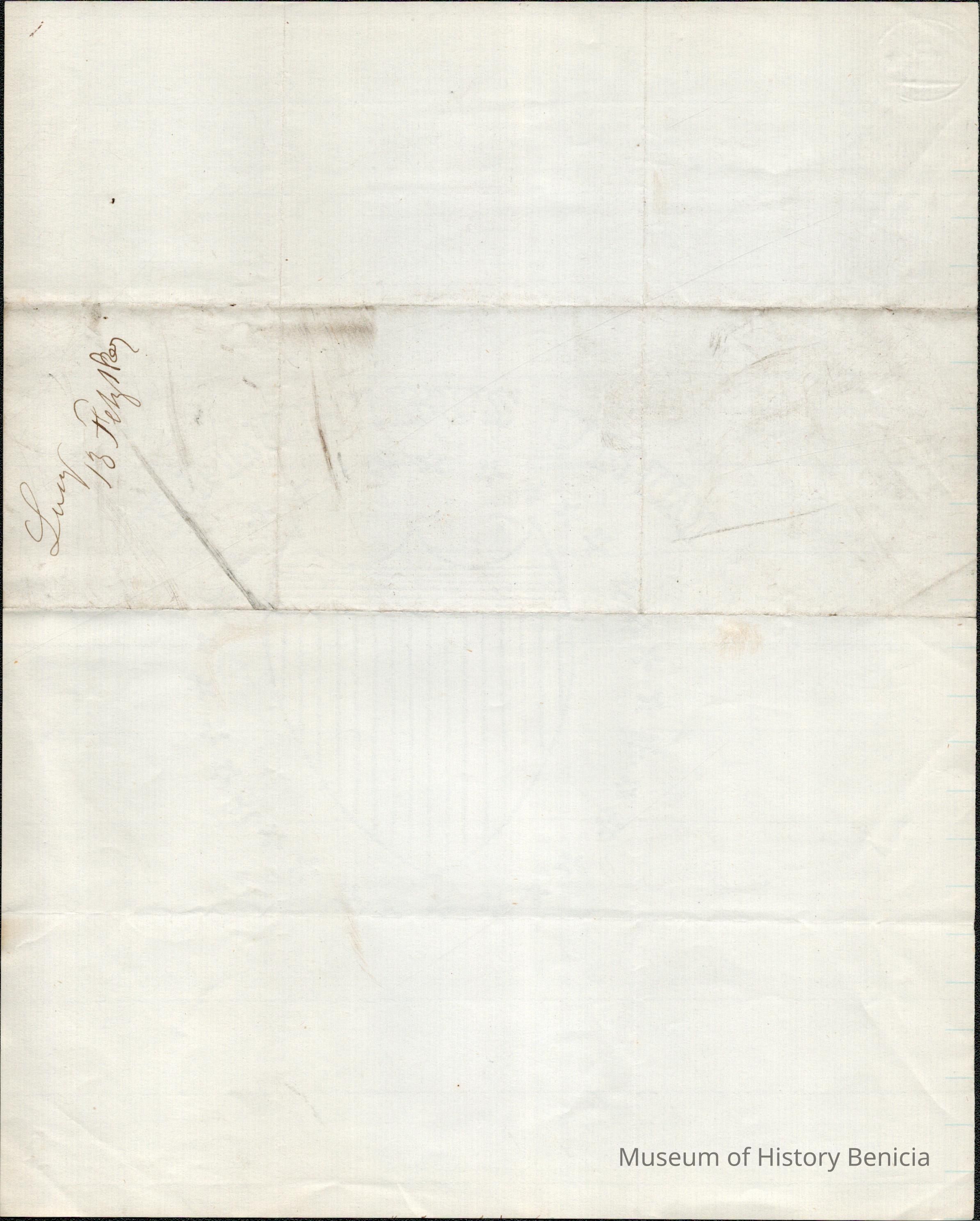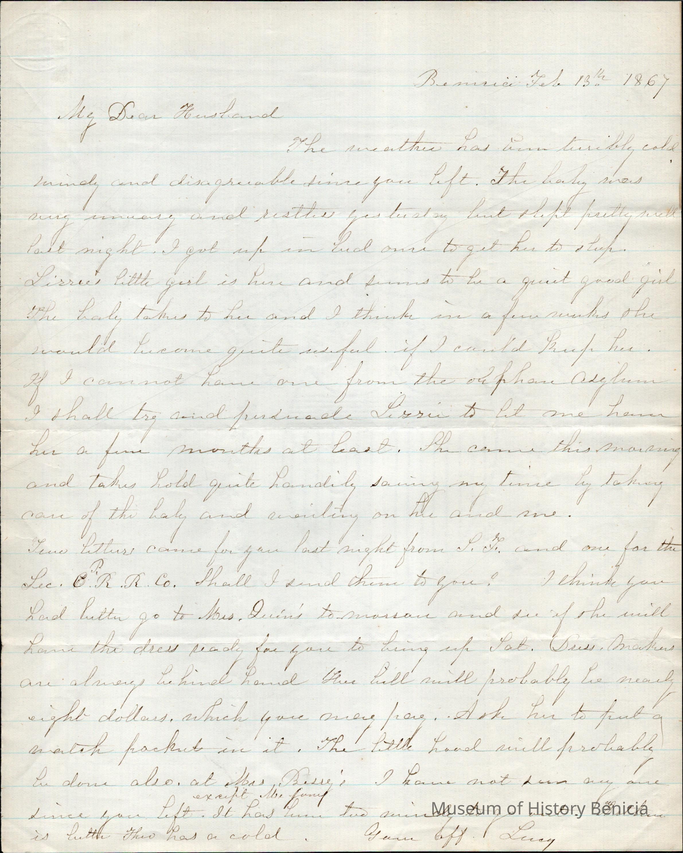 This is a letter from Lucy Wetmore Gray in Benicia to her husband Samuel C Gray probably in S.F. (or maybe Santa Cruz where he had a tannery.) She mentions things she would like him to buy for her and that two letters from C.P.R.R. came for him. She also talks about a maid she has and would like to keep if she can't have "one from the orphan asylum".