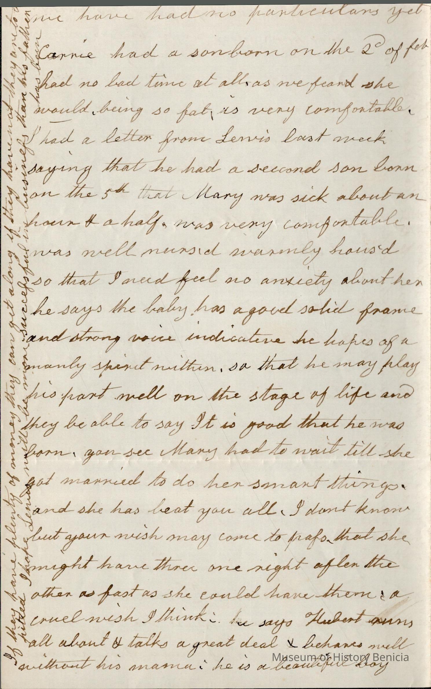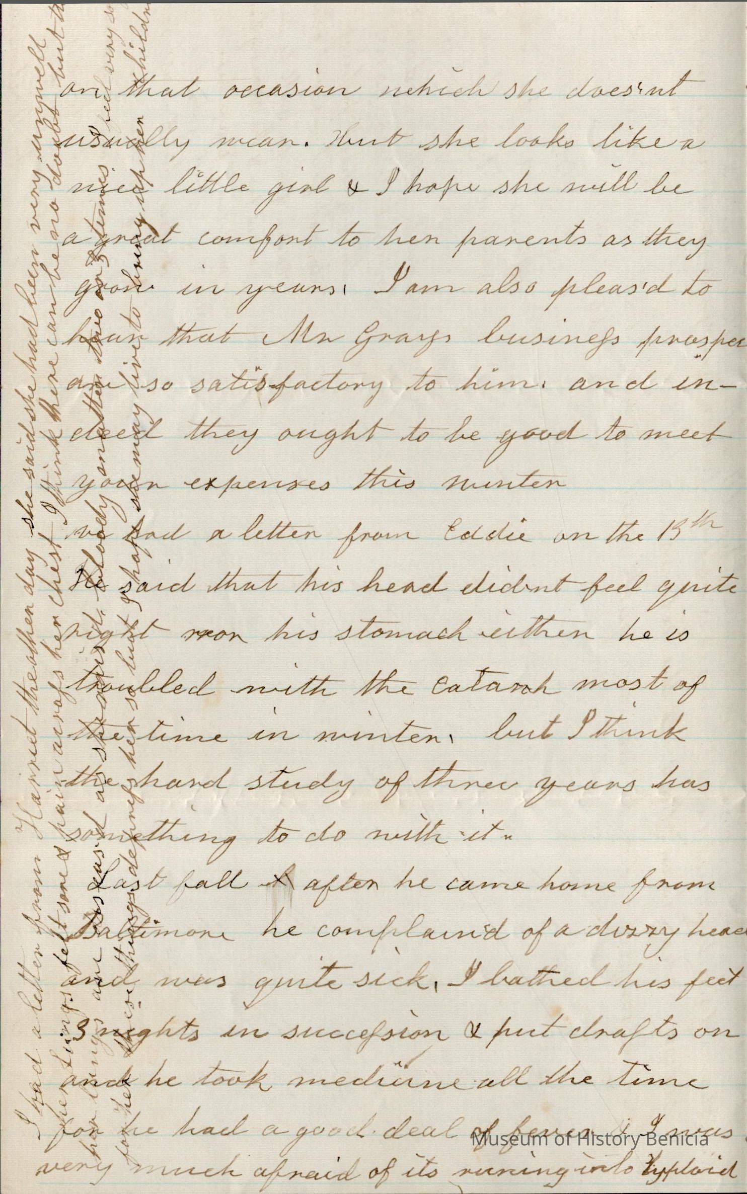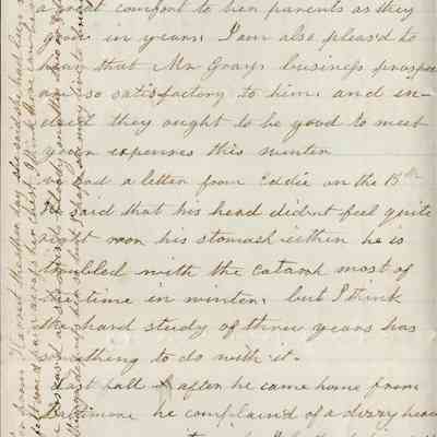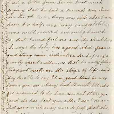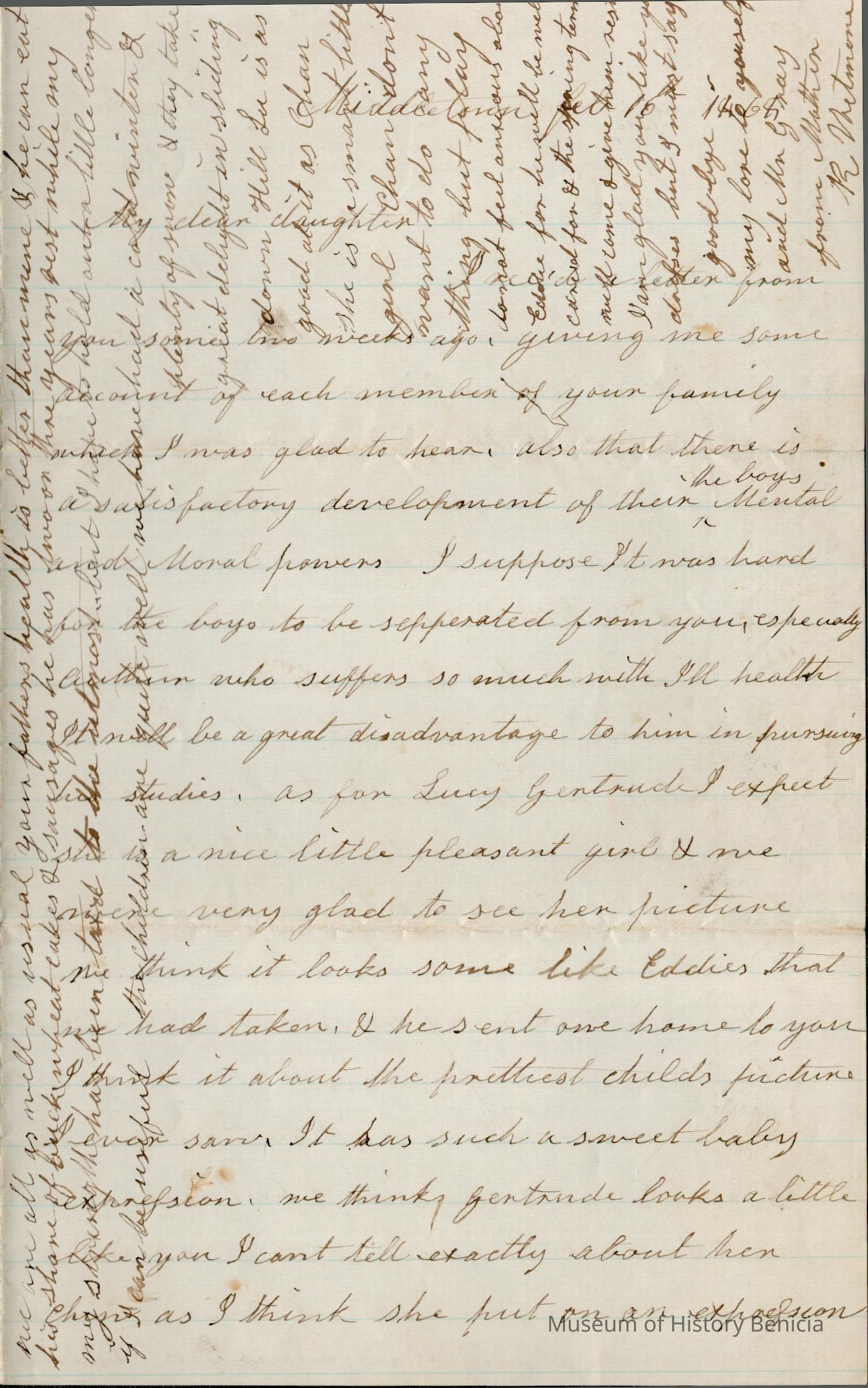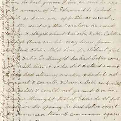 This is a letter dated 02/15/1868 from Rebecca Wetmore to her daughter, Lucy Wetmore Gray, regarding family matters. She mentions Lucy's children; "Arthur (Samuel Arthur Gray - 1853 -1921), Lucy Gertrude Gray (1866 - 1937), Eddie Gray (1849 - 1926). She also mentions Lewis Wells and Mary Wetmore's children; Phillip Patterson Wells (02/05/1868 - 1929) and Hubert Wells (1866 - 1949). She tells Lucy of the death of Edward Treadwell a friend she stayed with in New York when she was visiting the East.