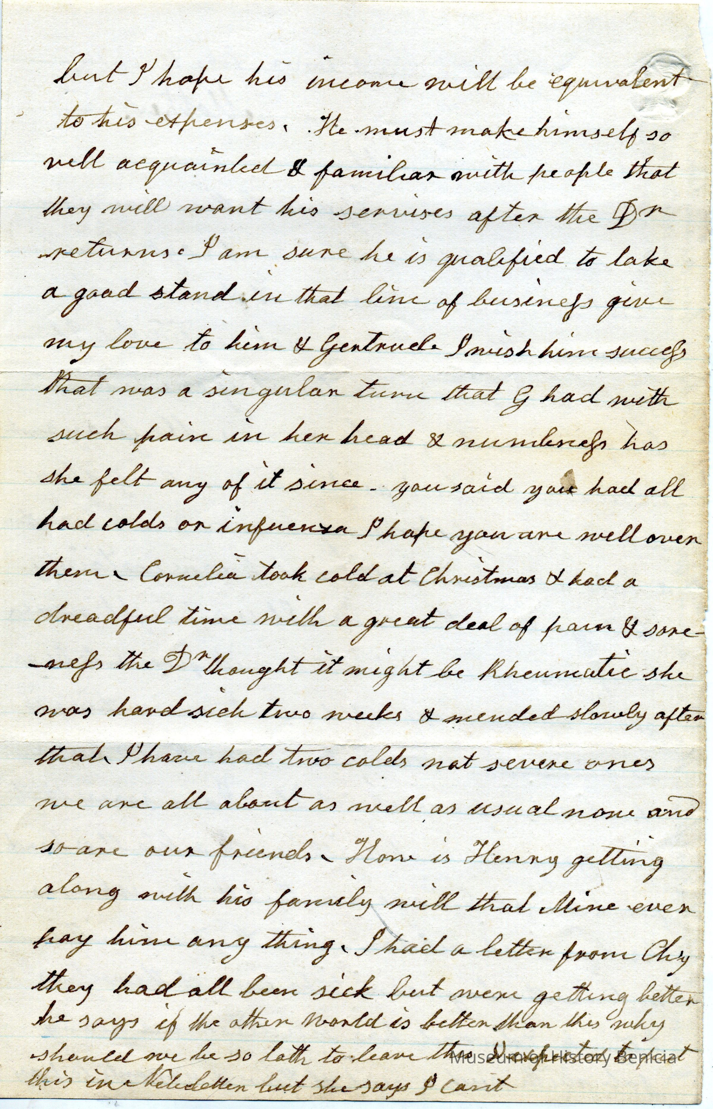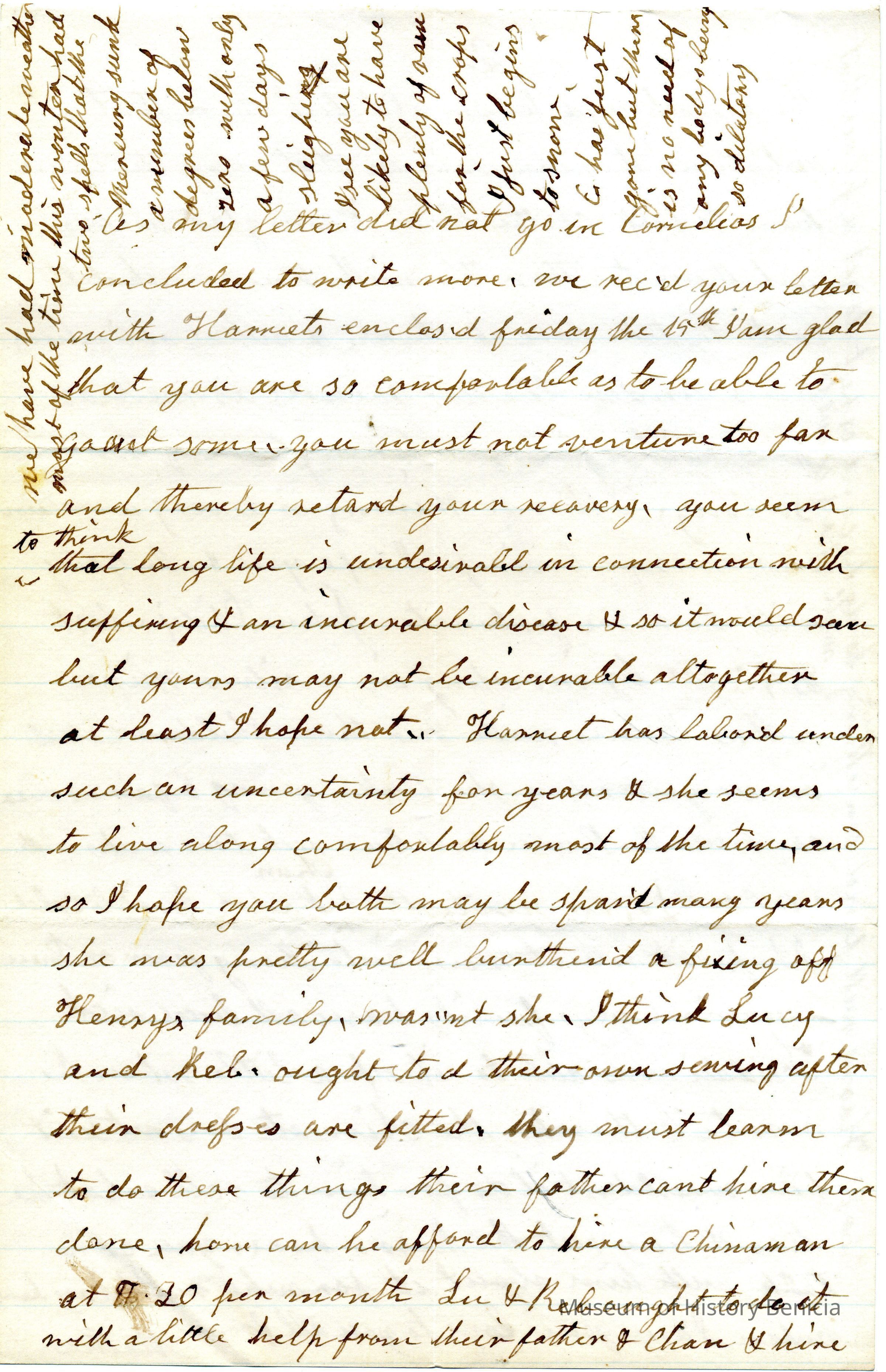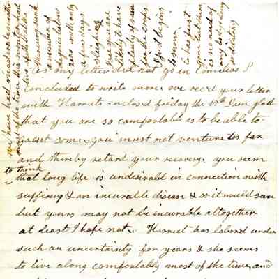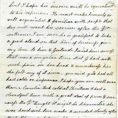It looks like Cornelia added a part to the end of the letter. She tells Lucy to not do too much so as to slow her recovery. (This letter is less than 1.5 years before her death.)Collection
