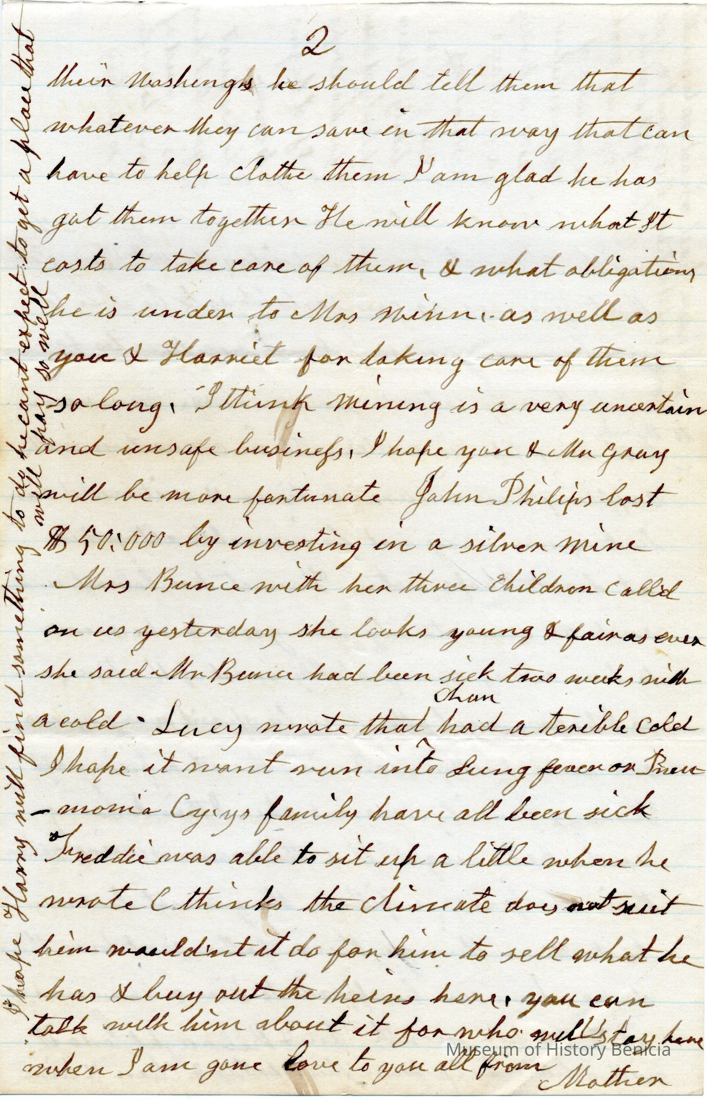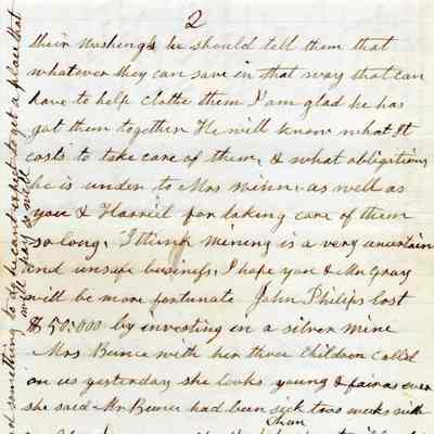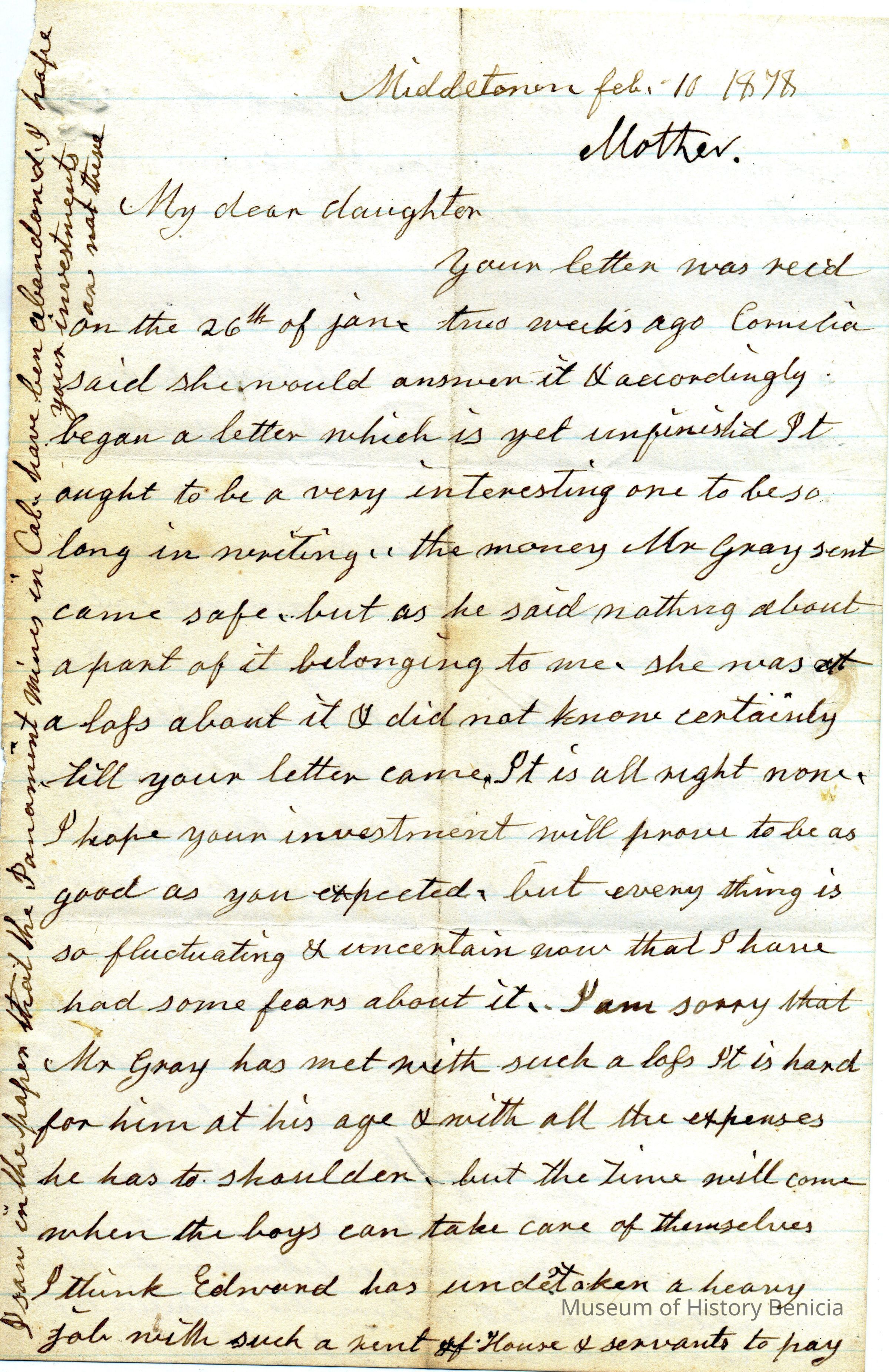 This is a letter from Rebecca Hubbard Wetmore (1795 - 1885), to her daughter Lucy Wetmore Gray (1820 - 1879) dated 02/10/1878. She mentions that another daughter, Cornelia (1830 - 1933), started a letter but hasn't finished it. She also says she received the money that Mr. Gray sent but later in the letter is sorry that he has had such financial reverses at his age. She is worried he may have invested in the Paramount mine which she has read have been abandoned.