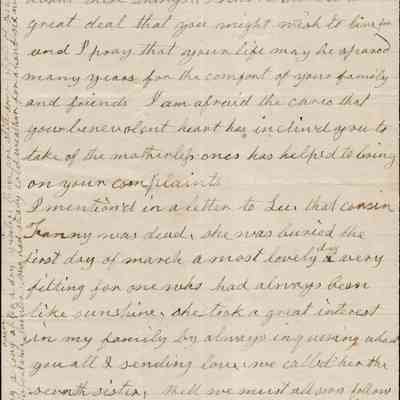 We know that the year the letter was written was after 12/01/1877 and before 11/30/1878 which is when Rebecca was 82 years old. We also know that it is in the Spring because of the reference to Valentine's Day and a cousin who was buried March 1st. This makes the year 1878 in the Spring.