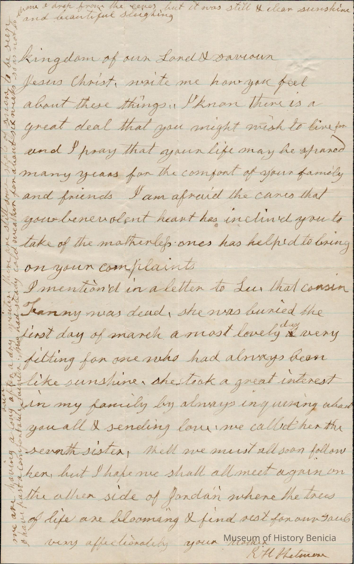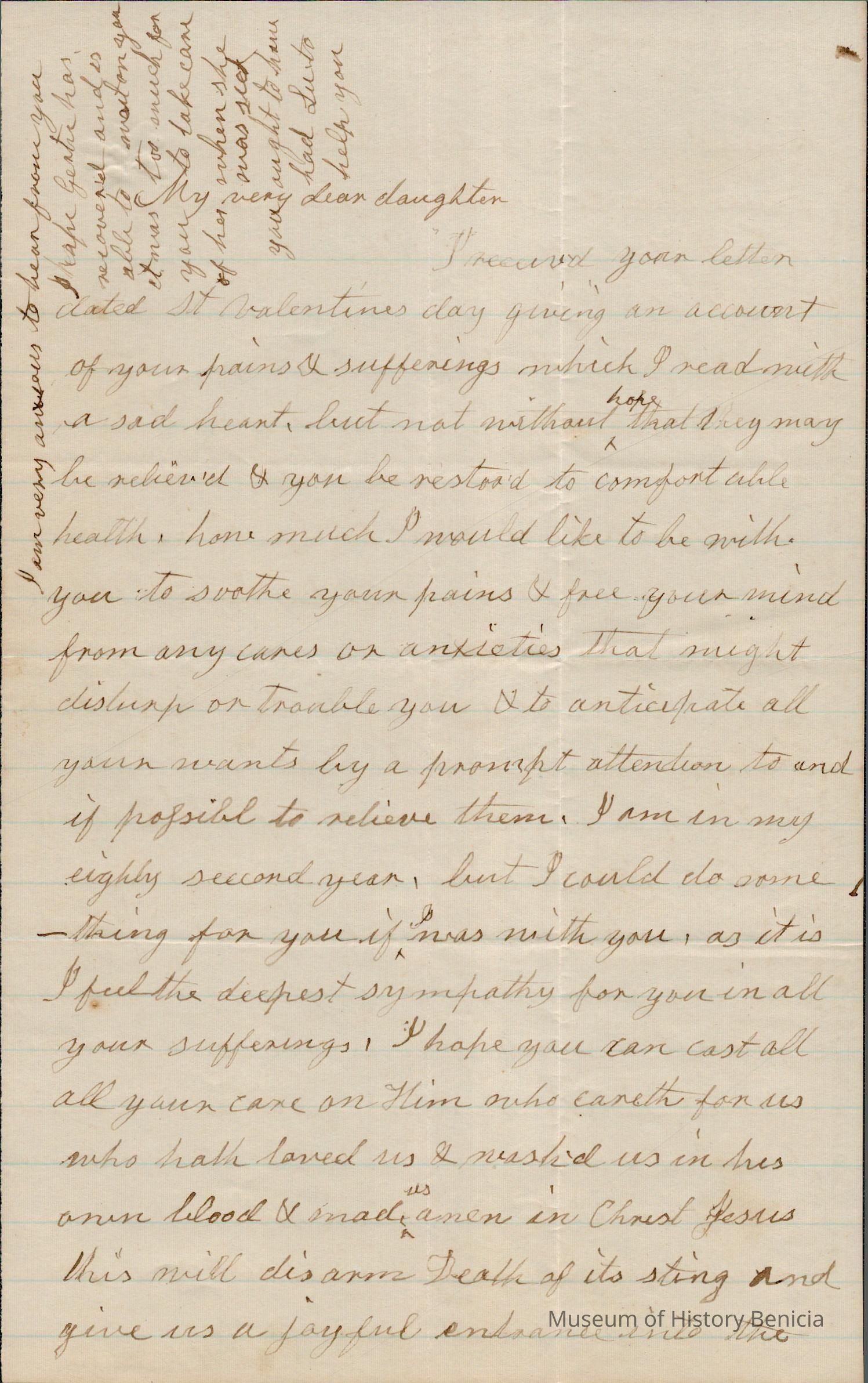 This is a letter with an unknown date from Mother Rebecca Hubbard Wetmore to Lucy Gray in Benicia. The mother writes mainly about her daughter's and her own health. She sounds like she is preparing for her daughters death.