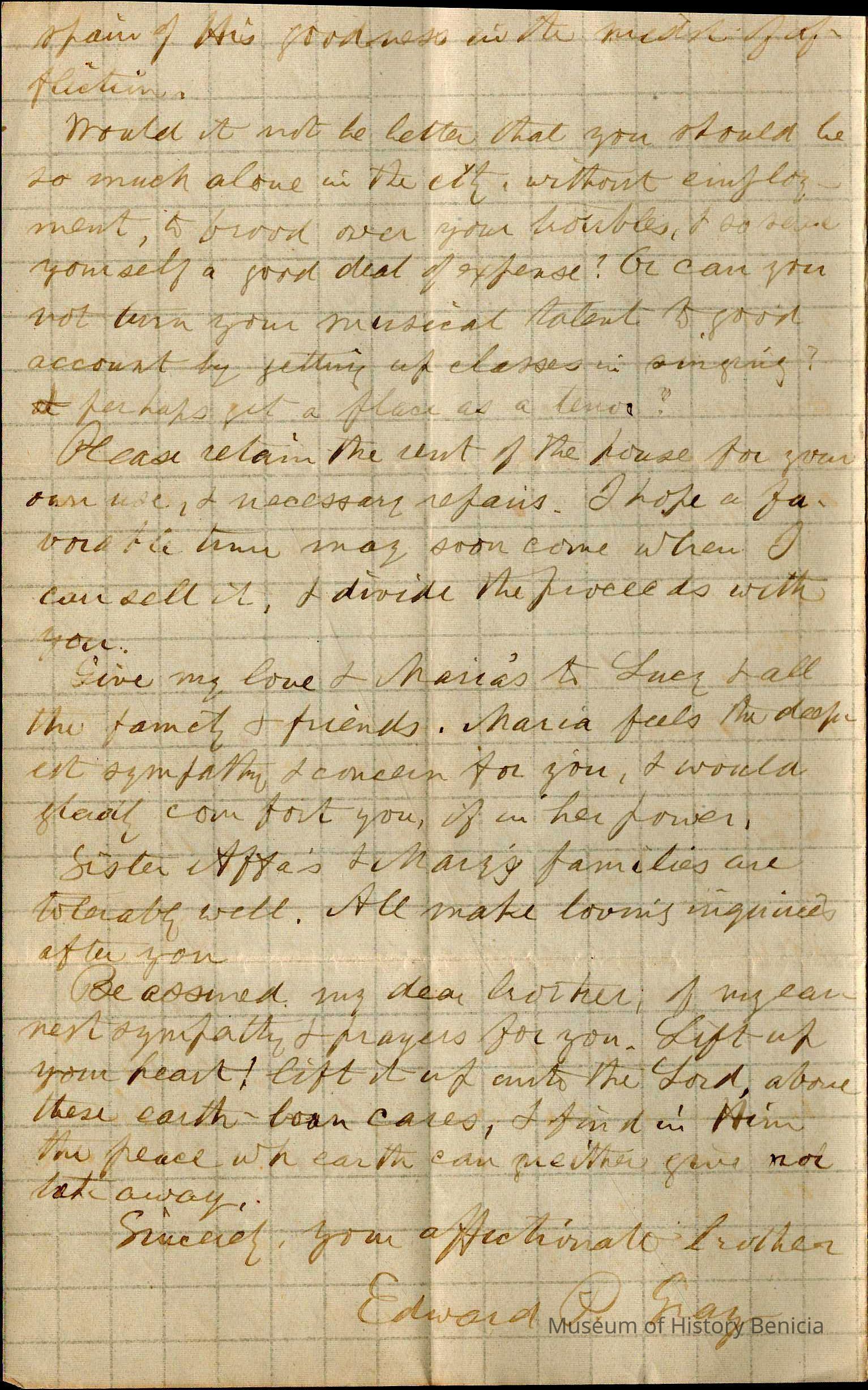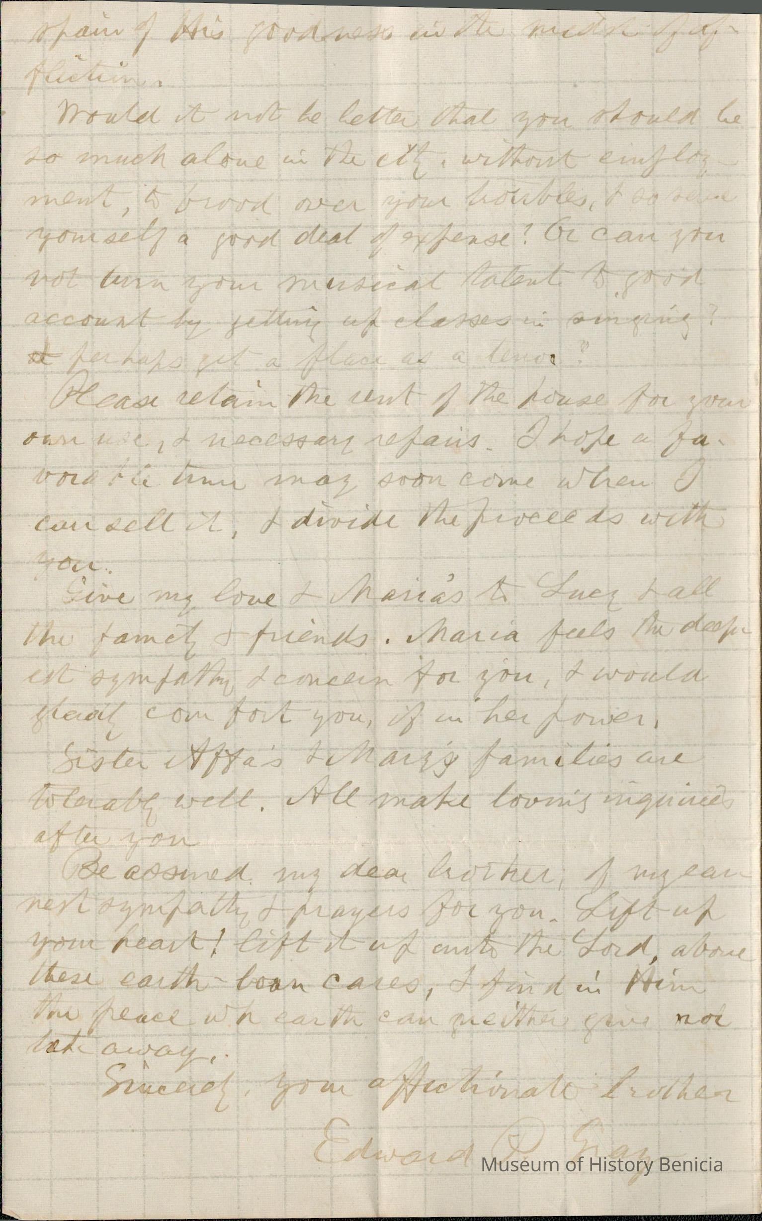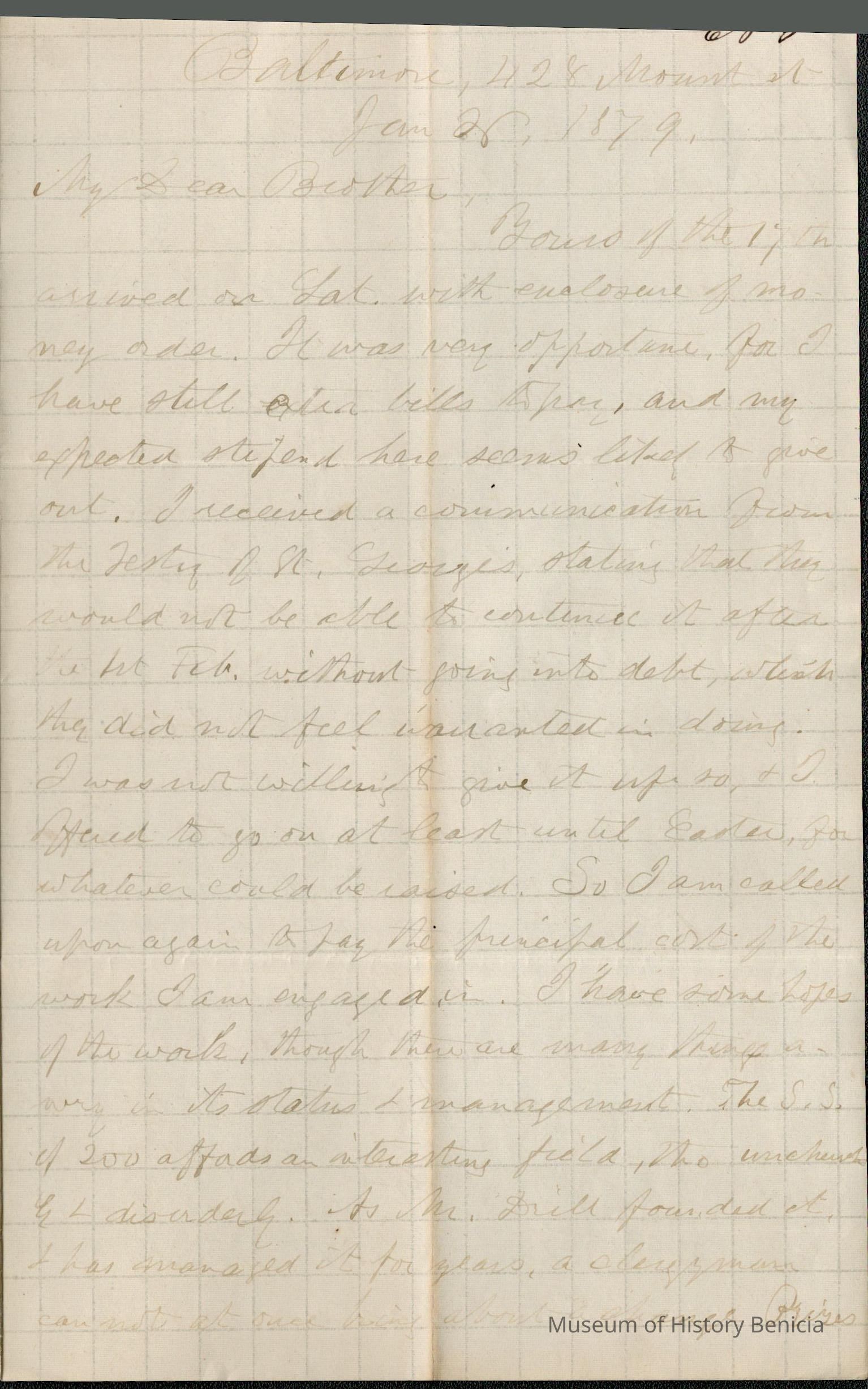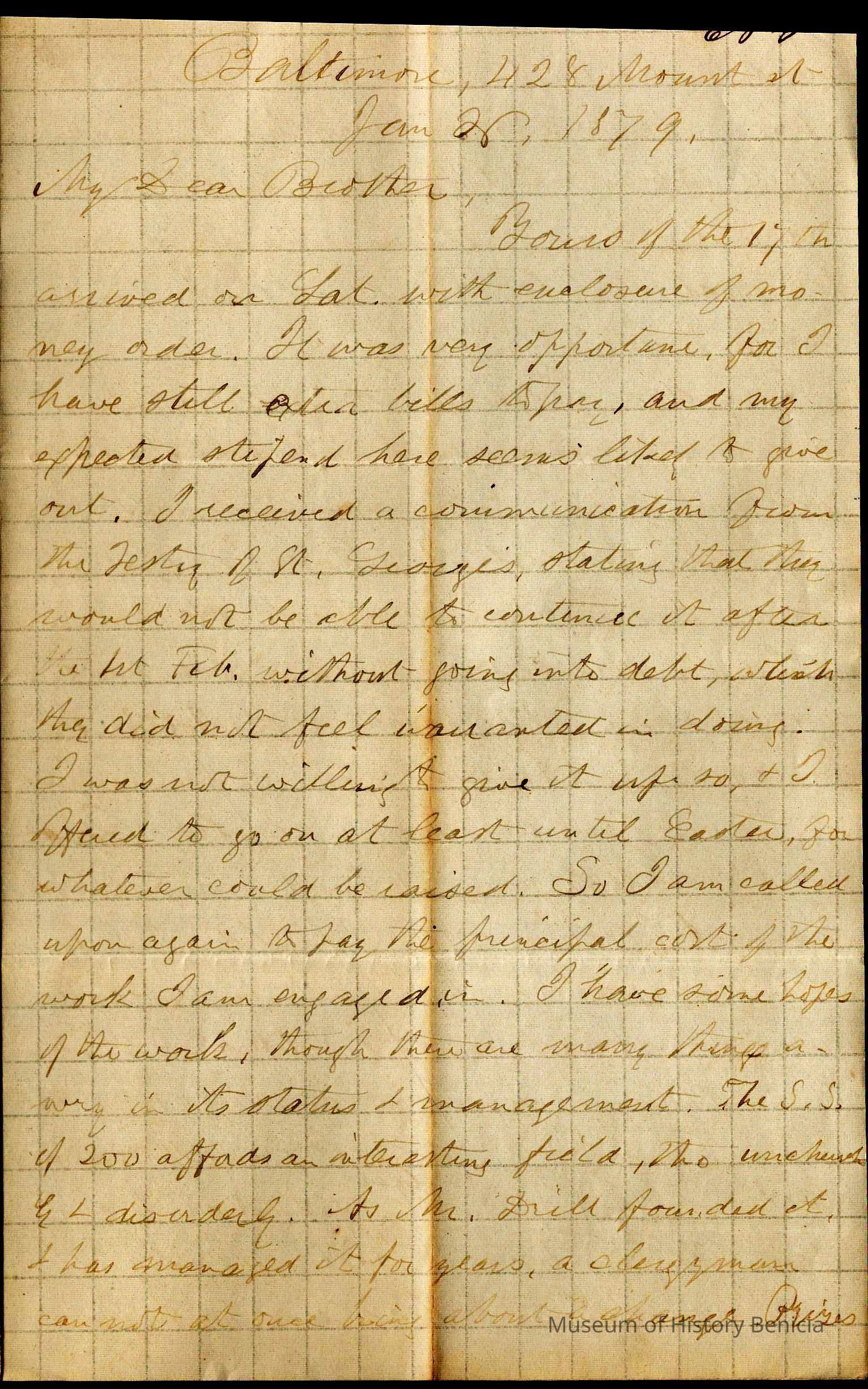 This is a letter dated 01/26/1879 from Mr. Edward Powers Gray to Mr. Samuel C. Gray regarding mainly financial matters. Edward tells of his loss of income from St. George's but he hopes he can find other sources of income. He then offers Samuel consolation for what seems to be his financial troubles and even says Samuel may keep the rent derived from Edward's house in Benicia.