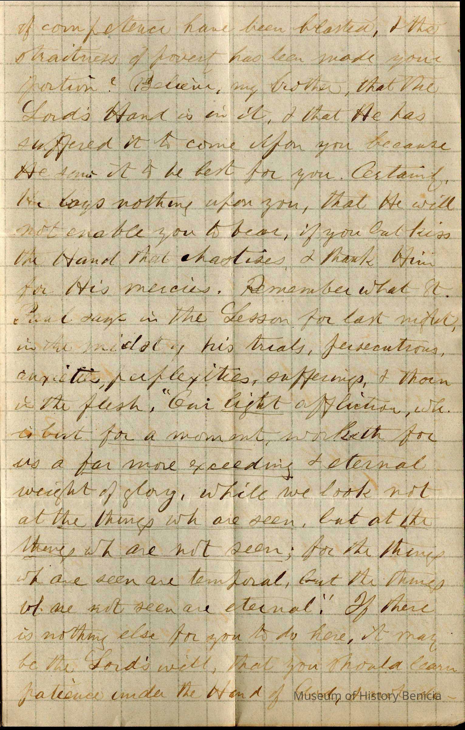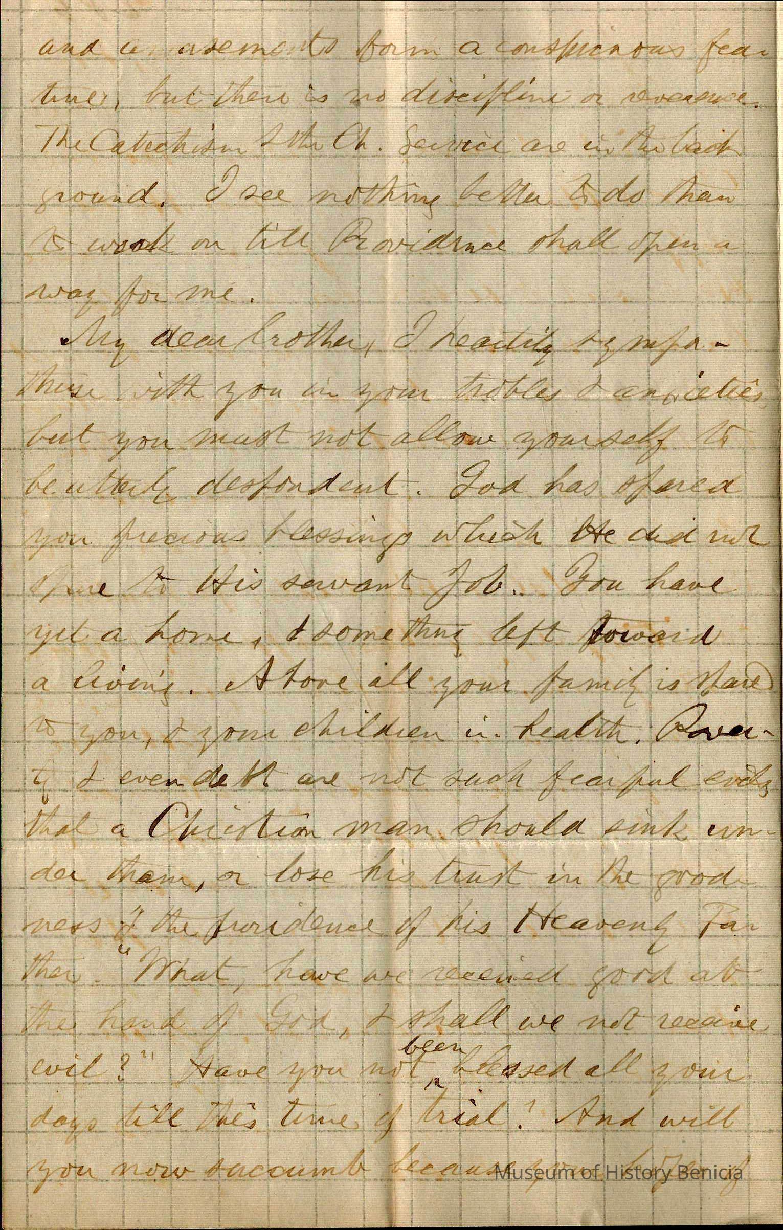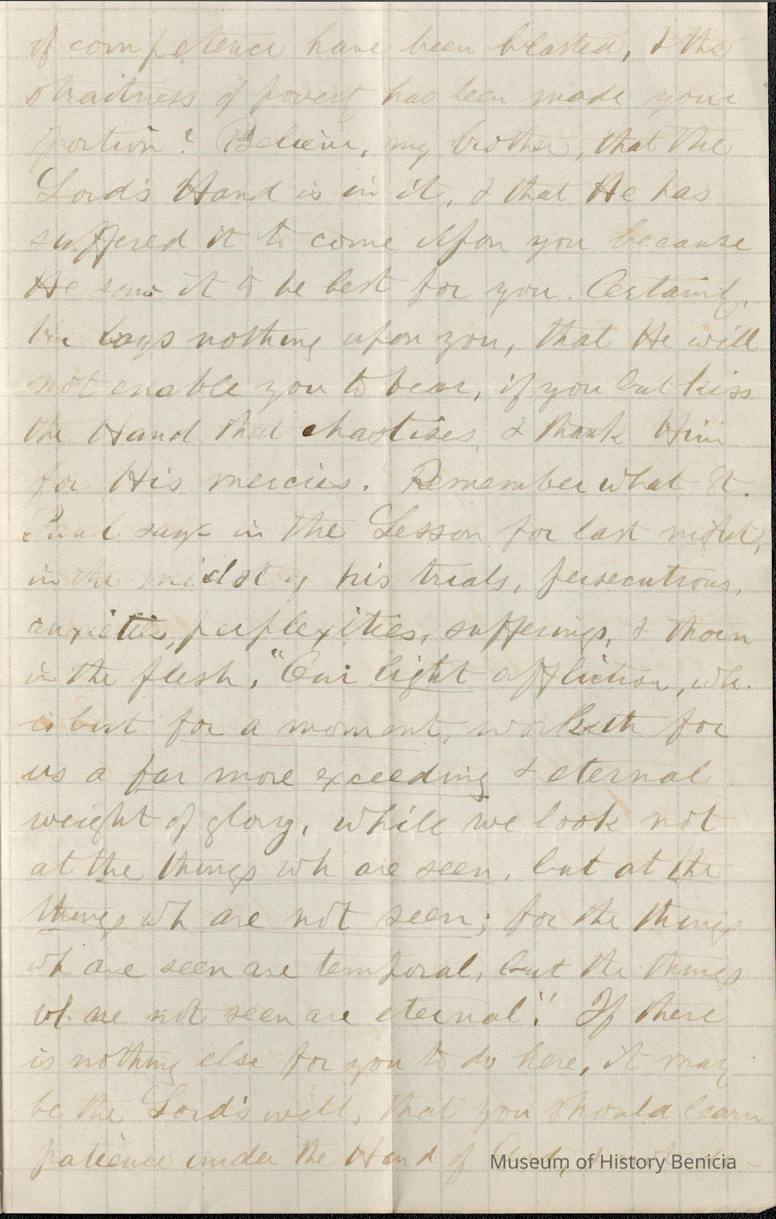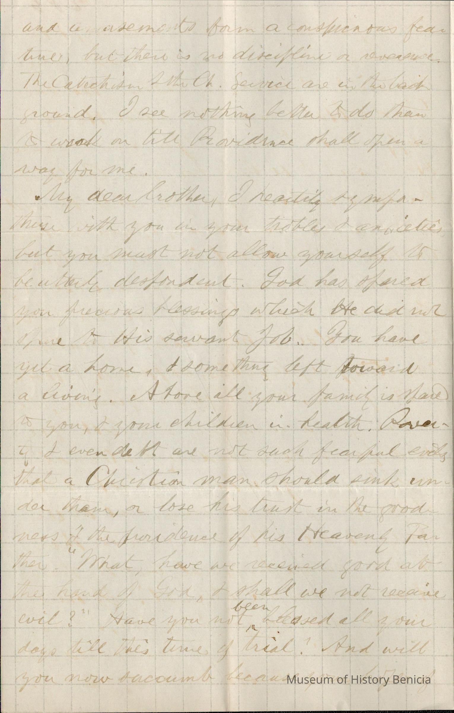 This is a letter dated 01/26/1879 from Mr. Edward Powers Gray to Mr. Samuel C. Gray regarding mainly financial matters. Edward tells of his loss of income from St. George's but he hopes he can find other sources of income. He then offers Samuel consolation for what seems to be his financial troubles and even says Samuel may keep the rent derived from Edward's house in Benicia.