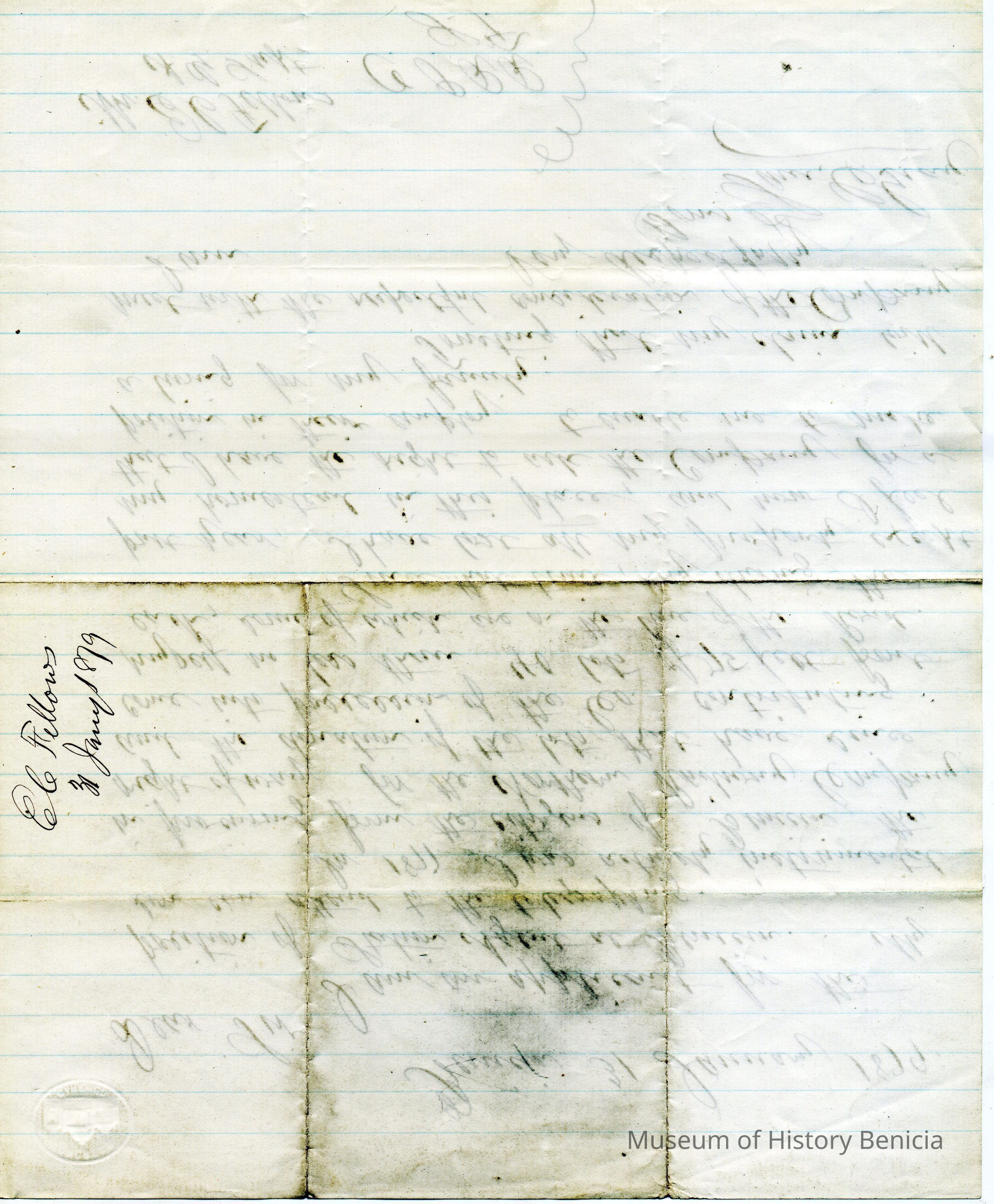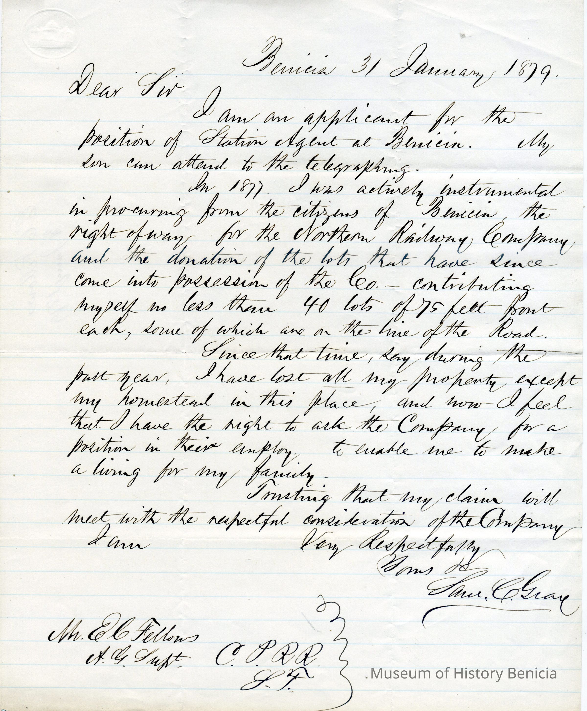 This is a letter from Samuel C Gray to Mr. Fellows of the Central Pacific Railroad dated 01/31/1879. Mr. Gray is asking for the job of Station Agent in Benicia. He reminds Mr. Fellows of what he has done in the past to get the railroad started in Benicia. He also says that his son can run the telegraph if he is given the job.Collection