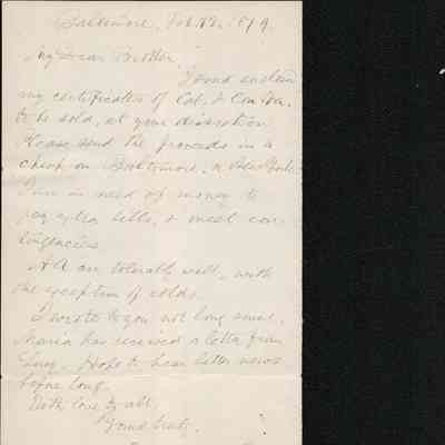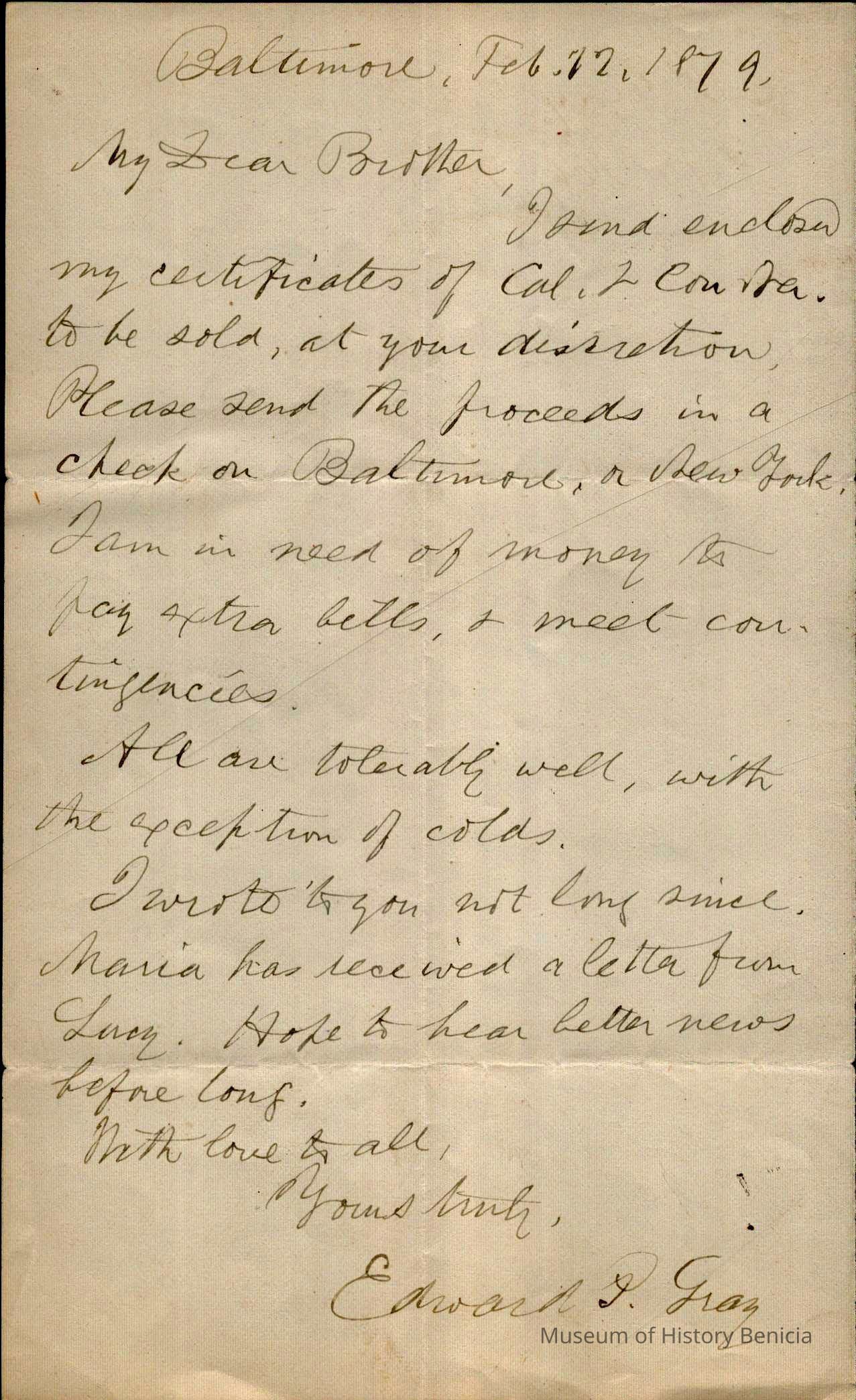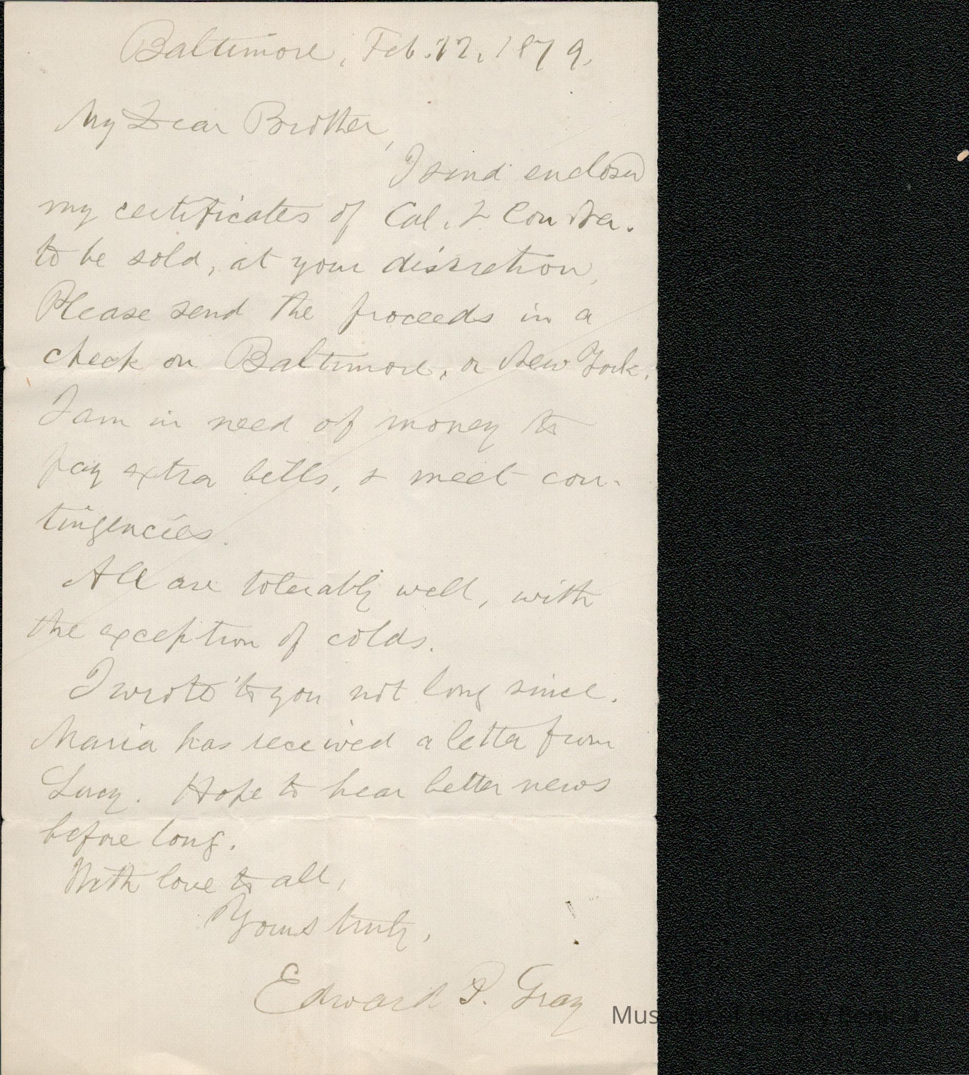 This is a letter dated 02/12/1879 from Mr. Edward Powers Gray to Mr. Samuel C. Gray regarding selling some stocks that he owns. He also mentions that his wife, Maria (1834 - 1919) has received a letter from Samuel's wife, Lucy (1820 - 07/02/1879).
