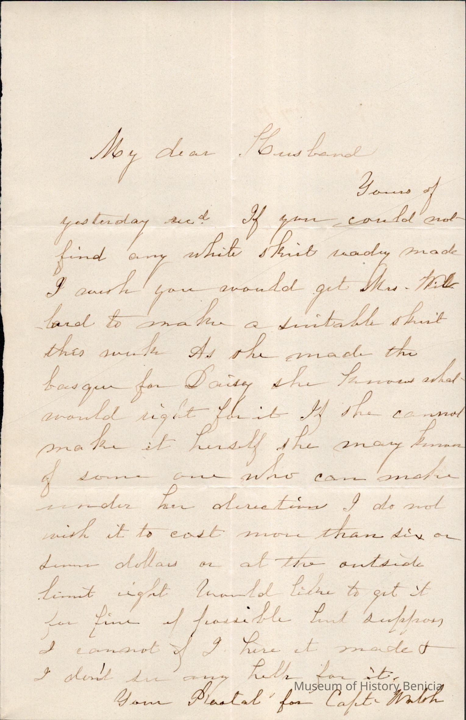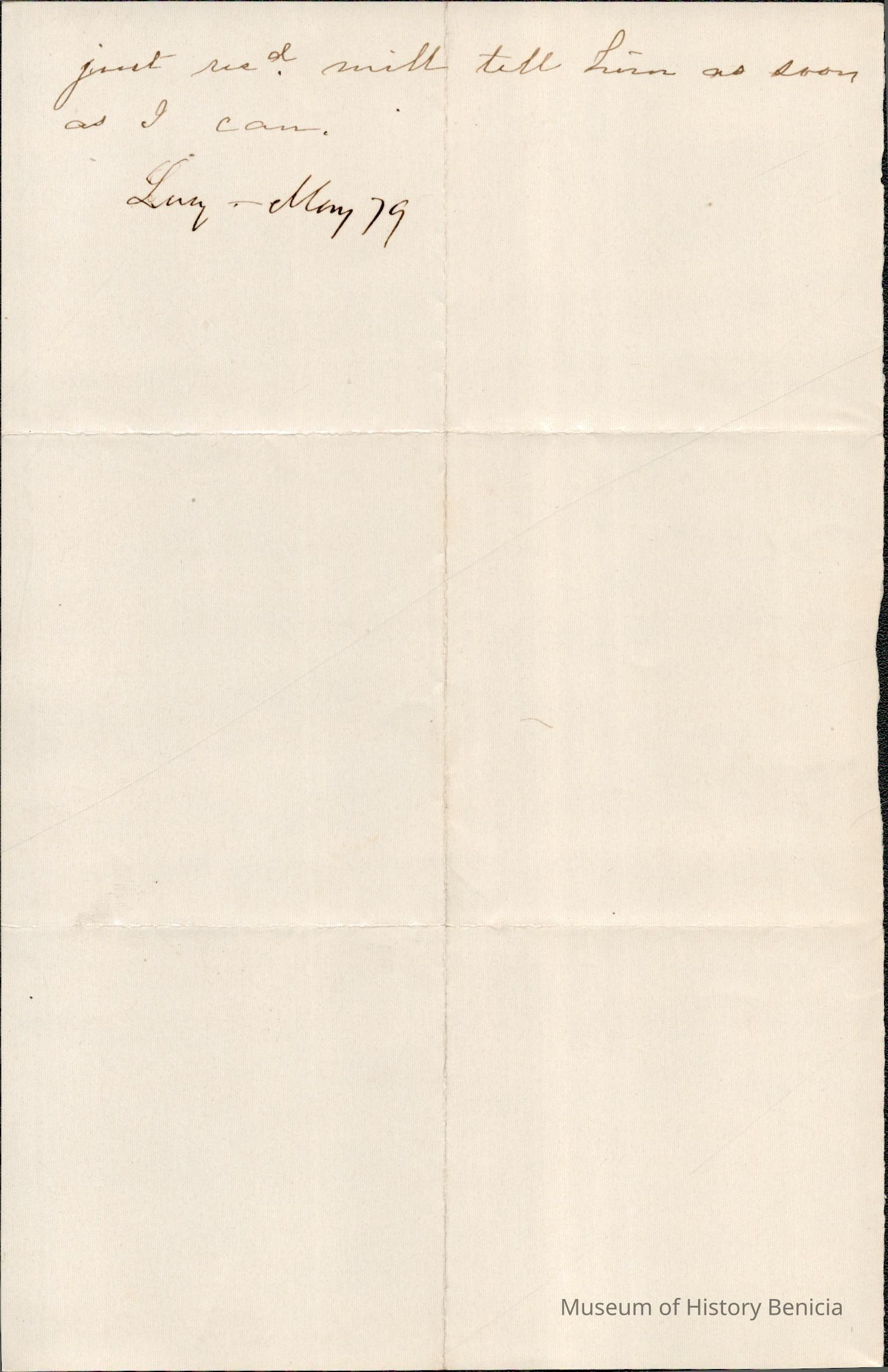 This is a letter from Lucy Wetmore Gray in Benicia, to Samuel Gray when he was in San Francisco. The letter does not have the year shown.