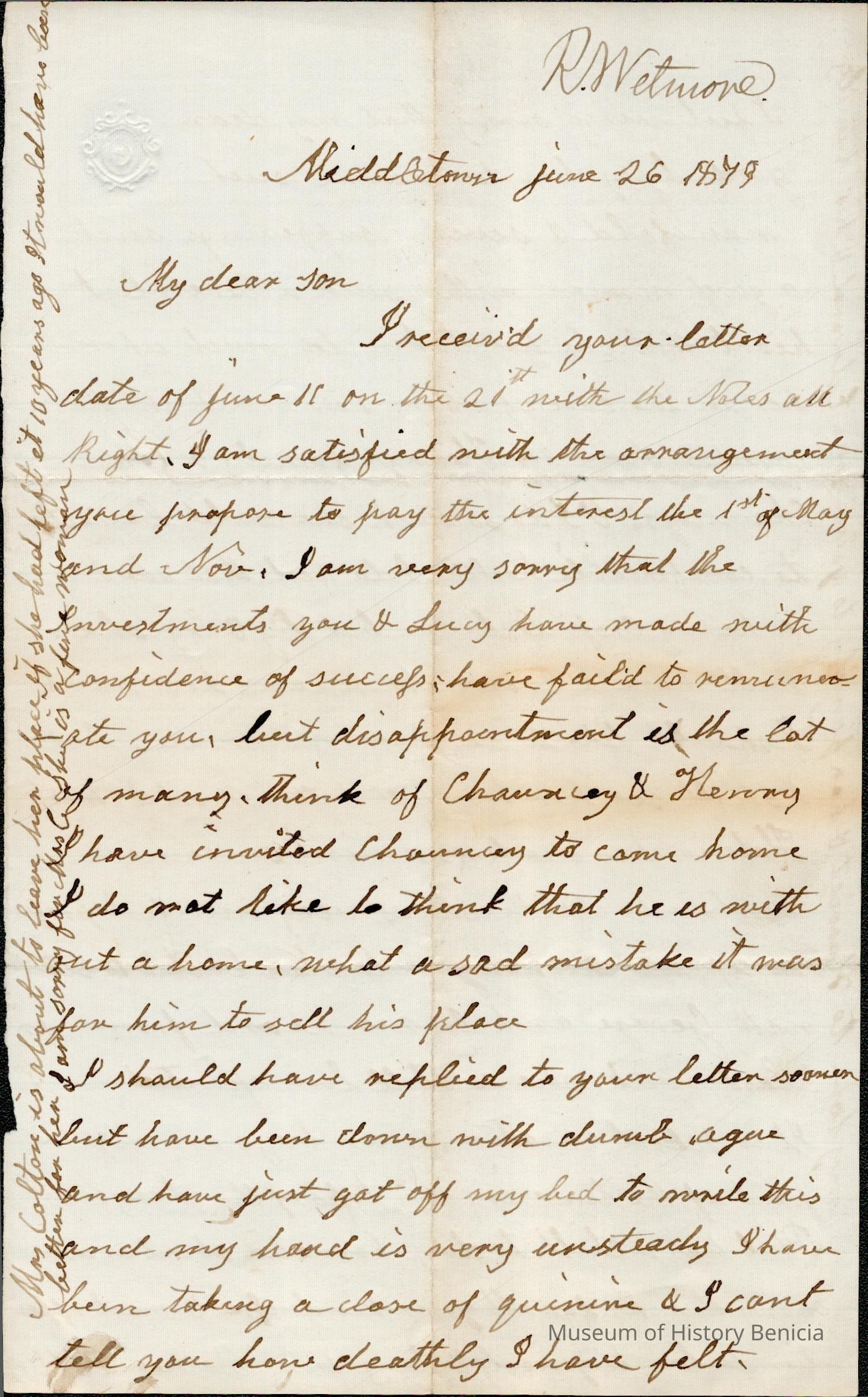This is a letter dated 06/26/1879 from Mother Rebecca Hubbard Wetmore to Samuel C Gray in Benicia. She agrees to Samuel paying the interest twice a year on May 1st and November 1st. She assures him that he is not alone in not succeeding and mentions her sons in California, Chauncey and Henry Wetmore. She closes by praising her daughter Lucy (Samuel's wife) and wishing she wasn't suffering so much. (Lucy Wetmore Gray was born in 1820 and died 07/02/1879.)