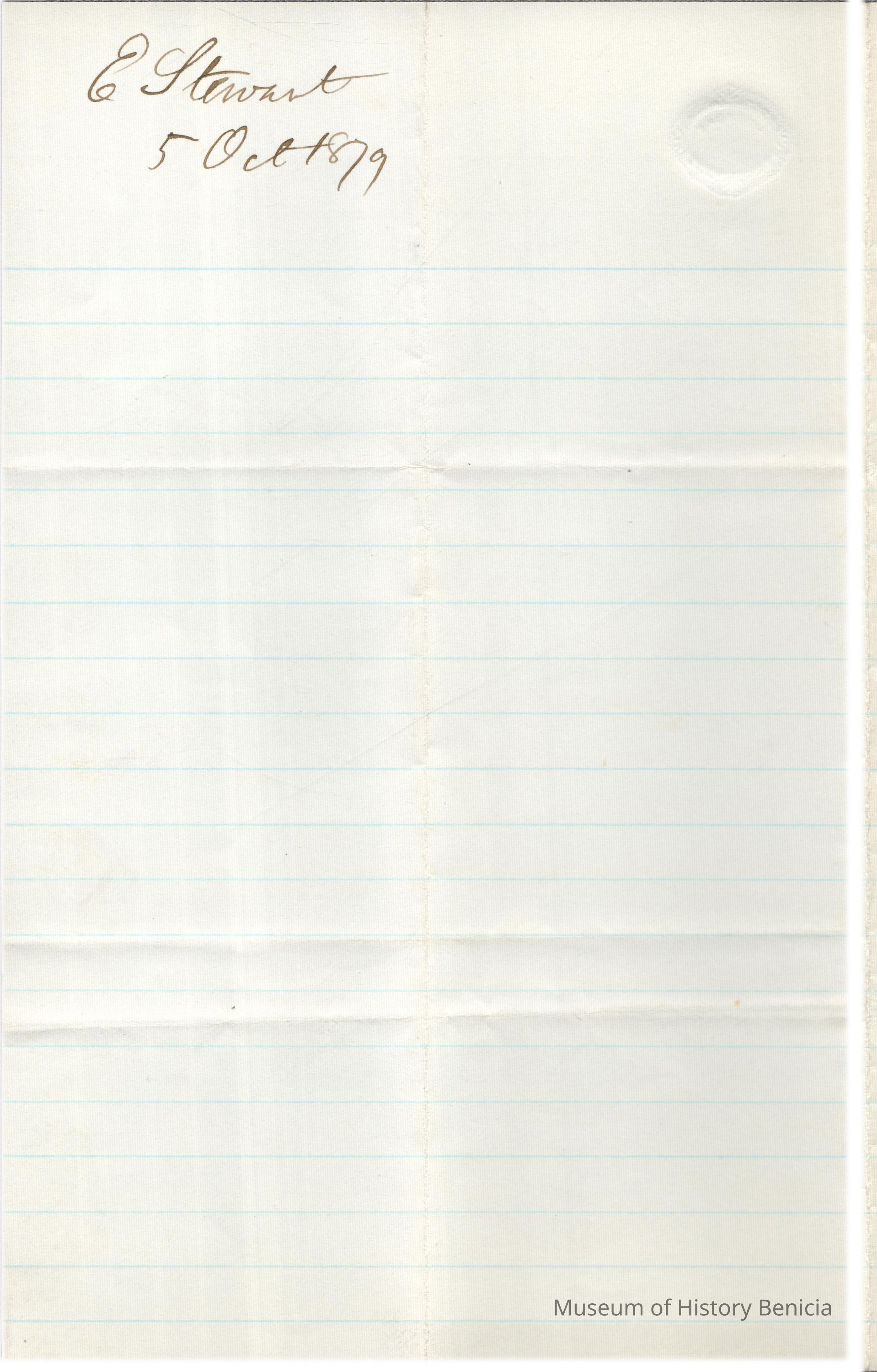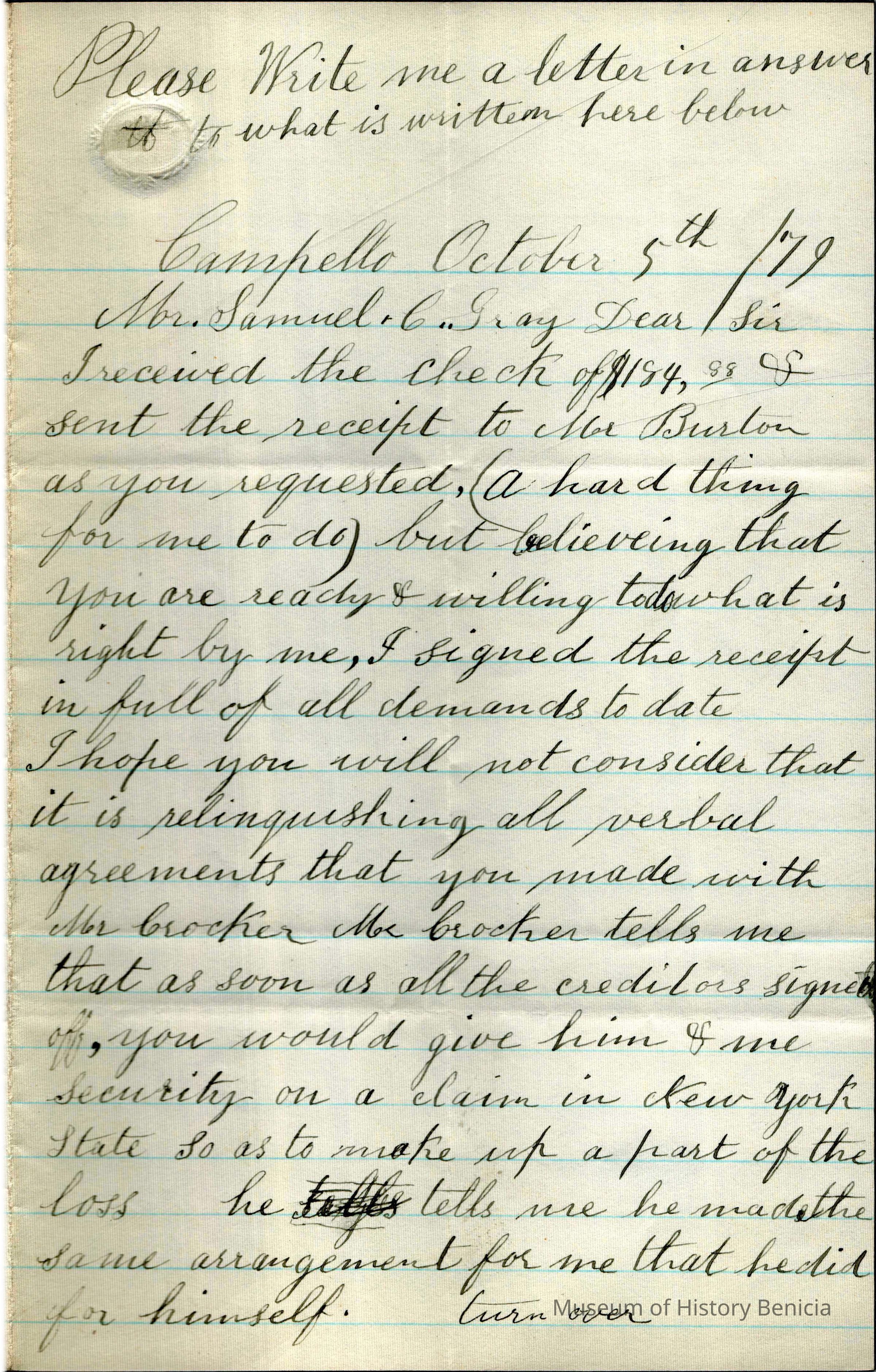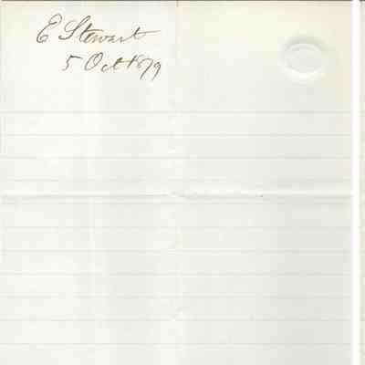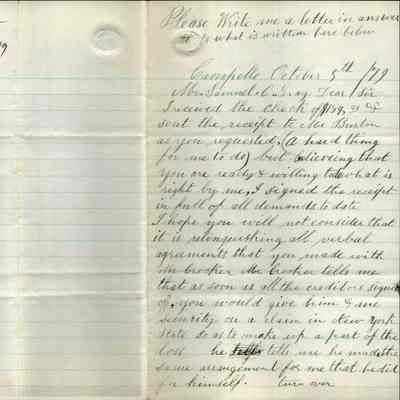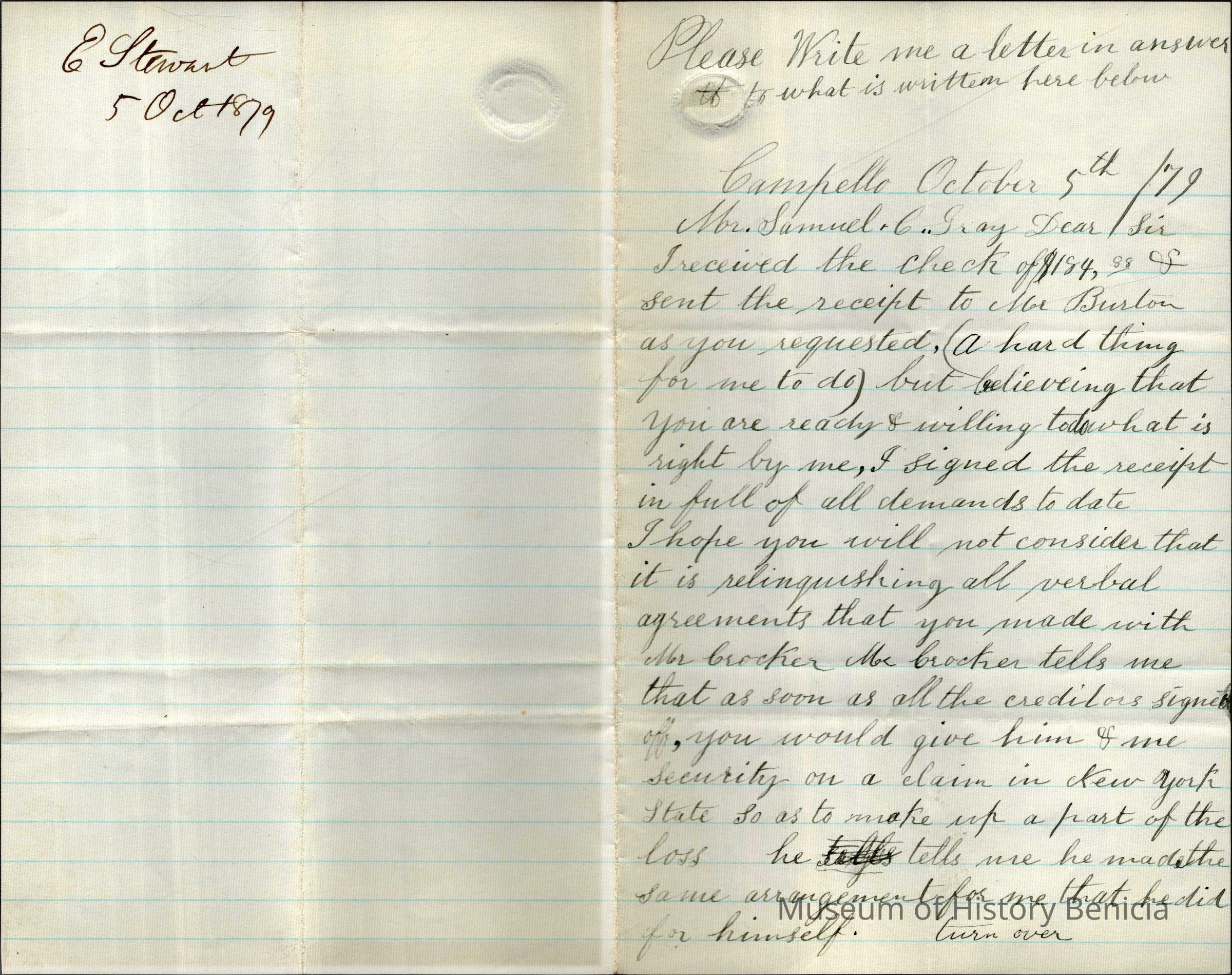 This is a letter from E. Stewart in Campello (probably Campello, Brocton, Plymouth, Mass.) to Samuel C Gray dated 10/05/1879. Mr. Stewart references a deal he has signed off on with Mr. Brocton and the fact the Samuel Gray agreed top make up for his loss on that deal with an interest in property in New York.